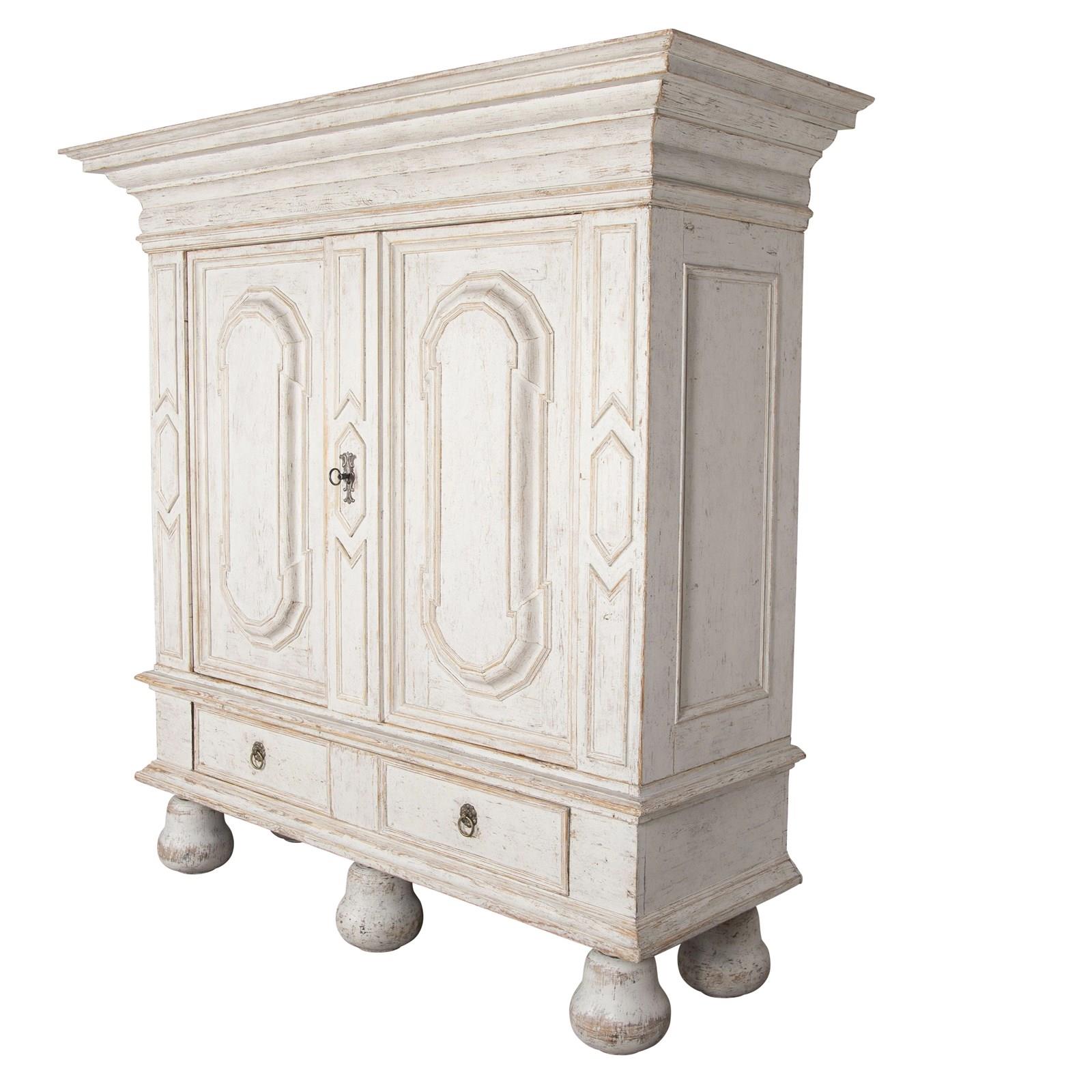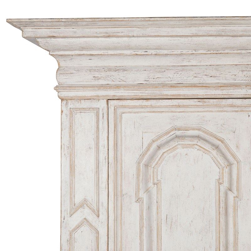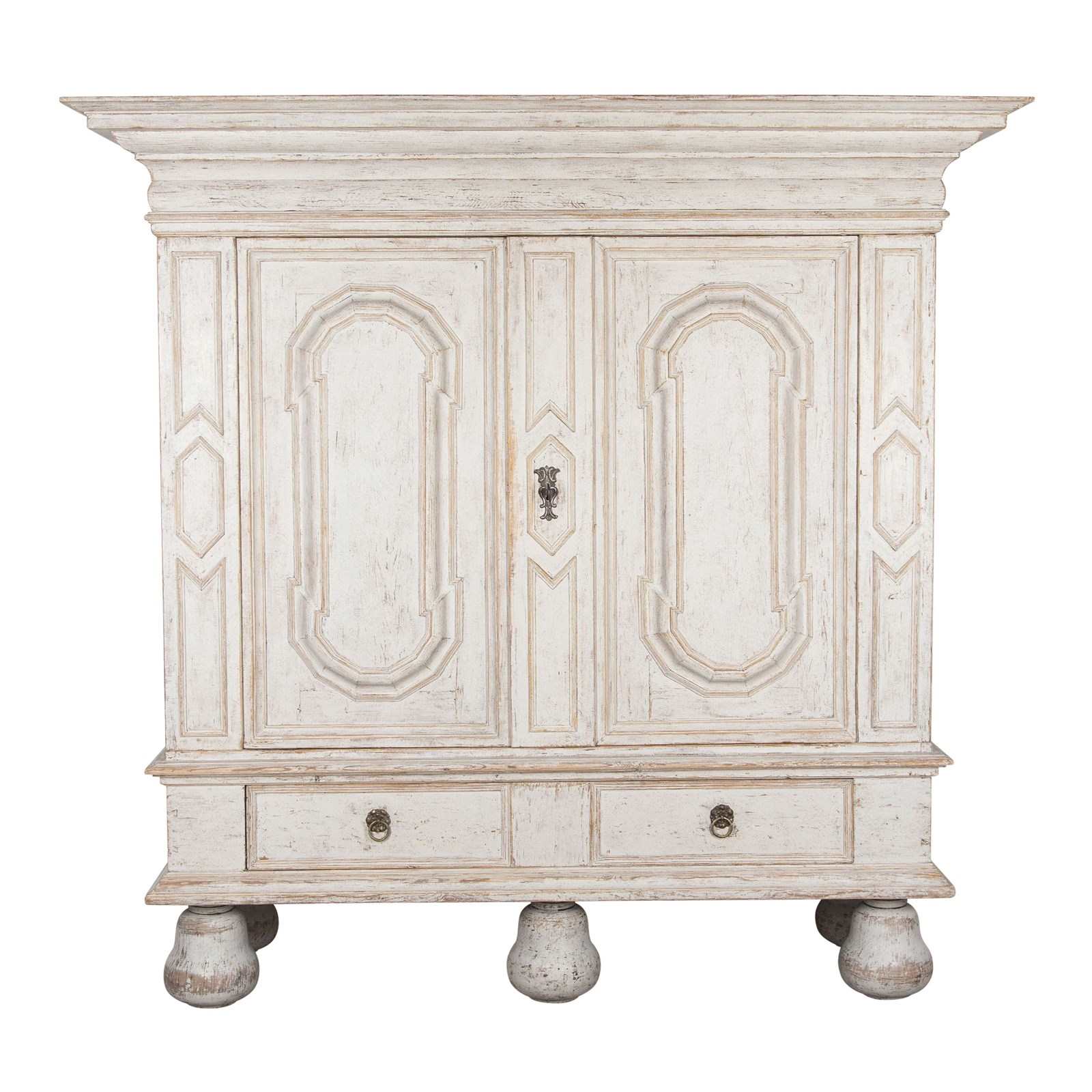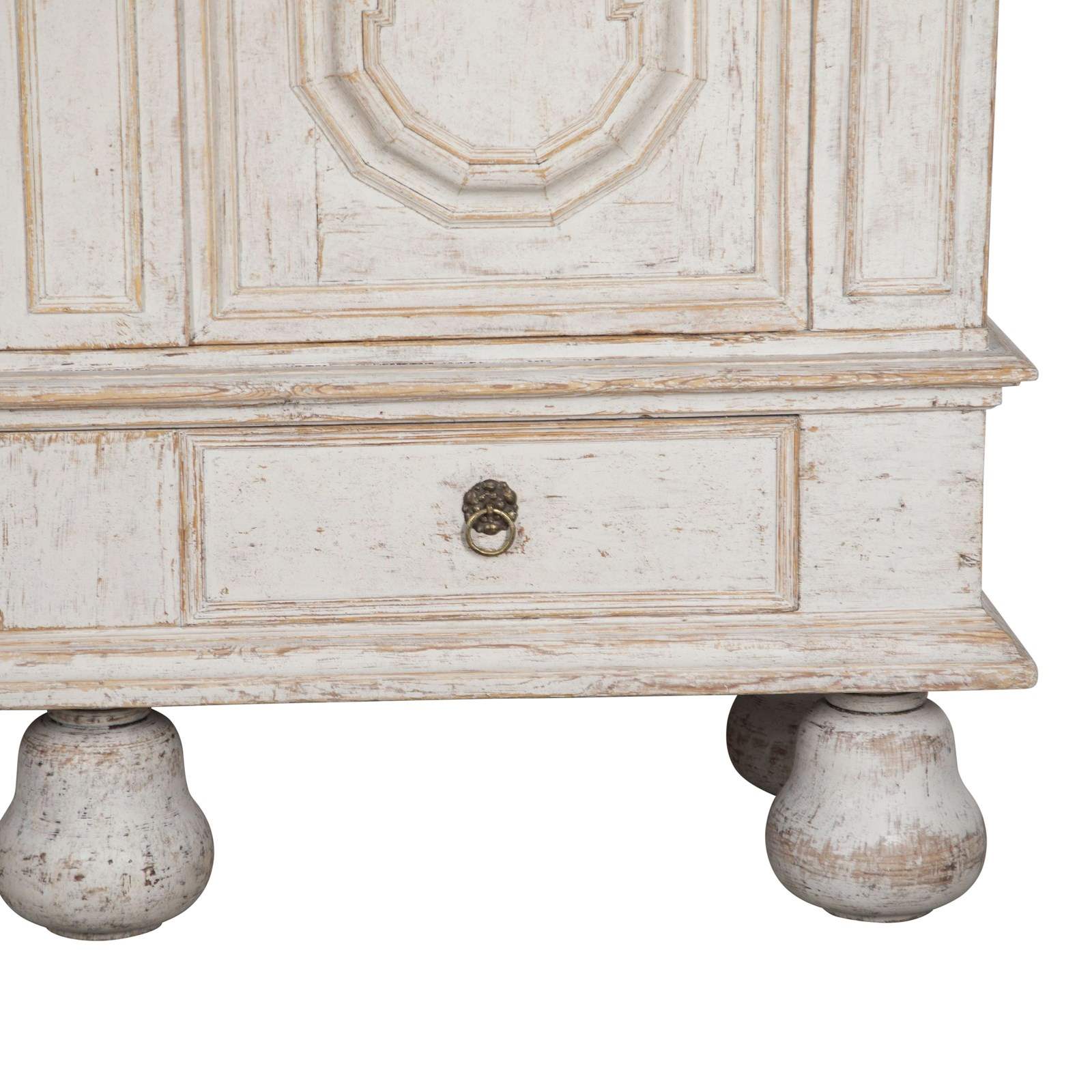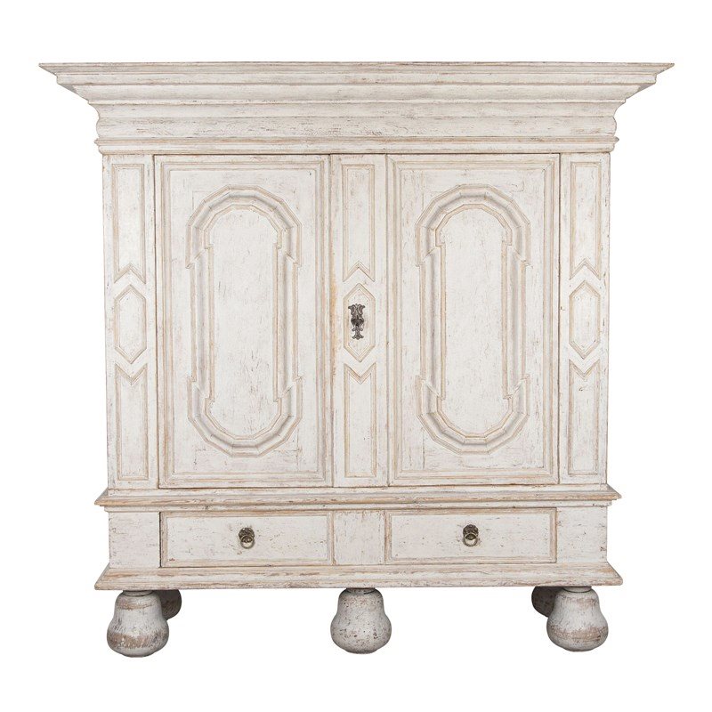 With a deeply carved pediment and decorative detailing on the doors. Below sit two drawers with their original loose pear-shaped feet.