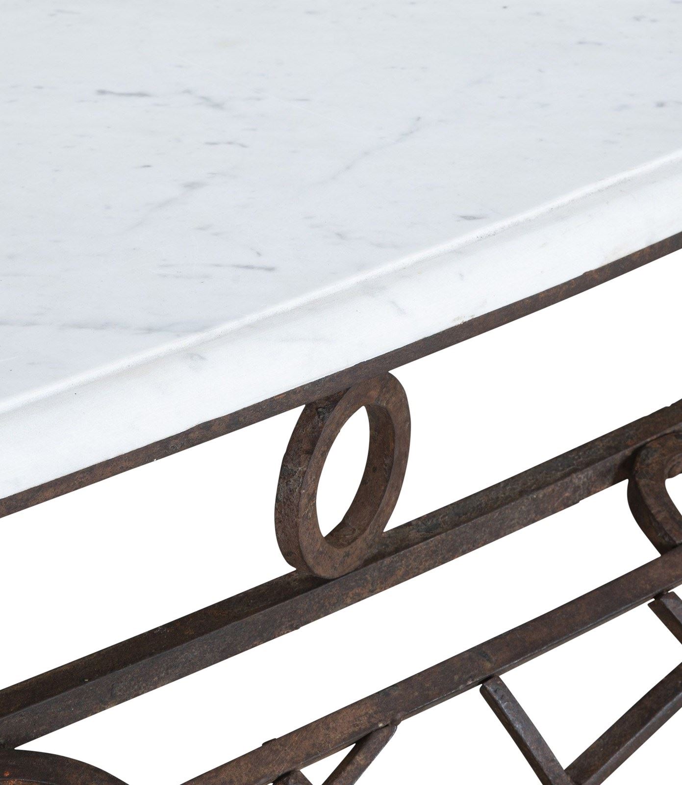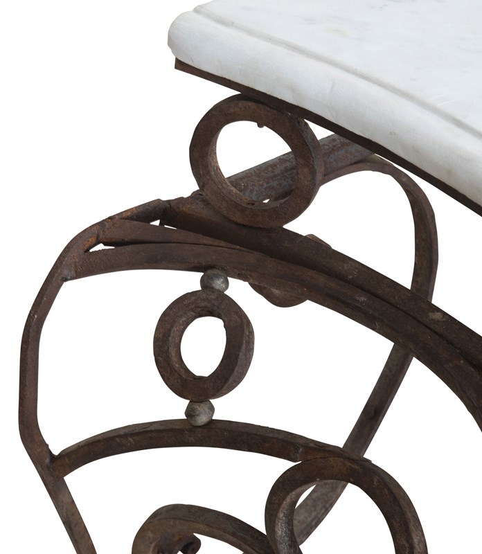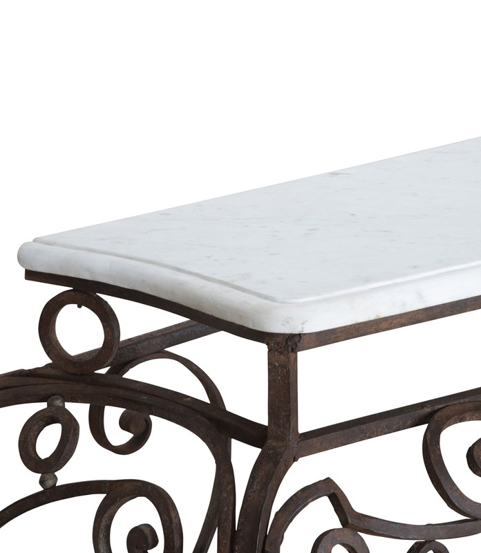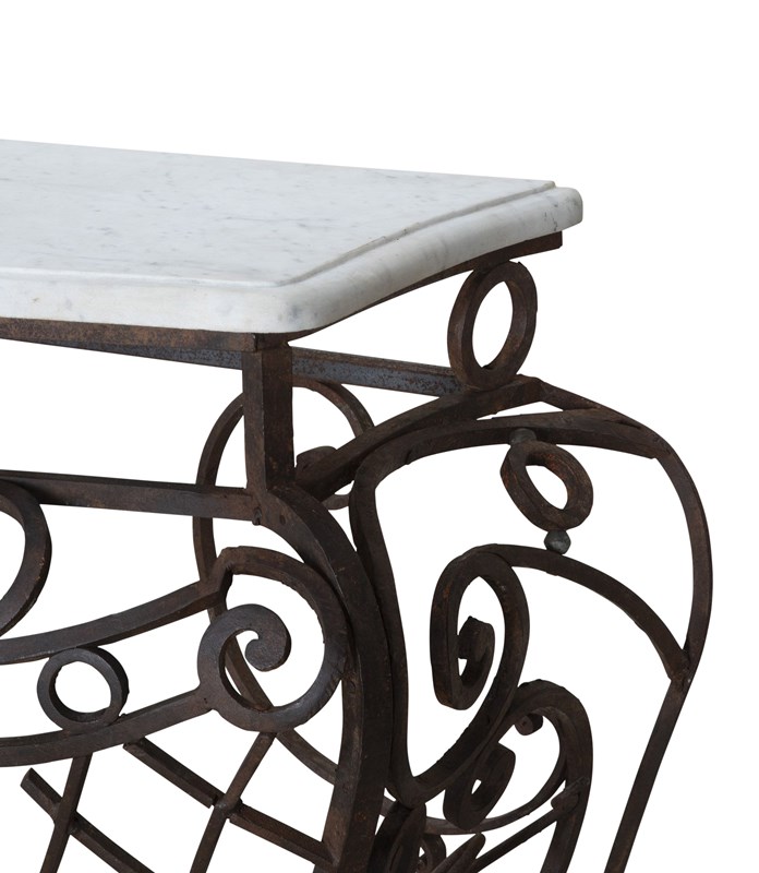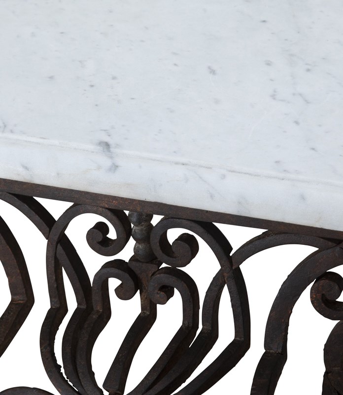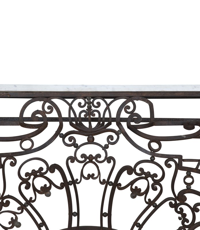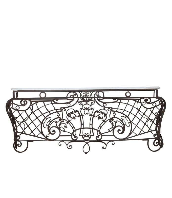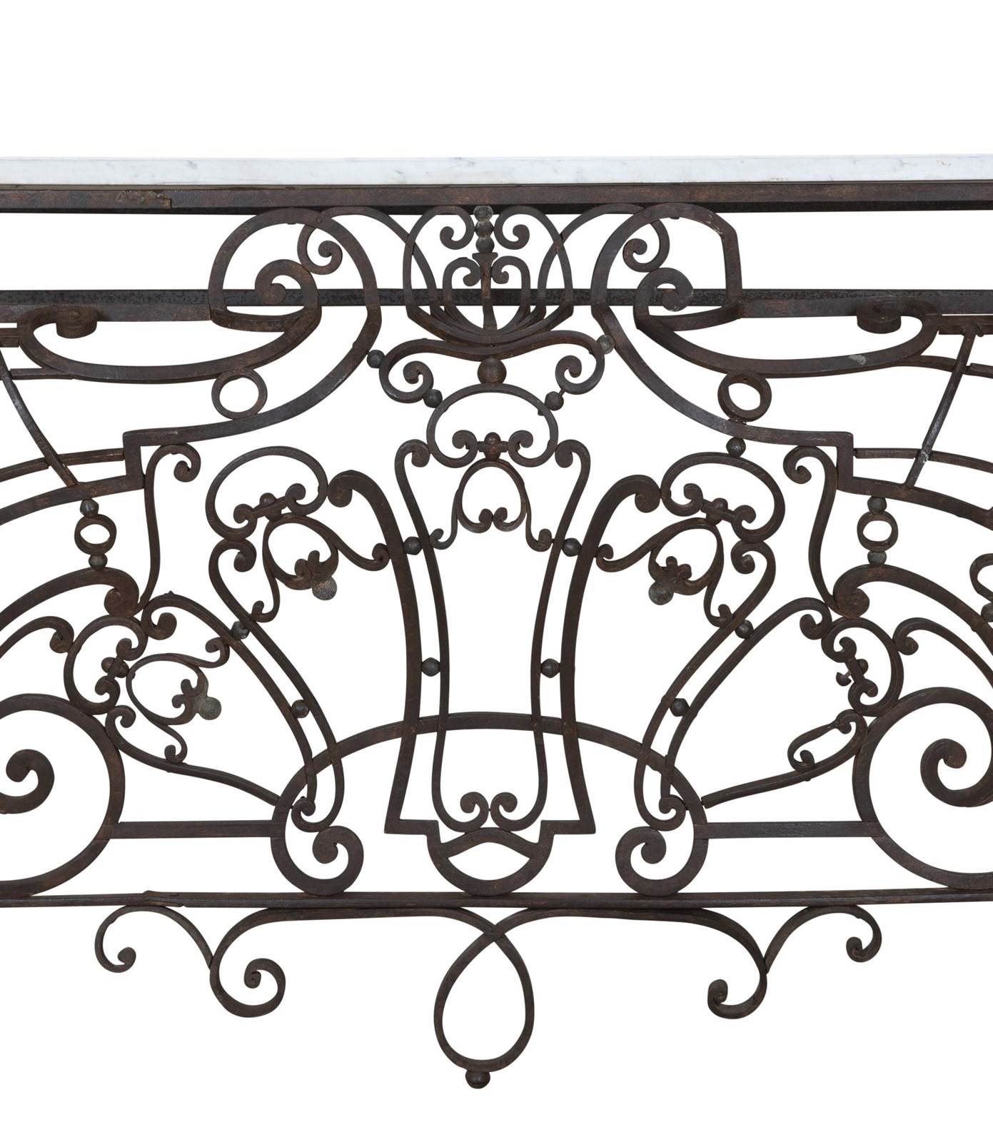 Exceptional large late 18th Century balcony console in hand forged iron work and marble top.
