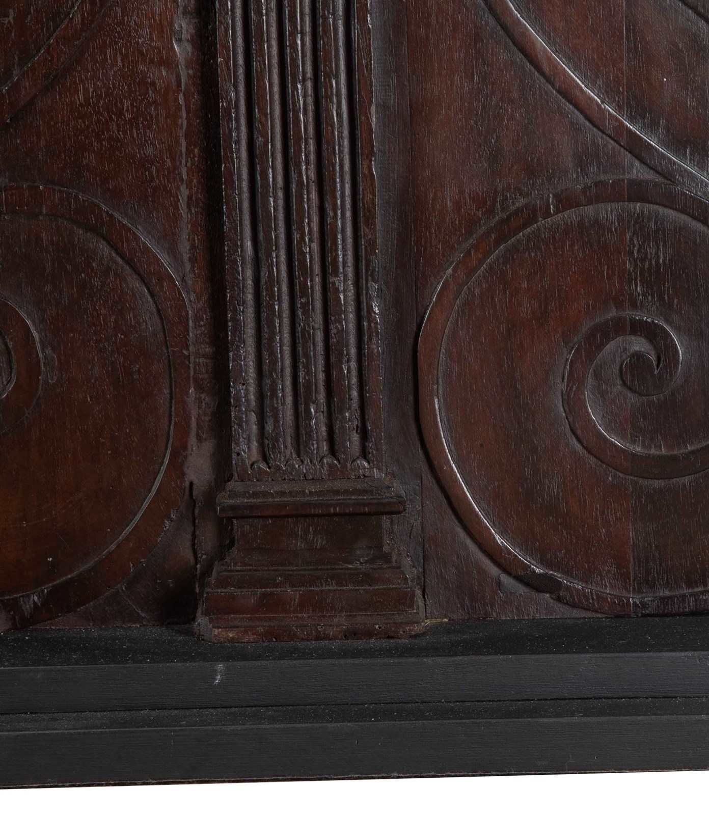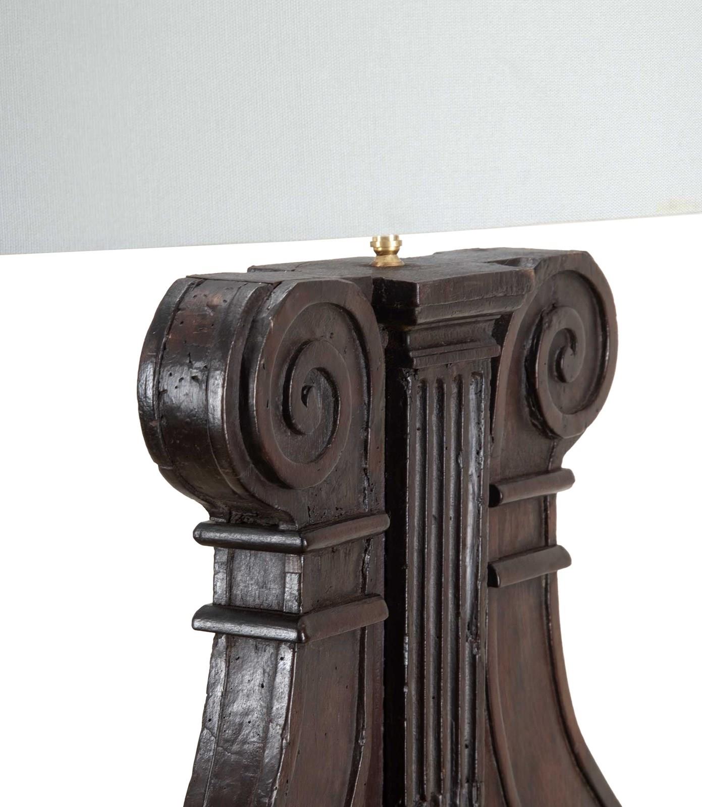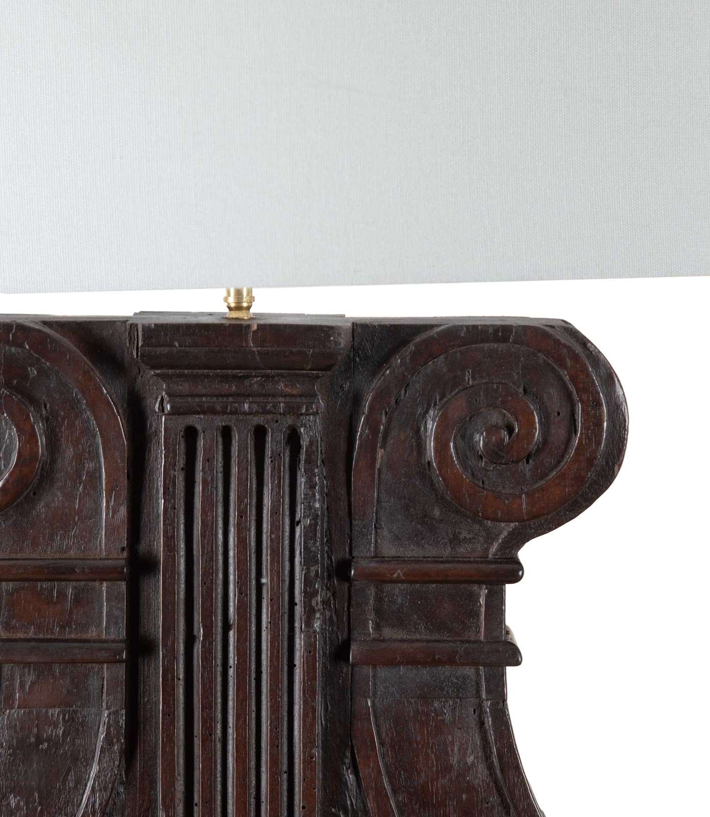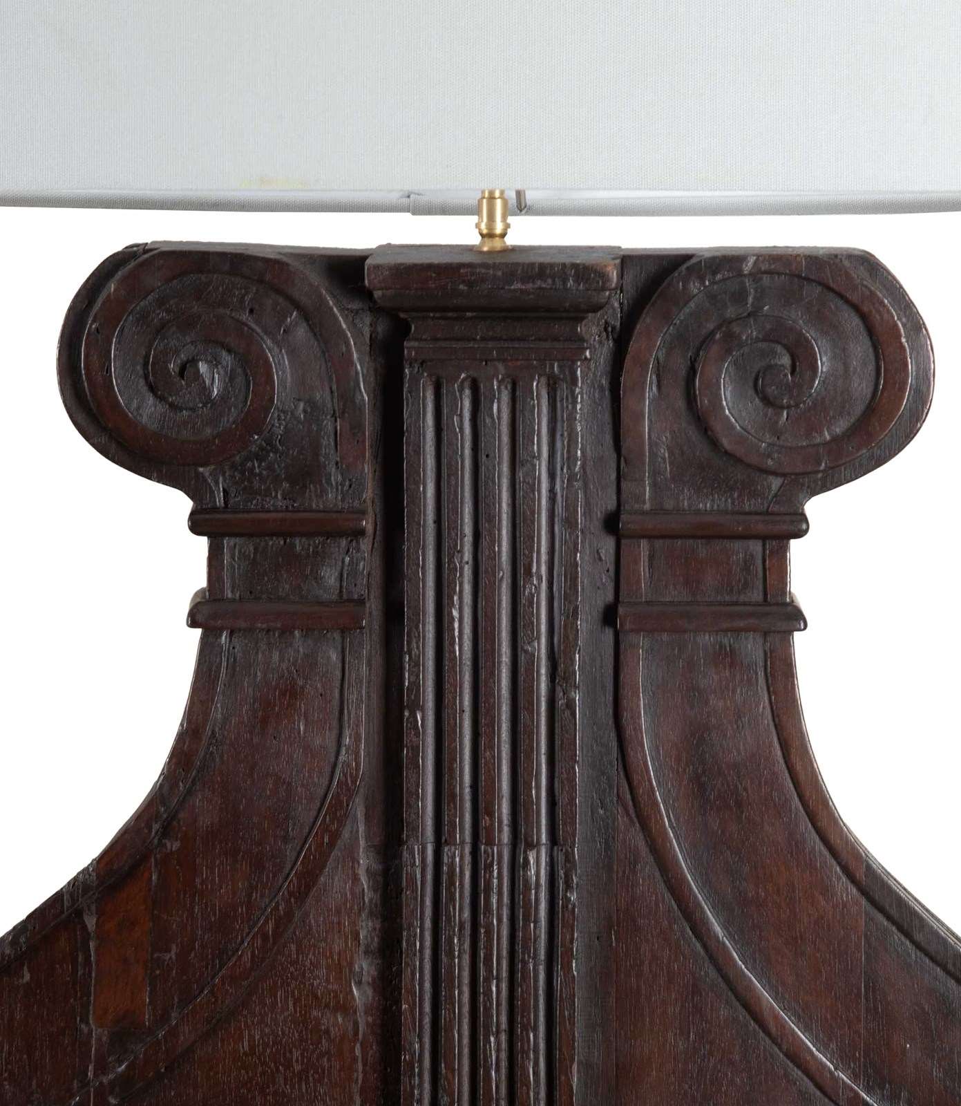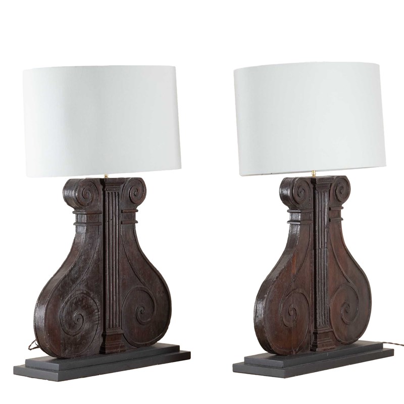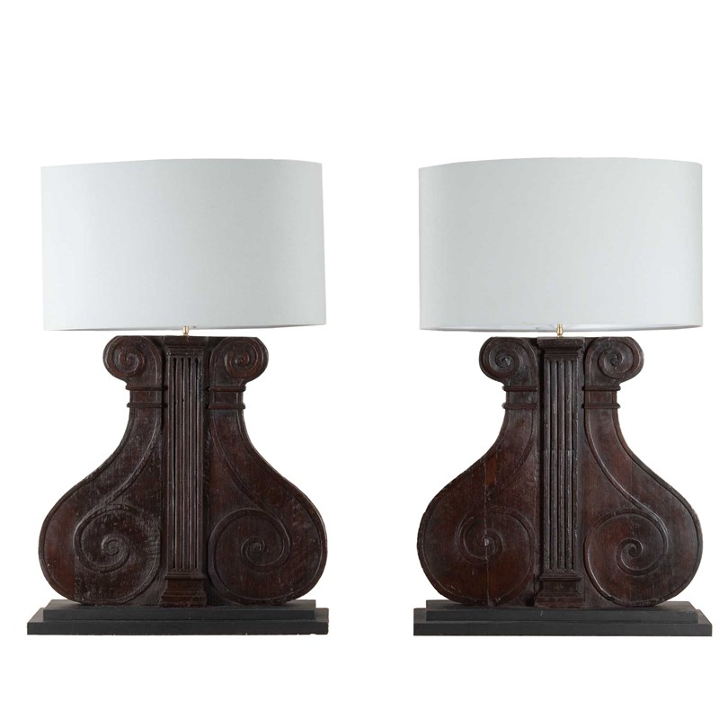 Large pair of 19th Century Italian carved wooden lamps made from architectural walnut fragments.