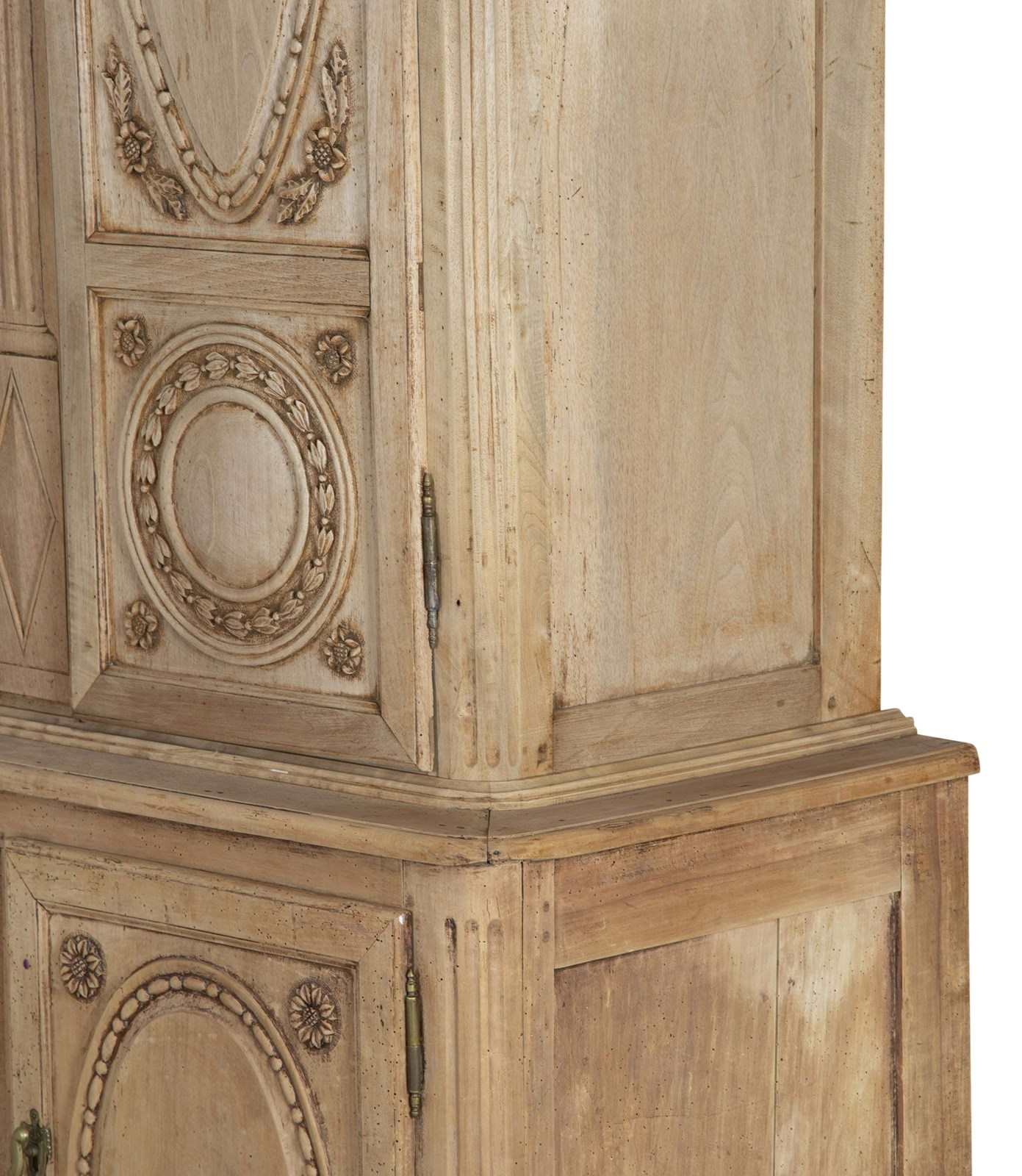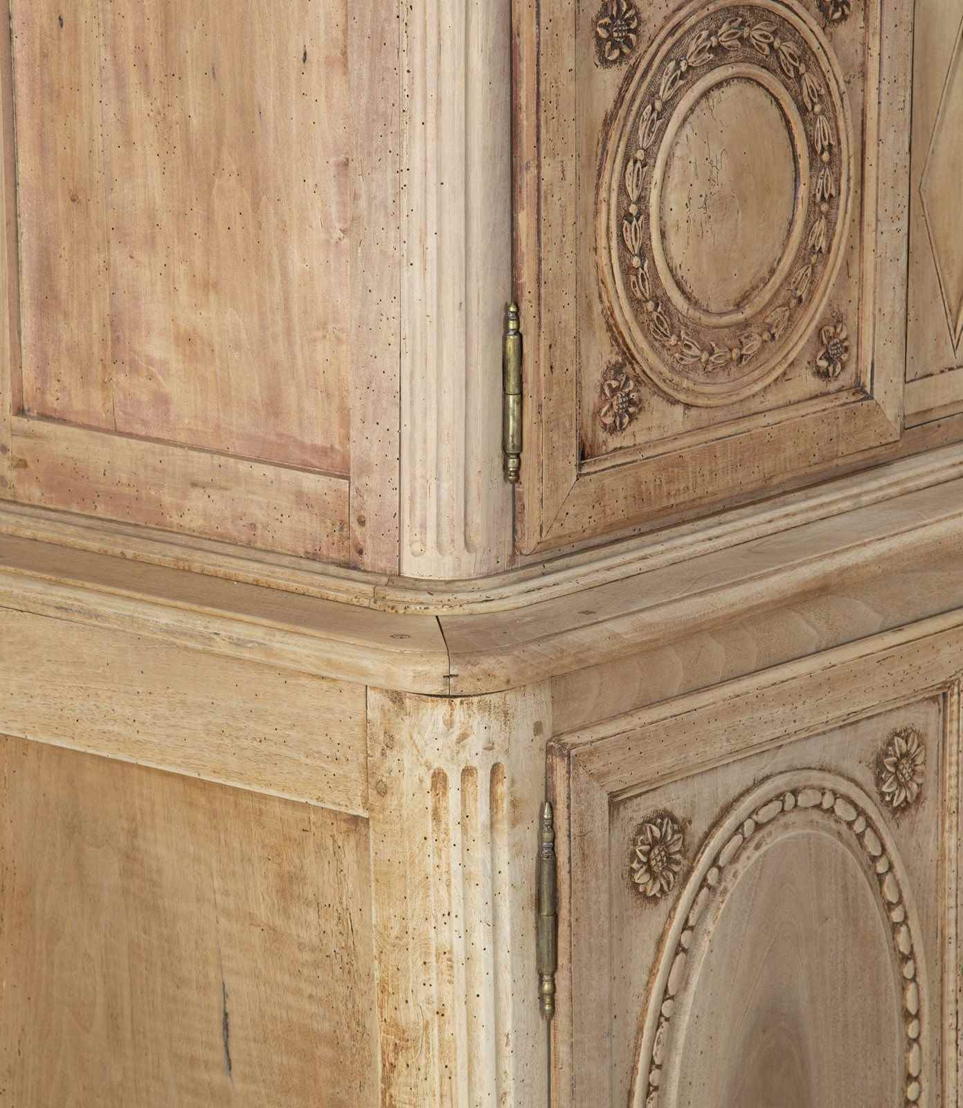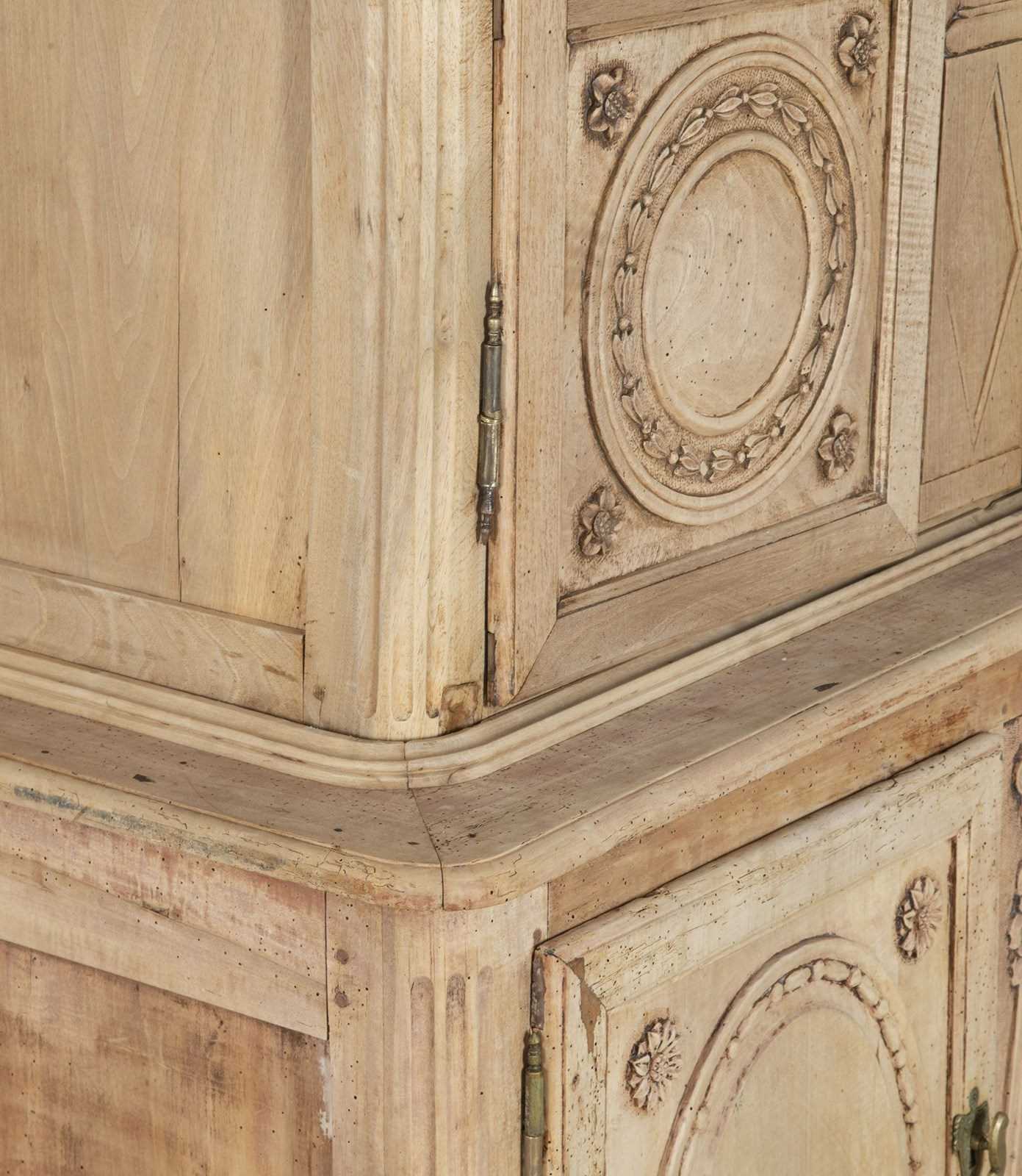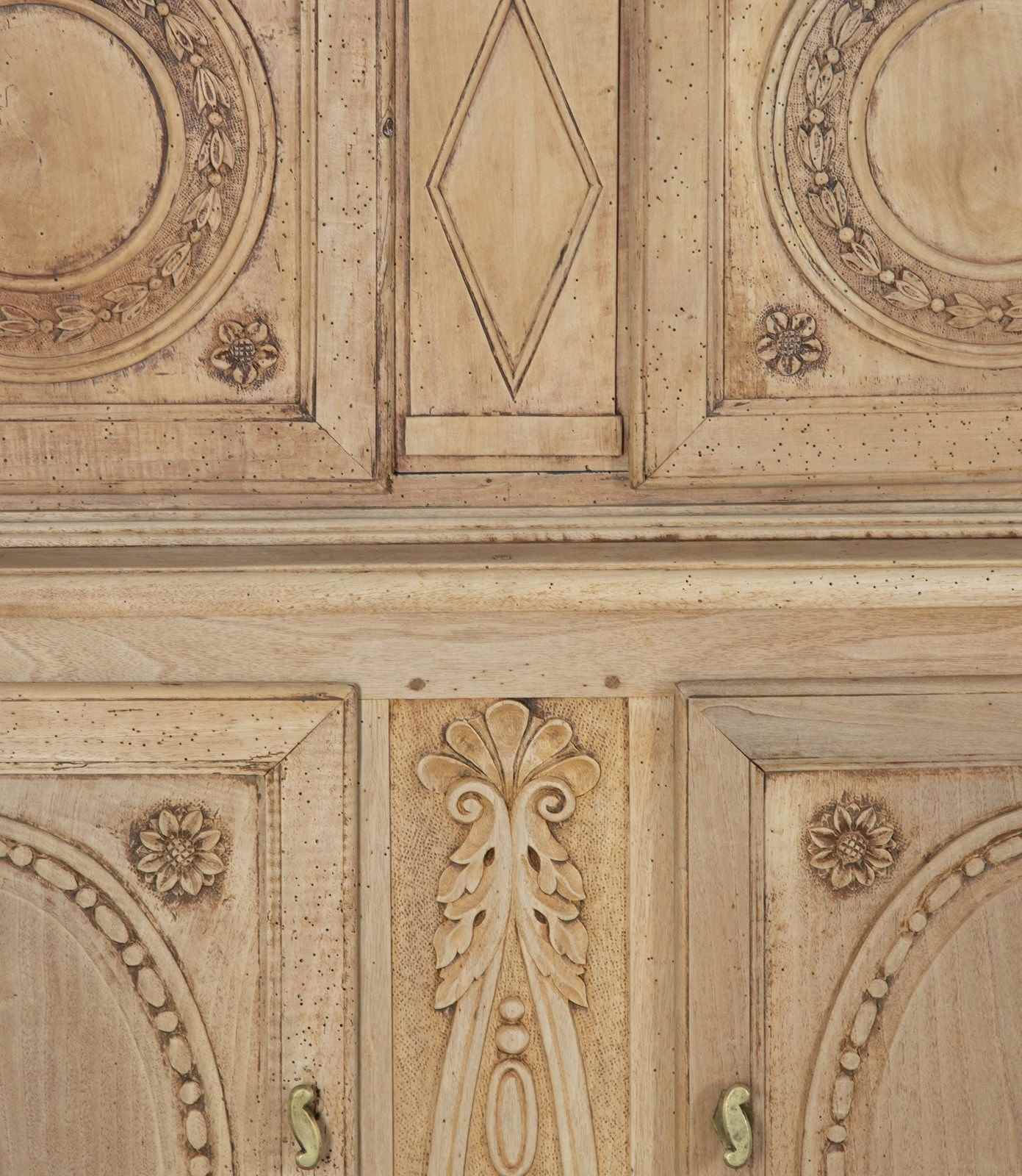 Below the pediment, two doors with Neo-Classical carved detailings opening to useful storage. Below, two further carved doors. Bleached exteriors and repainted on the interior. Will separate into two parts for ease of transportation and delivery.