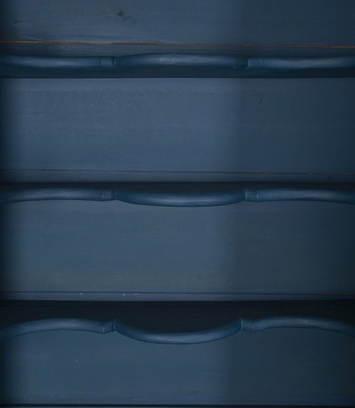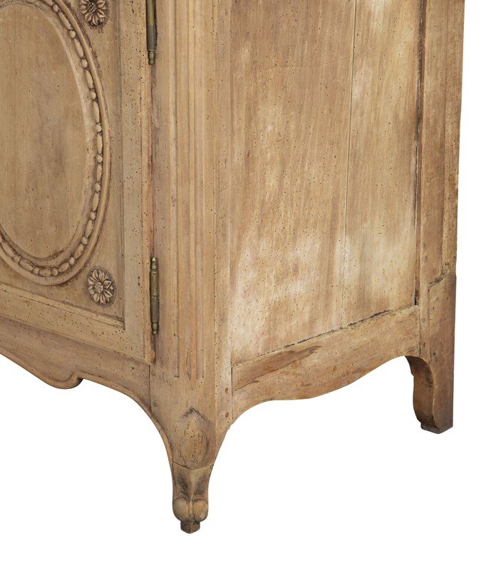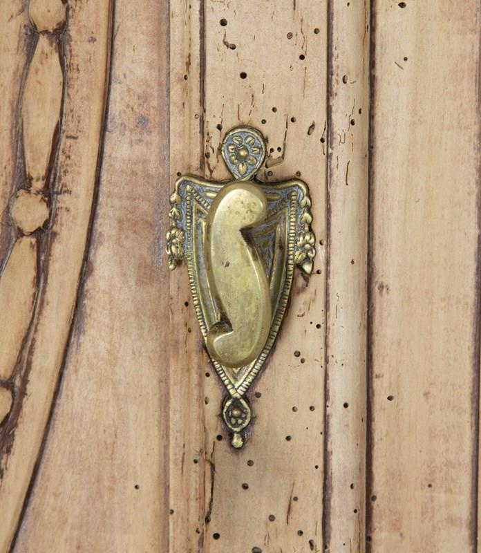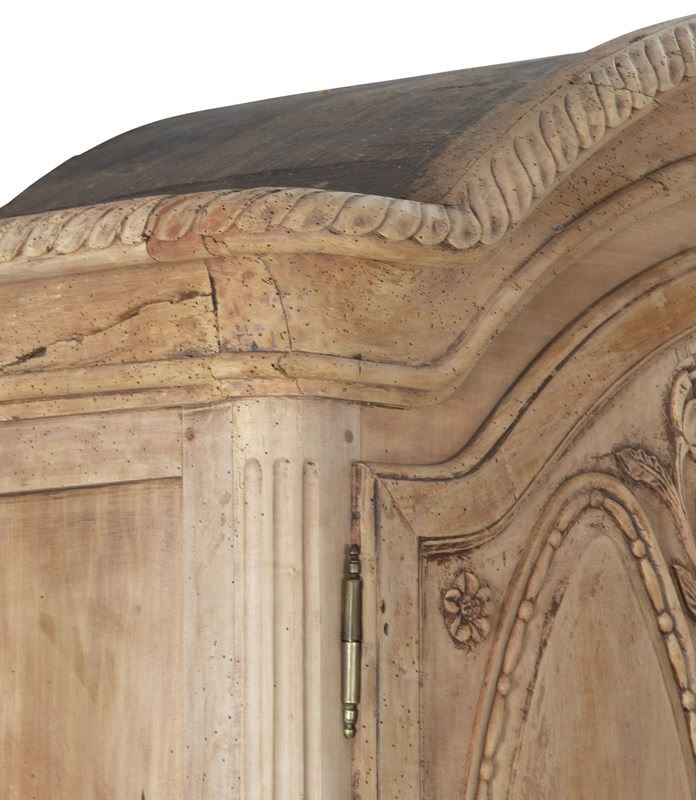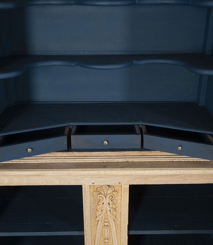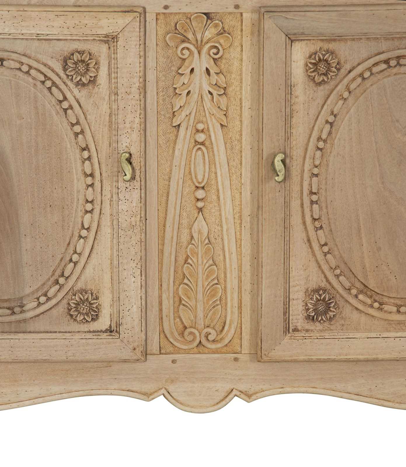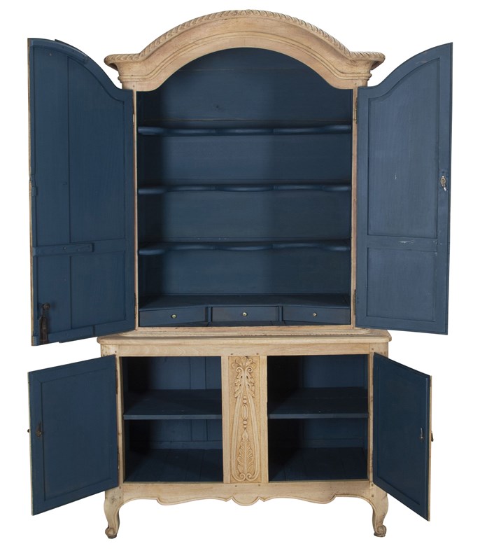 Below the pediment, two doors with Neo-Classical carved detailings opening to useful storage. Below, two further carved doors. Bleached exteriors and repainted on the interior. Will separate into two parts for ease of transportation and delivery.