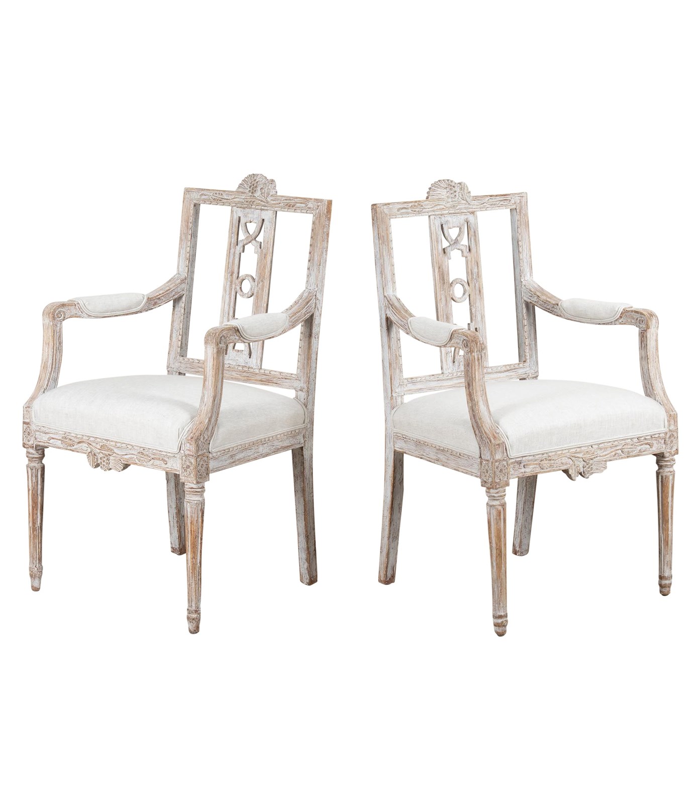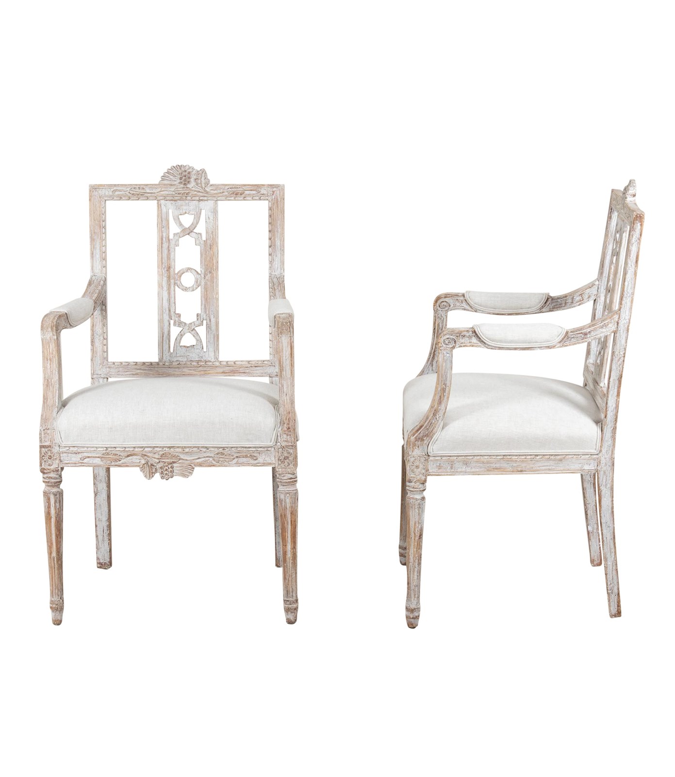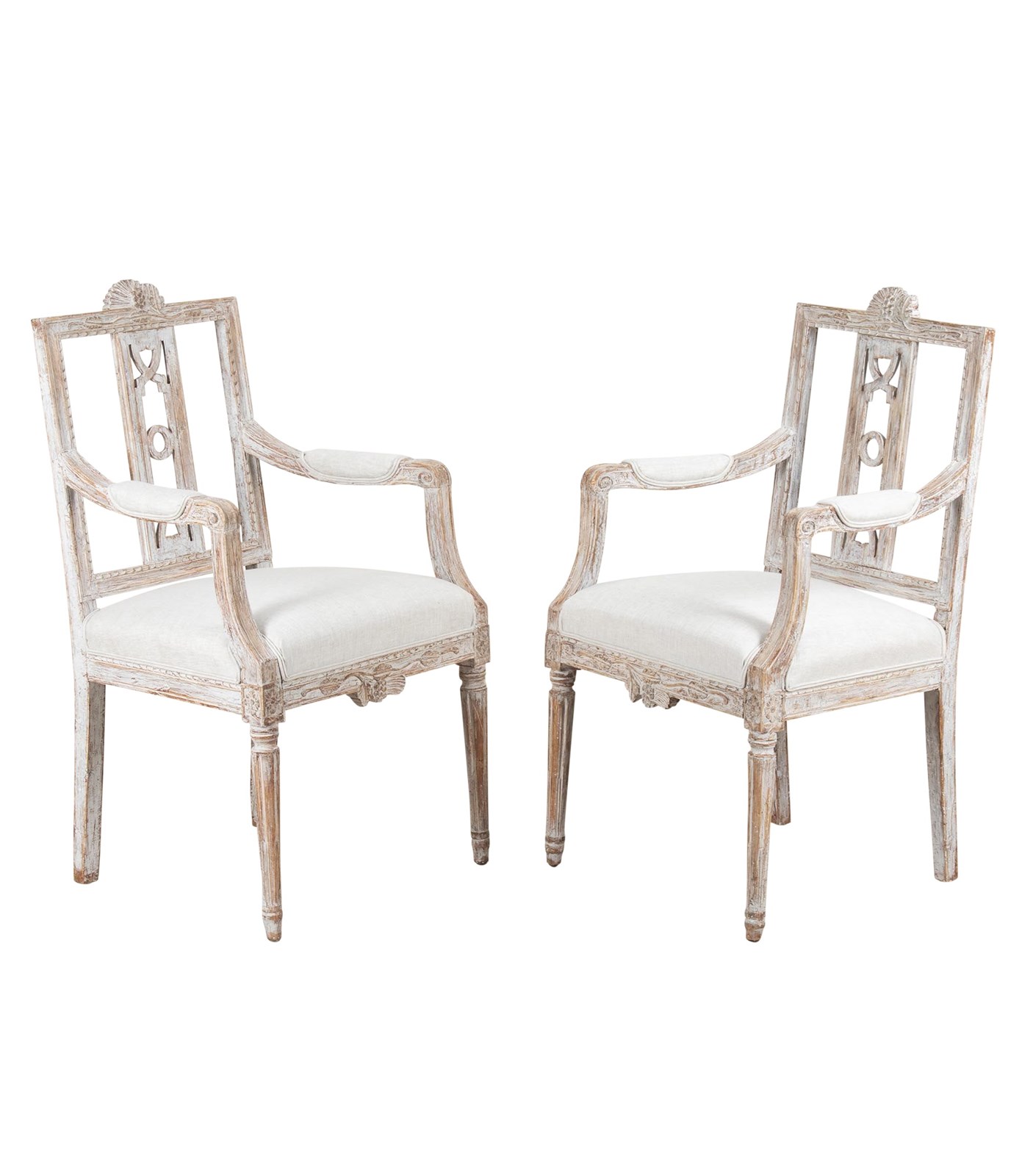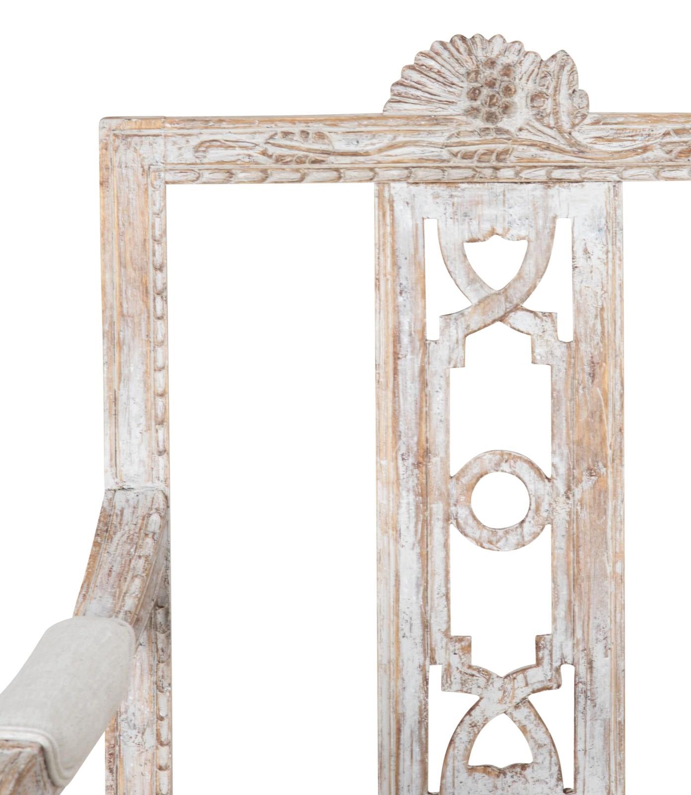 Crisp deep carving, re-painted in soft grey and re-upholstered in linen. Circa 1790.