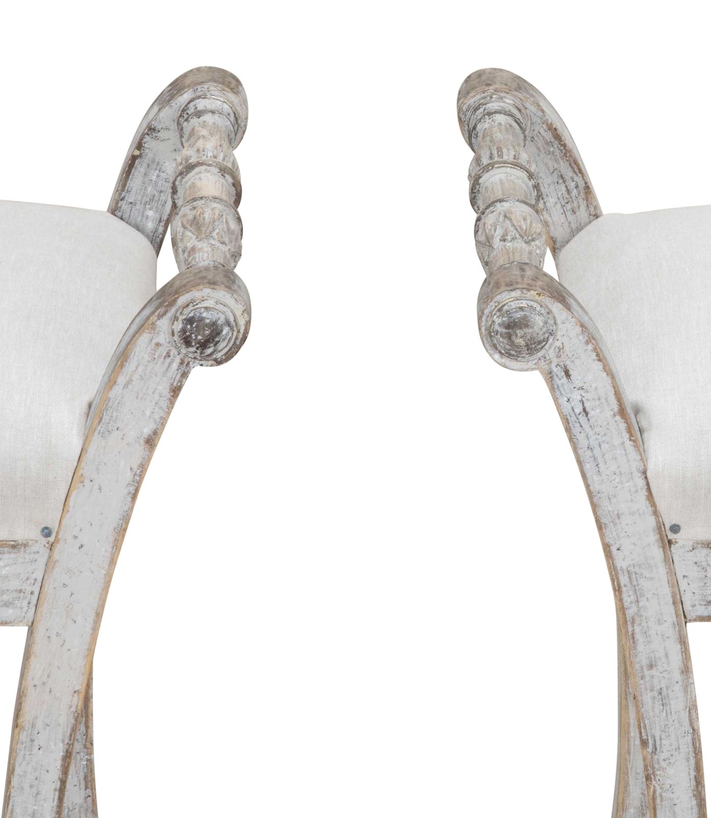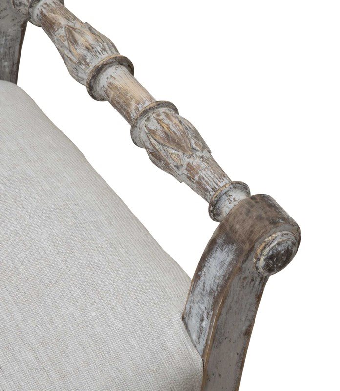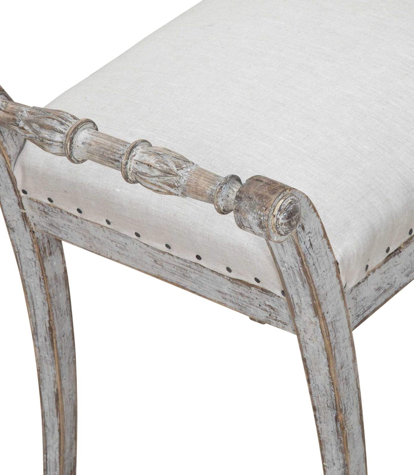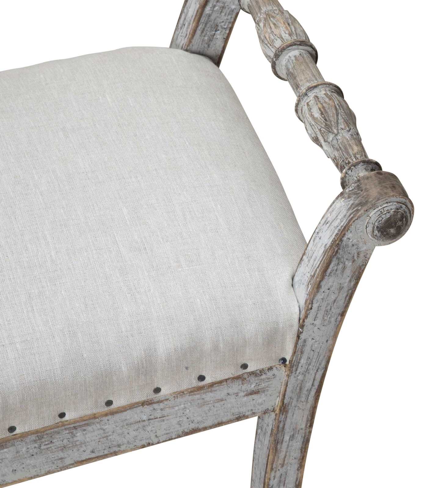 With decorative carved handles and curved legs. Repainted in soft grey and newly reupholstered in linen.