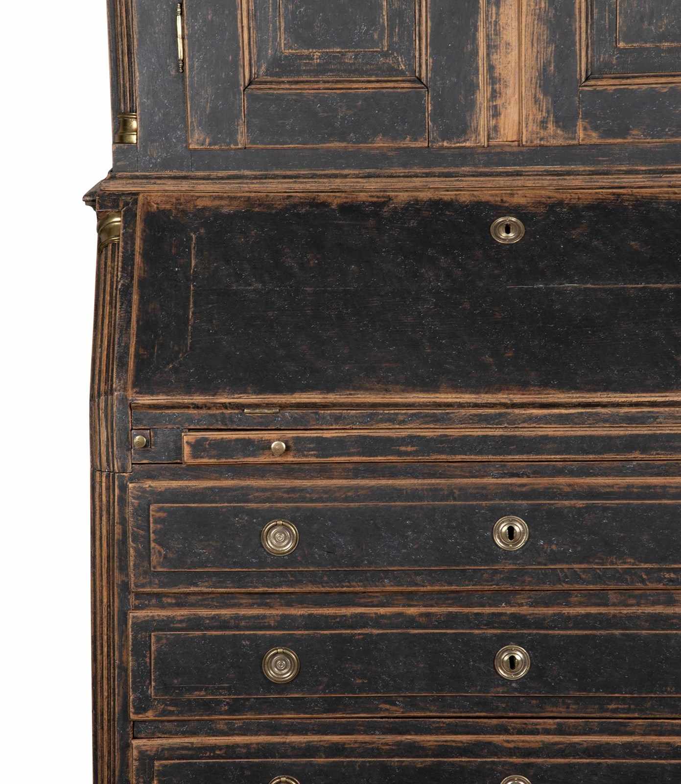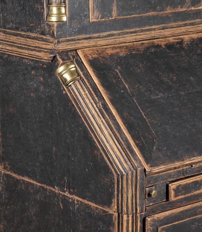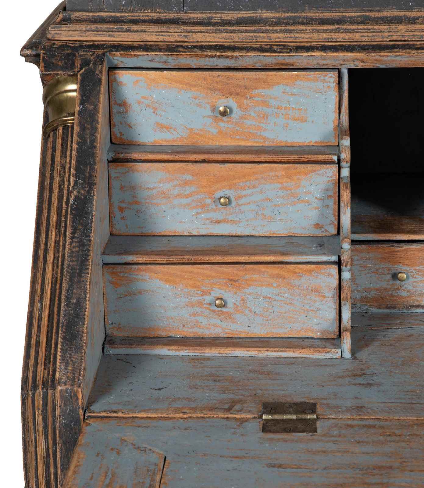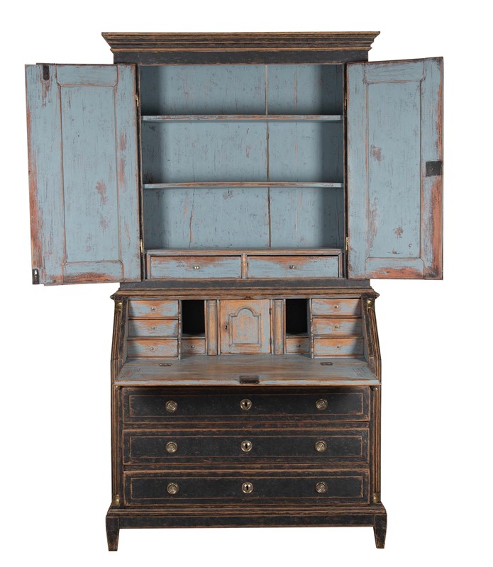 Carved wooden doors opening to storage, below a fall front desk with useful work space and multiple drawer storage. Further below, three drawers. Repainted in soft black with a blue interior. Circa 1780.
