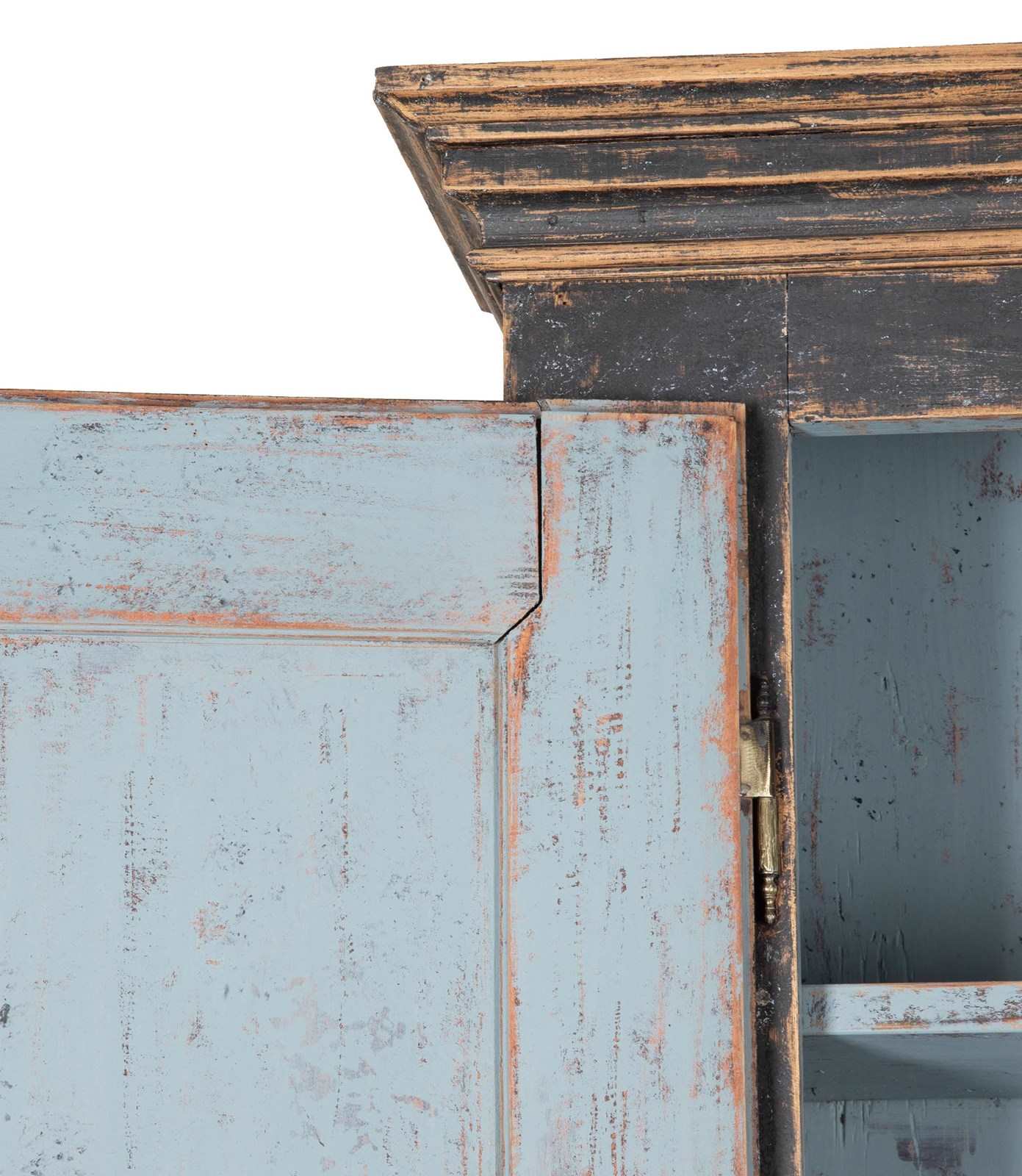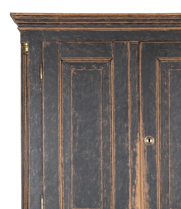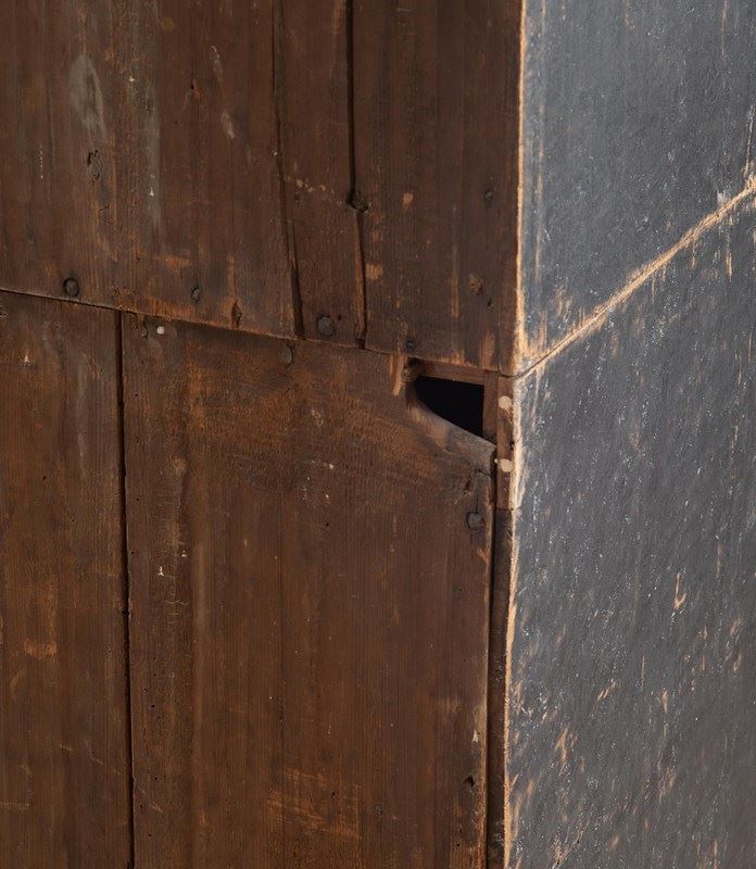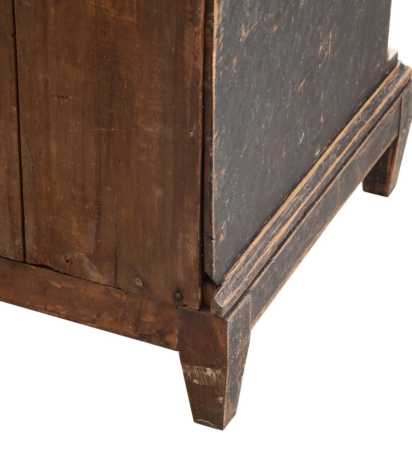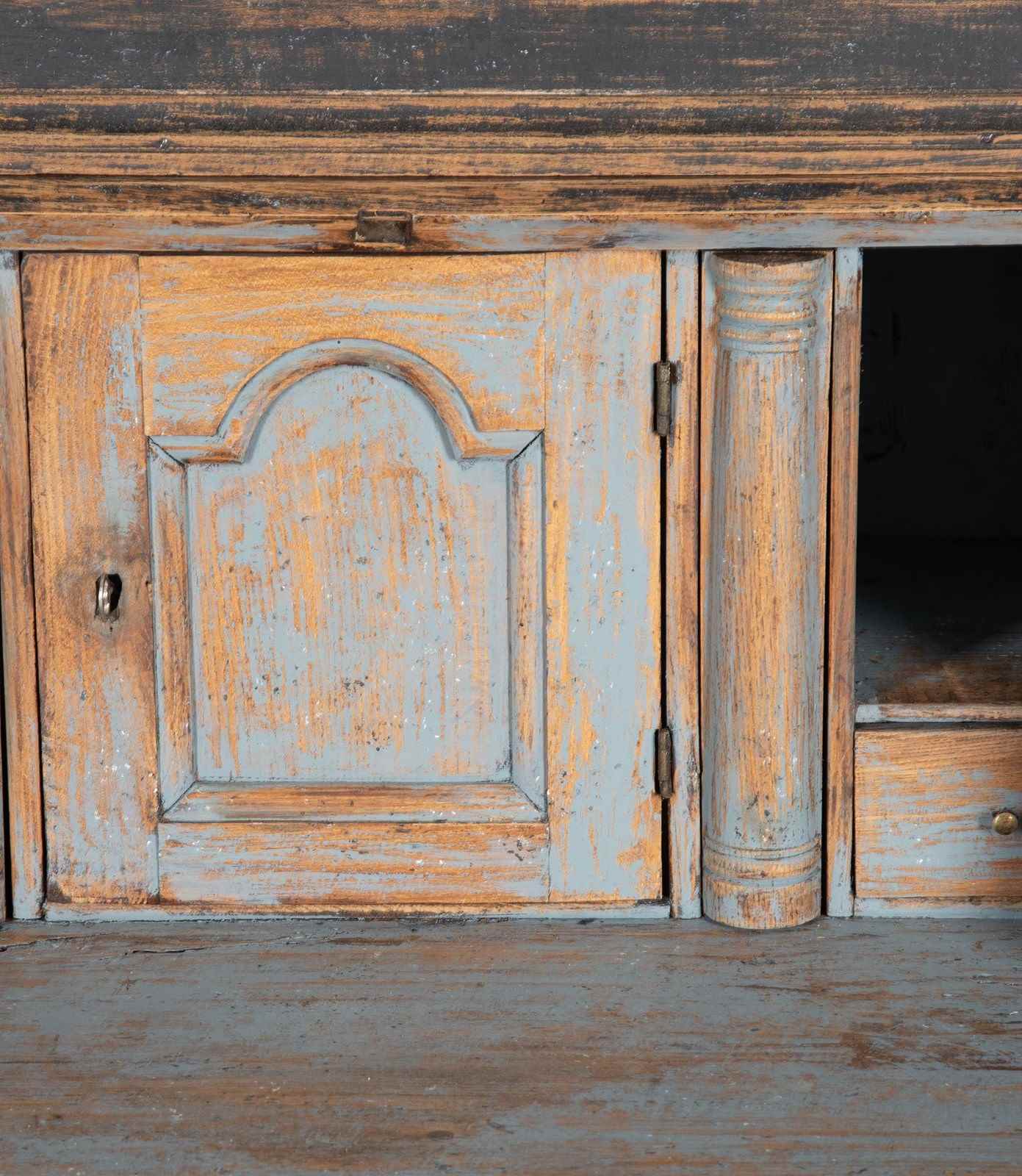 Carved wooden doors opening to storage, below a fall front desk with useful work space and multiple drawer storage. Further below, three drawers. Repainted in soft black with a blue interior. Circa 1780.