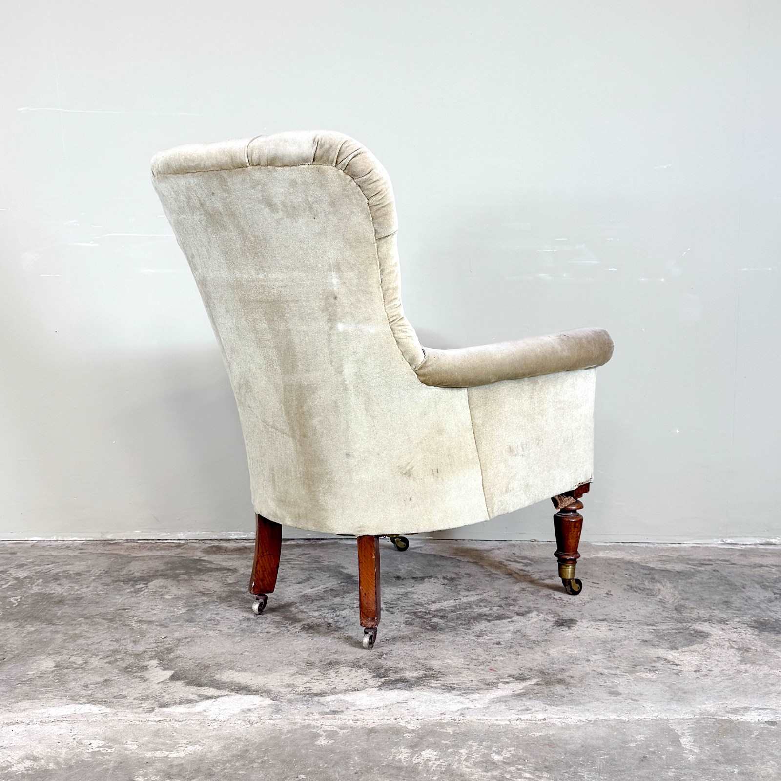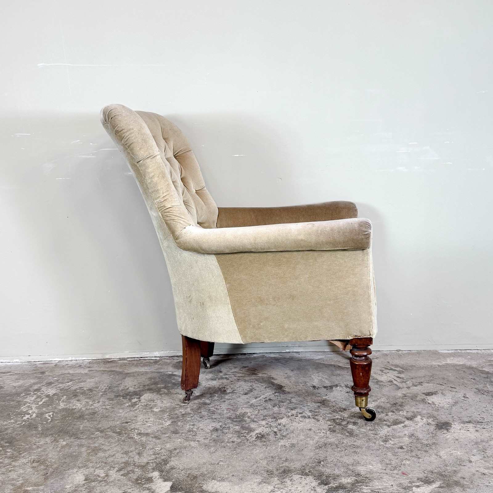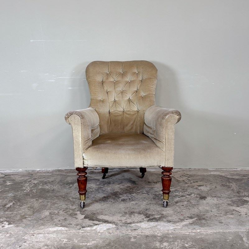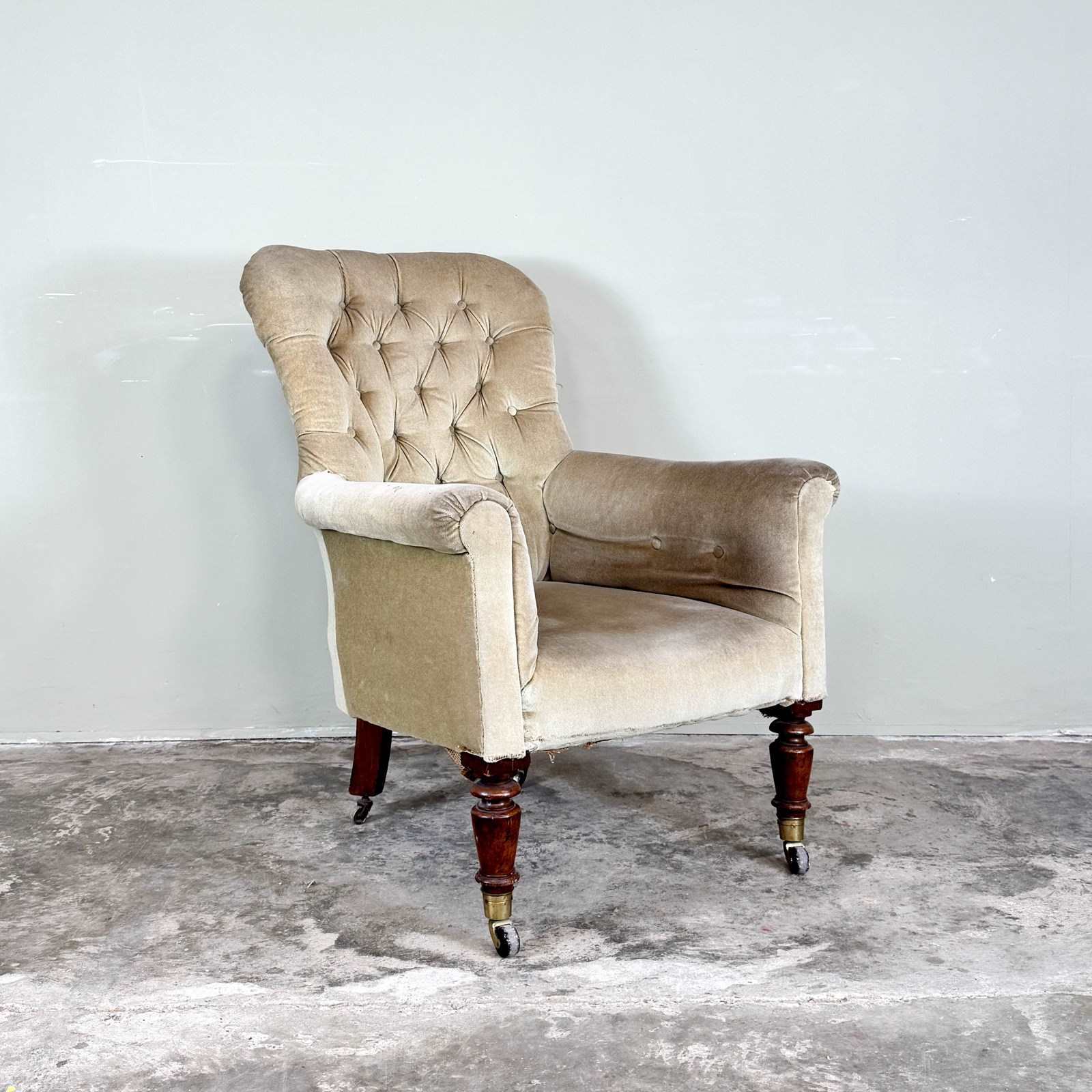 A 19th century English library chair, standing on turned mahogany legs and brass cup castors, with scroll arms. With sprung seat and buttoned back. (can be plain when reupholstered0). Circa 1850 - 60
