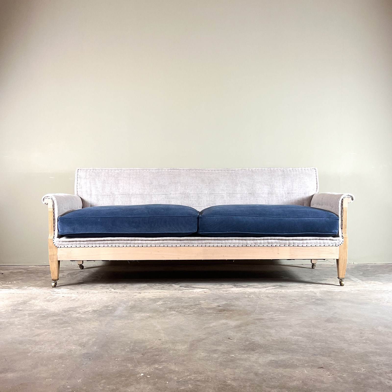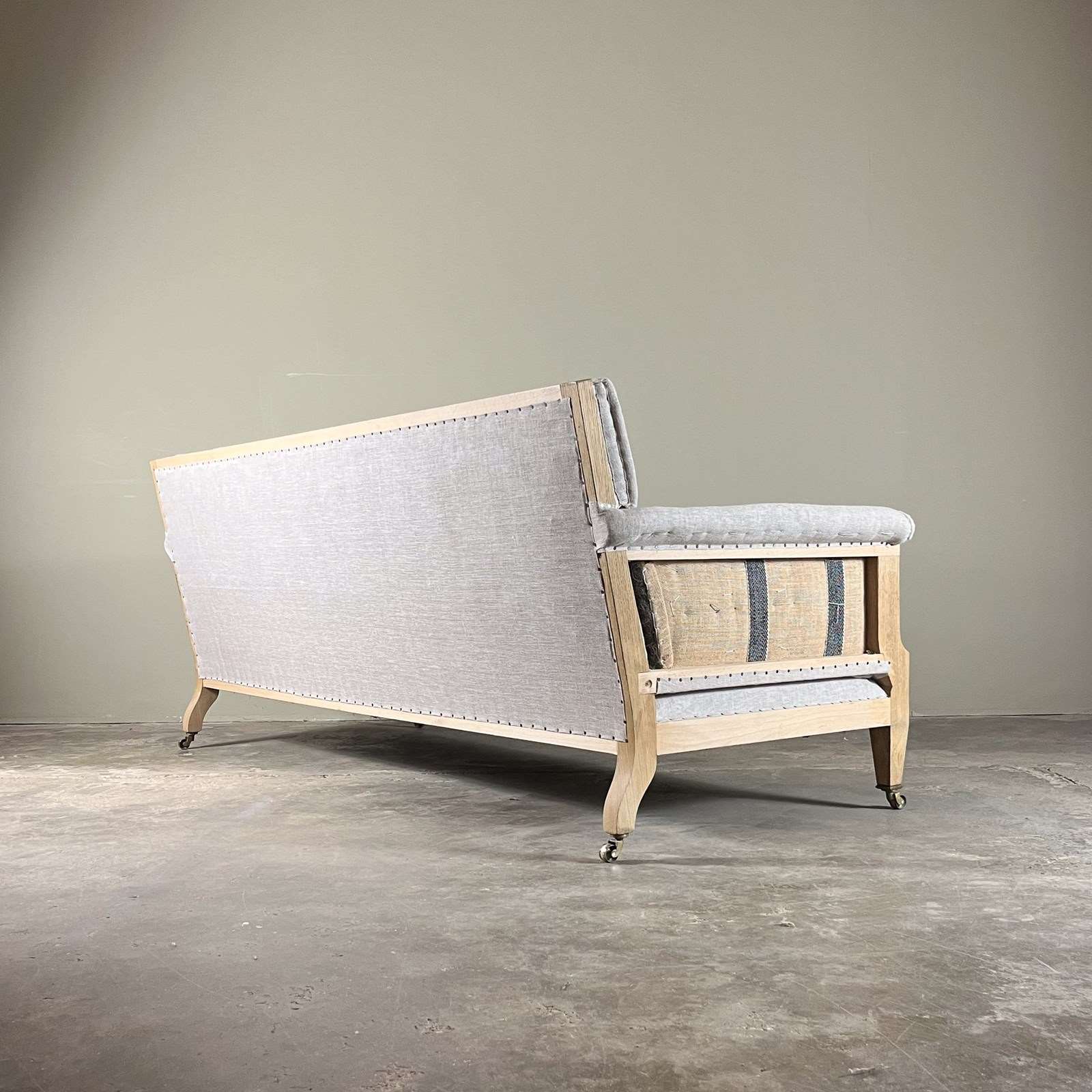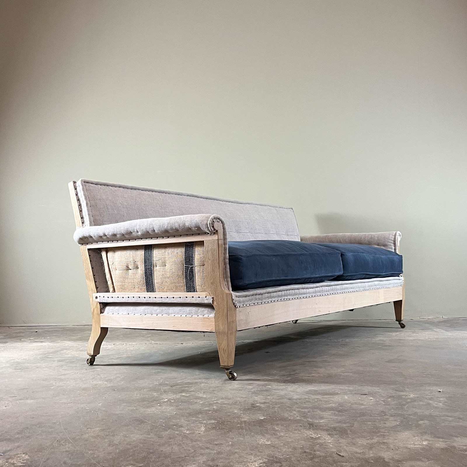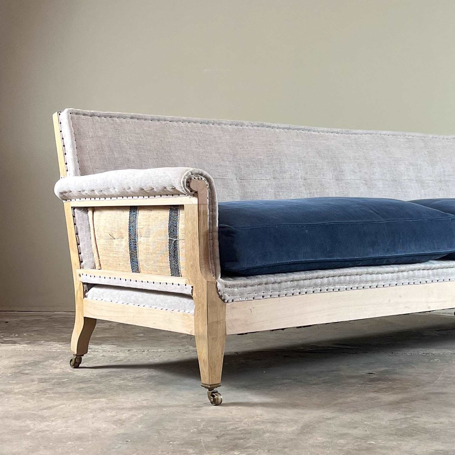 Made by us, this is our latest bespoke sofa to add to our collection, based on a design by LENYGON and MORANT. As with all our bespoke items, this is traditionally made with a beech frame and oak legs, upholstered using jute webbing, hessian, horsehair and hand tied coil springs. The legs standing on quality lost wax brass castors.