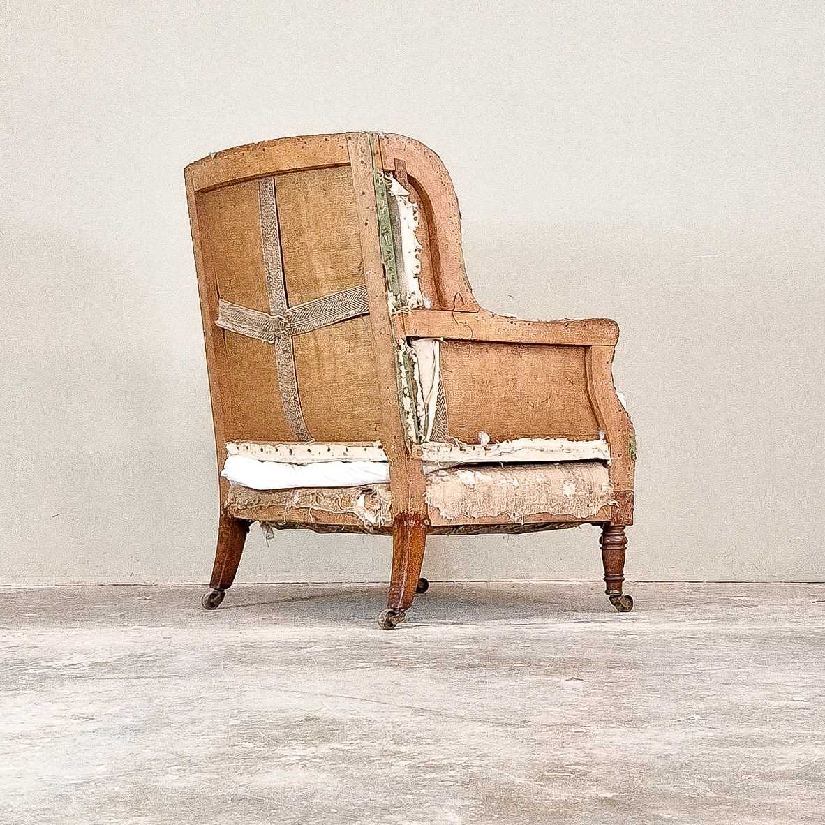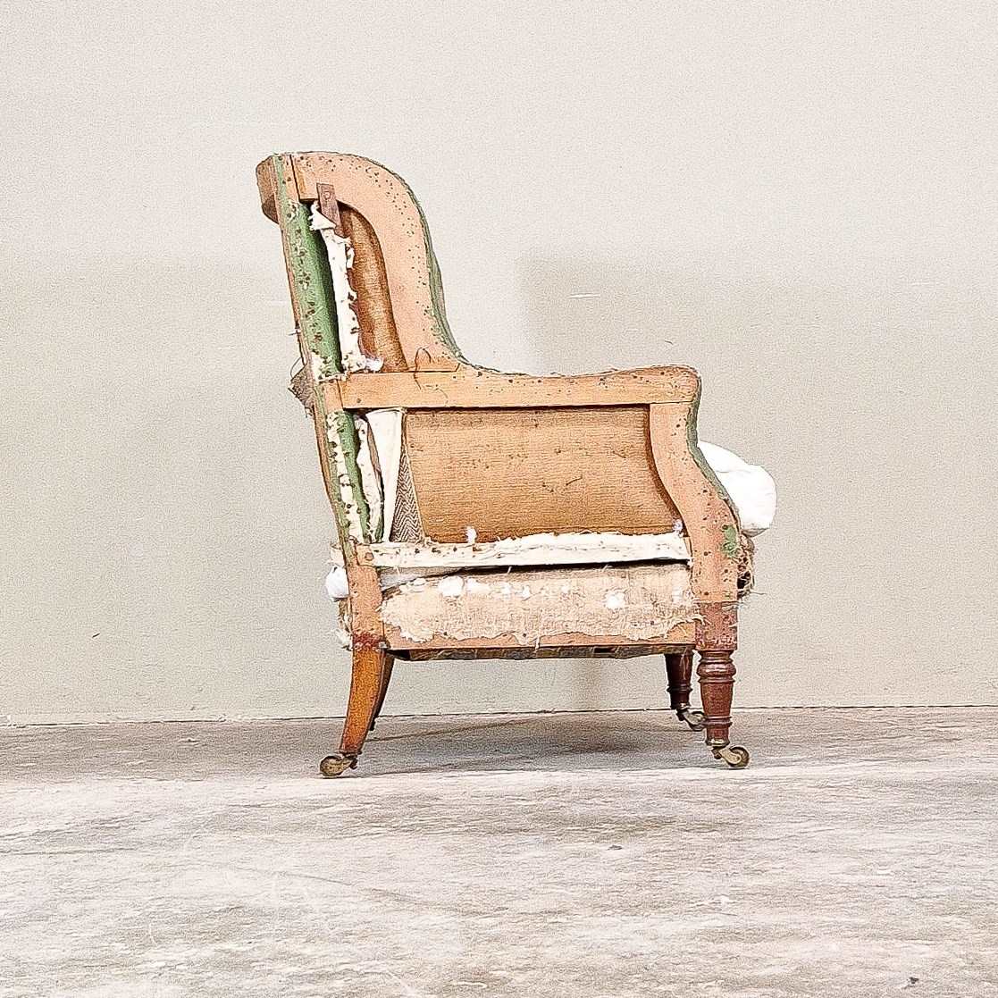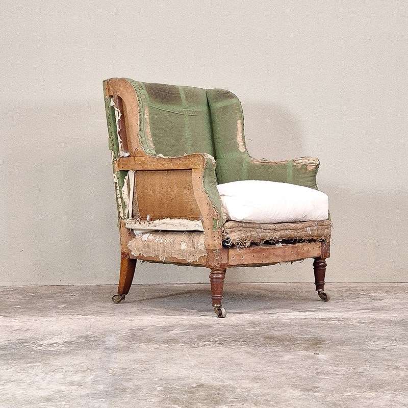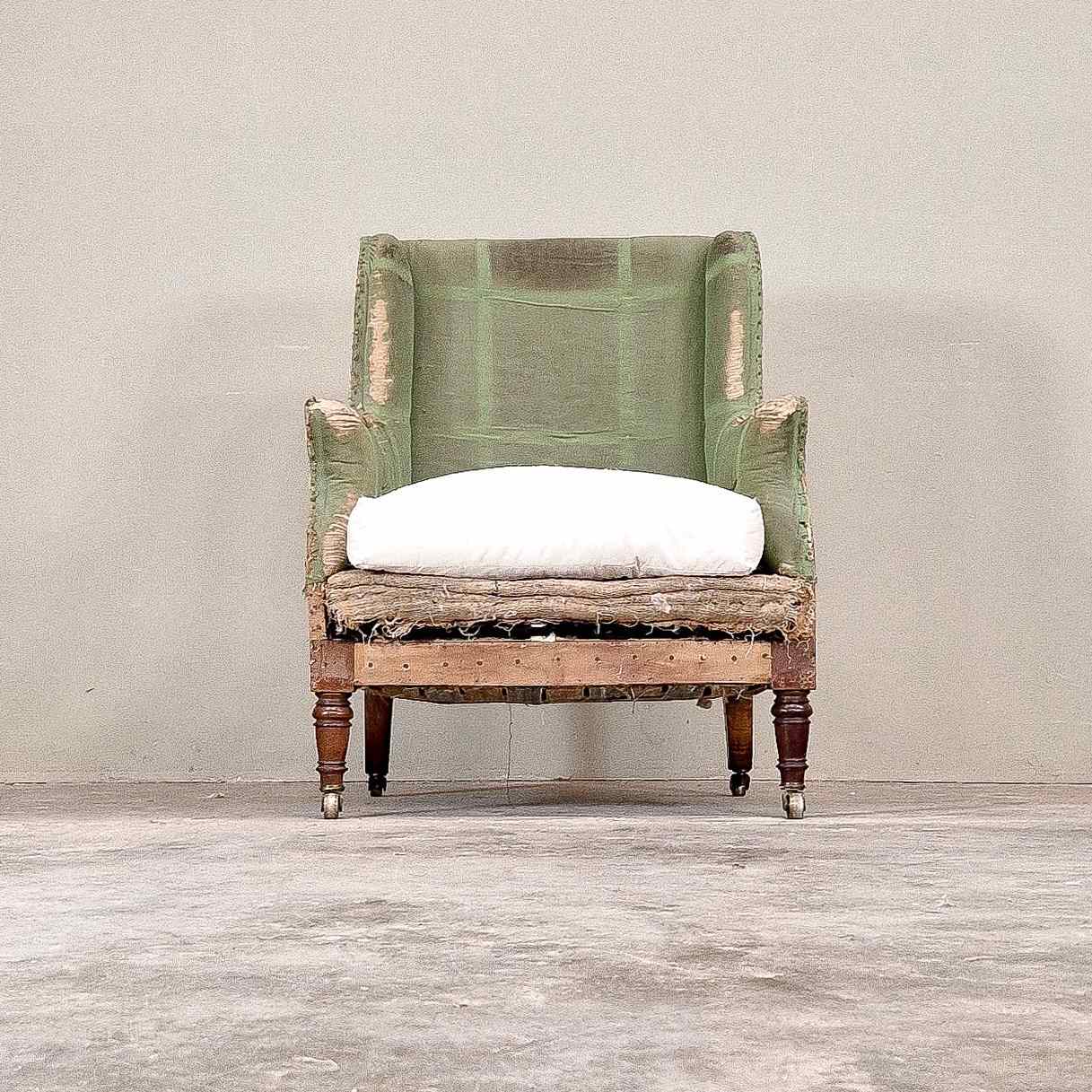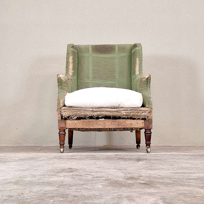 A very good quality English winged armchair, with shaped arms and a small wing. Standing on turned legs, sprung seat with a feather cushion. Circa 1840