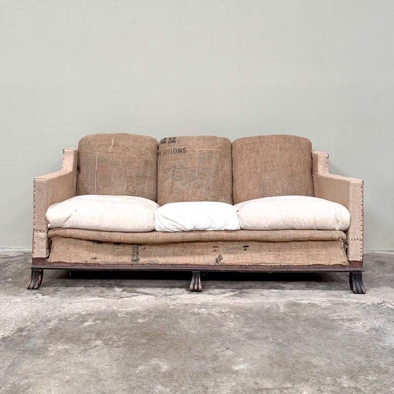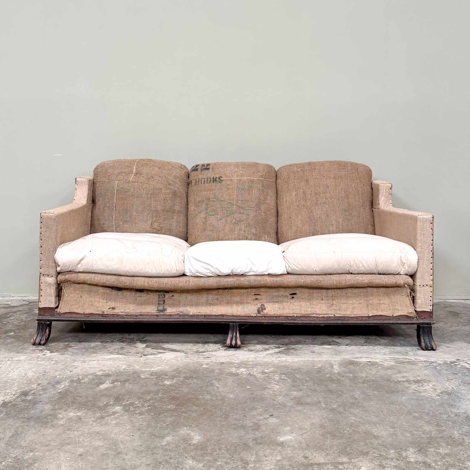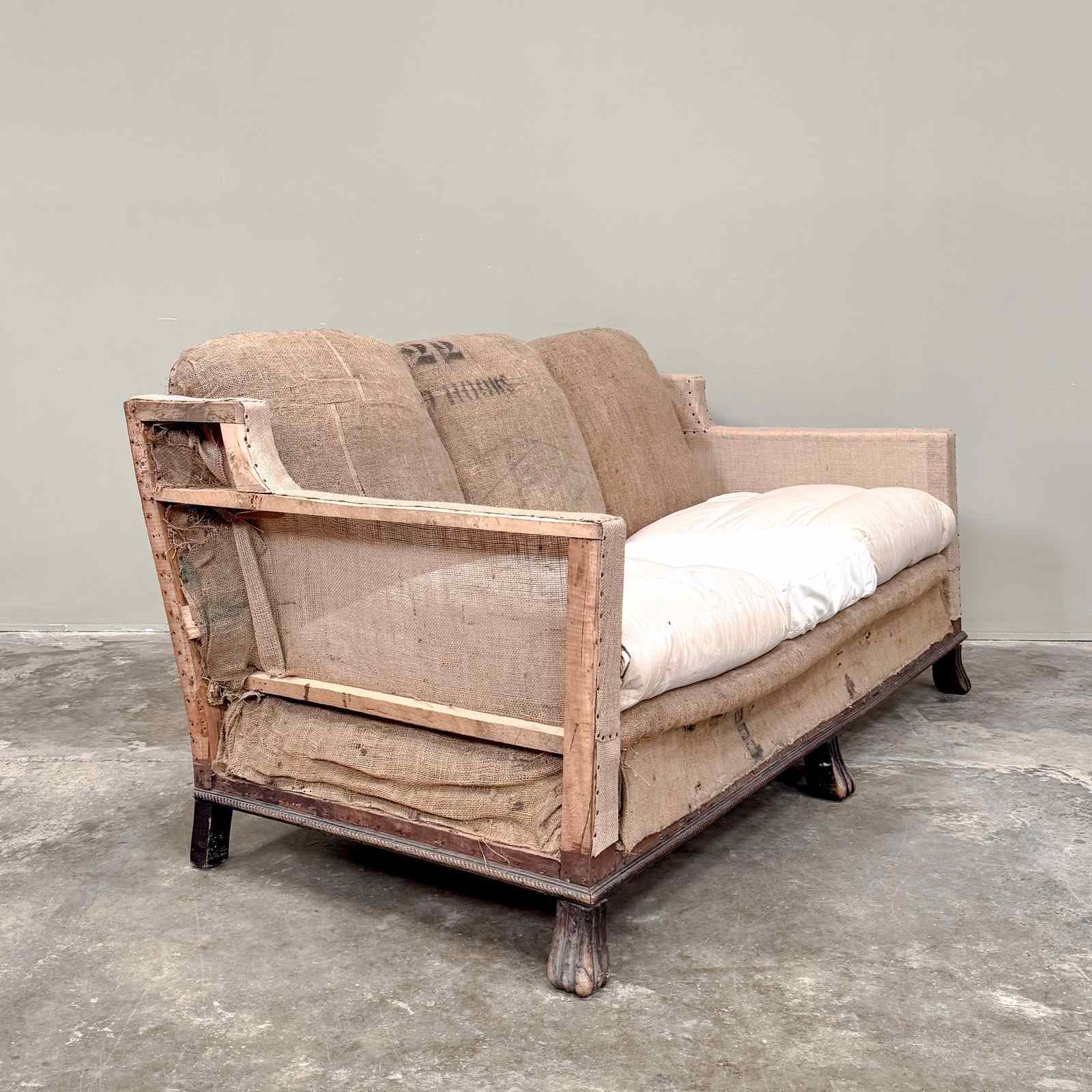 A French three seater sofa. Standing on Spanish feet and show wood trim to the front. Sprung seat and back, with feather seat cushion. Currently with three back cushions but could be upholstered to have Circa 1920s. (Has a matching pair of chairs)