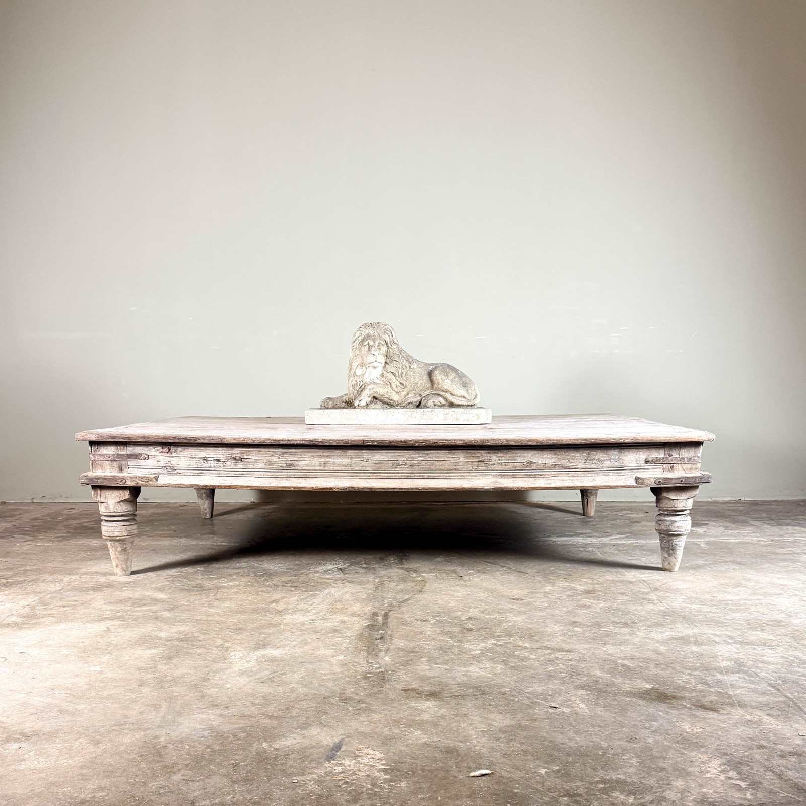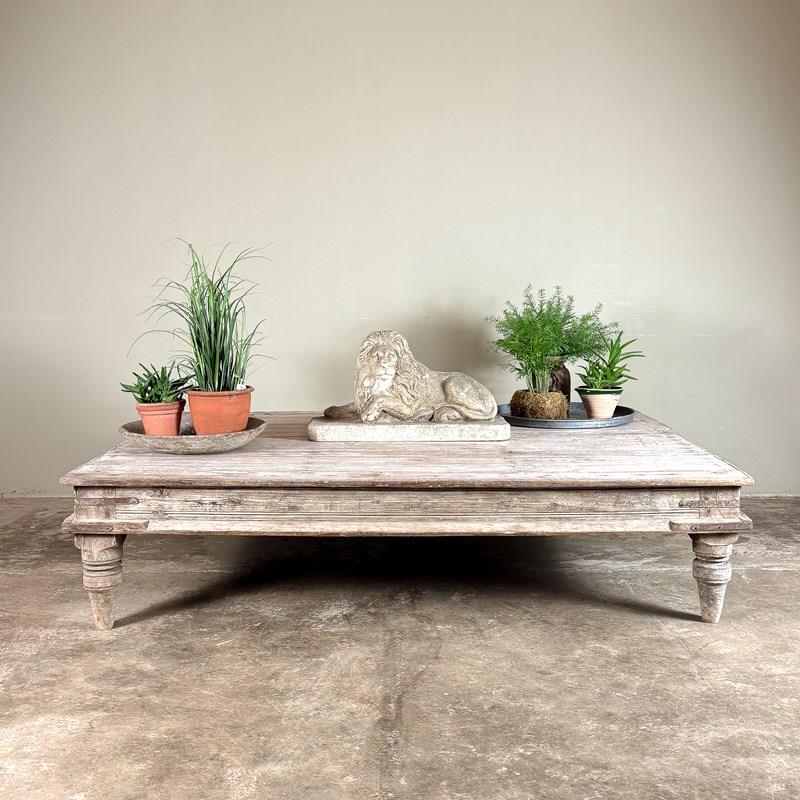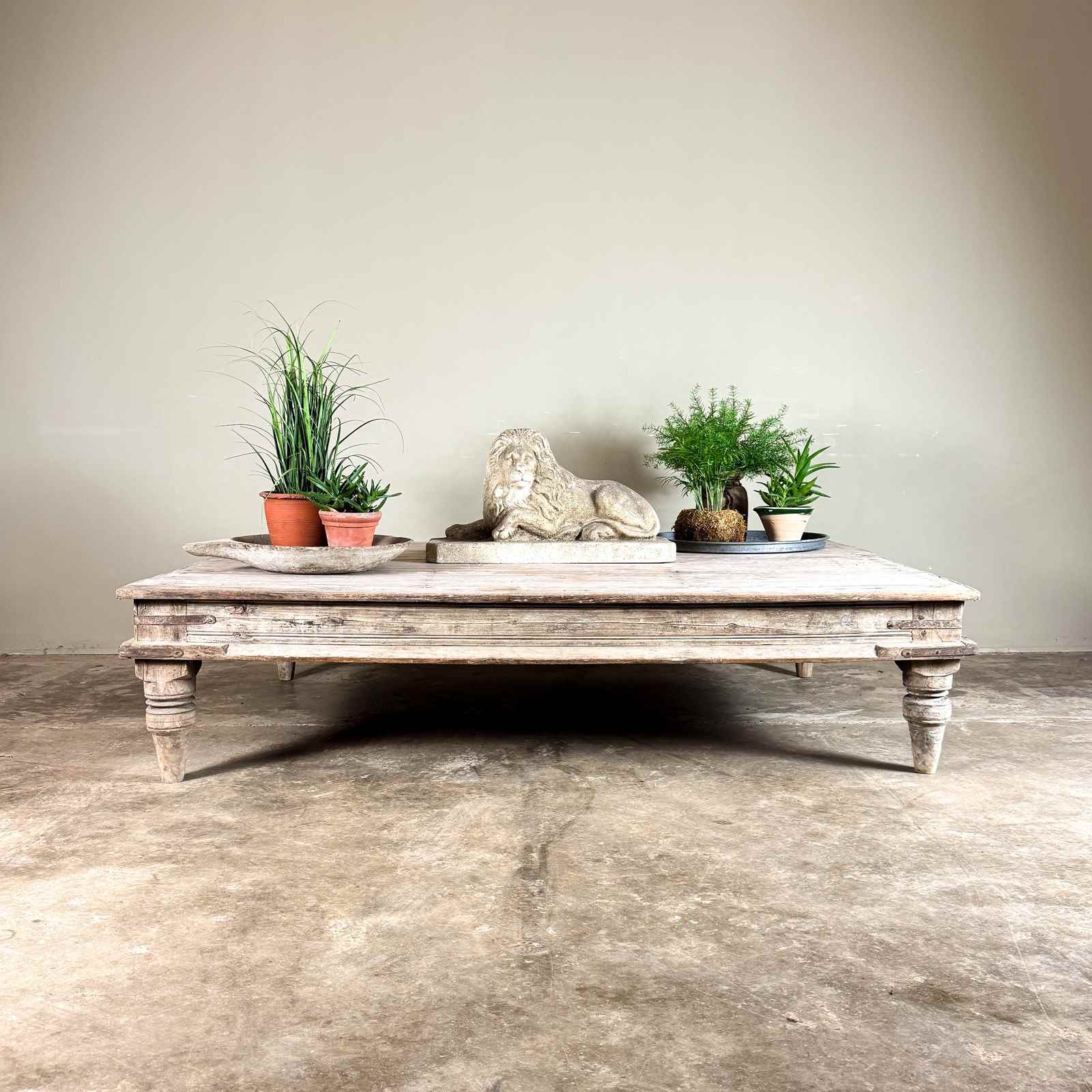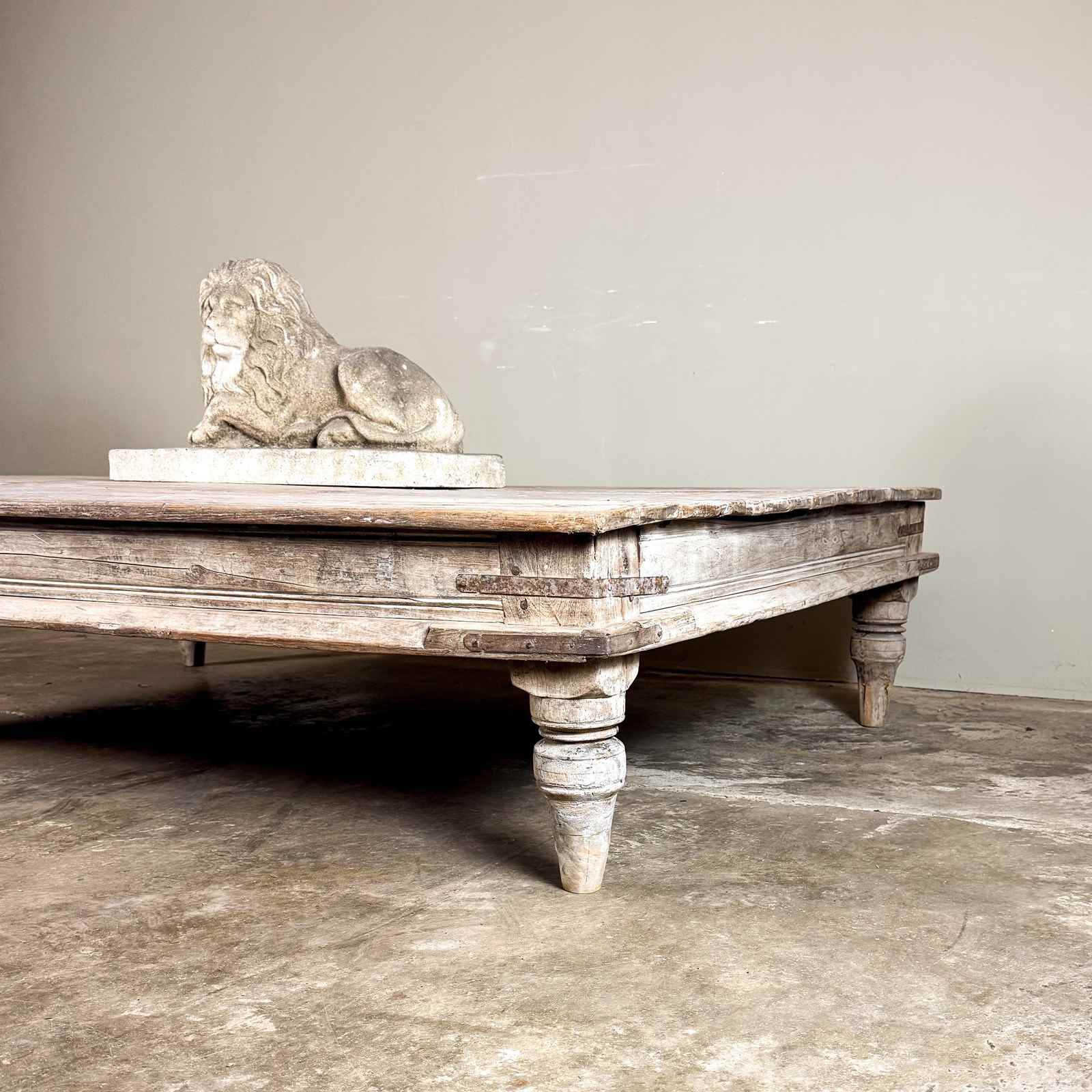 Extremely large, fabulous one of a kind coffee table. Bleached out with plank top and original metal strap work. Standing on turned legs.