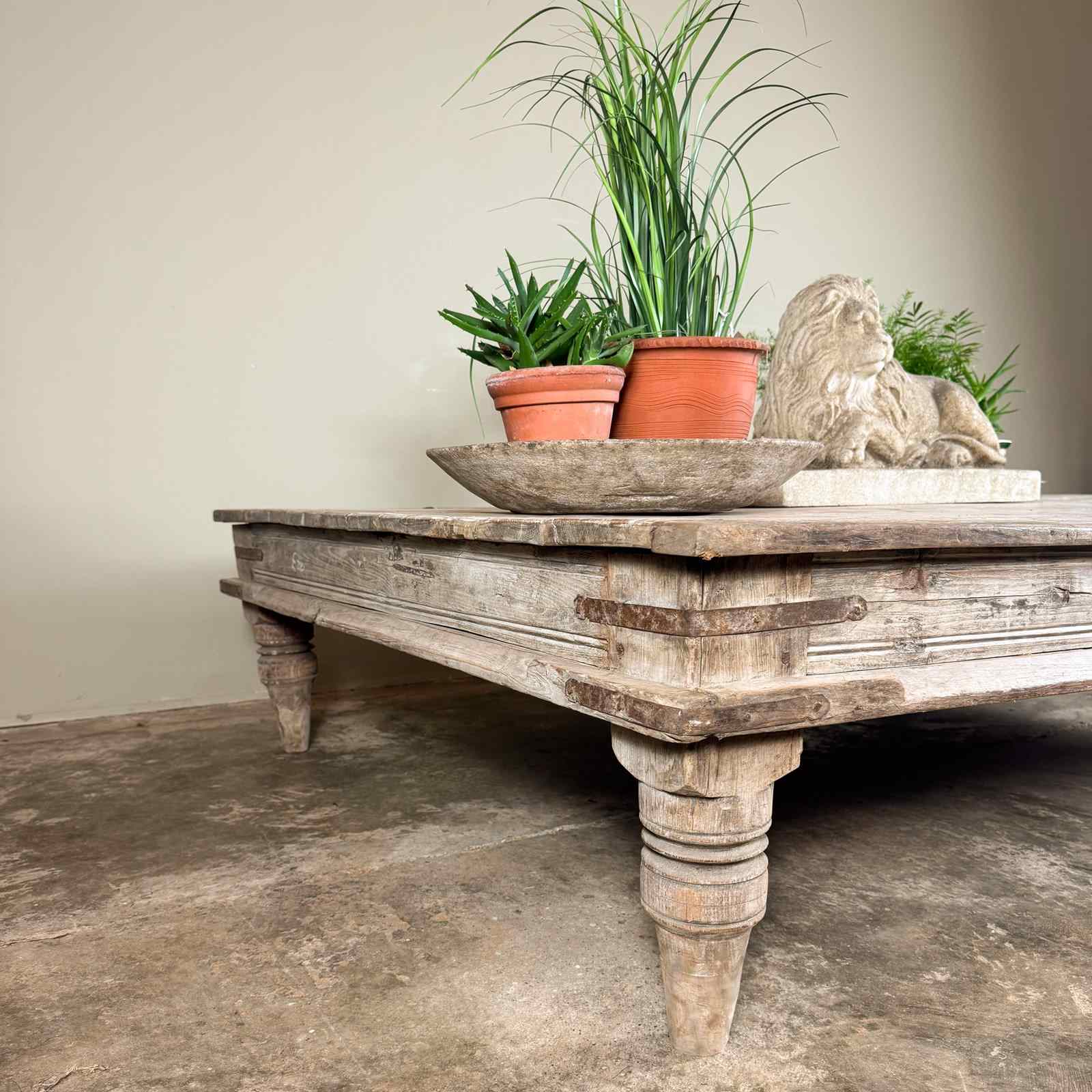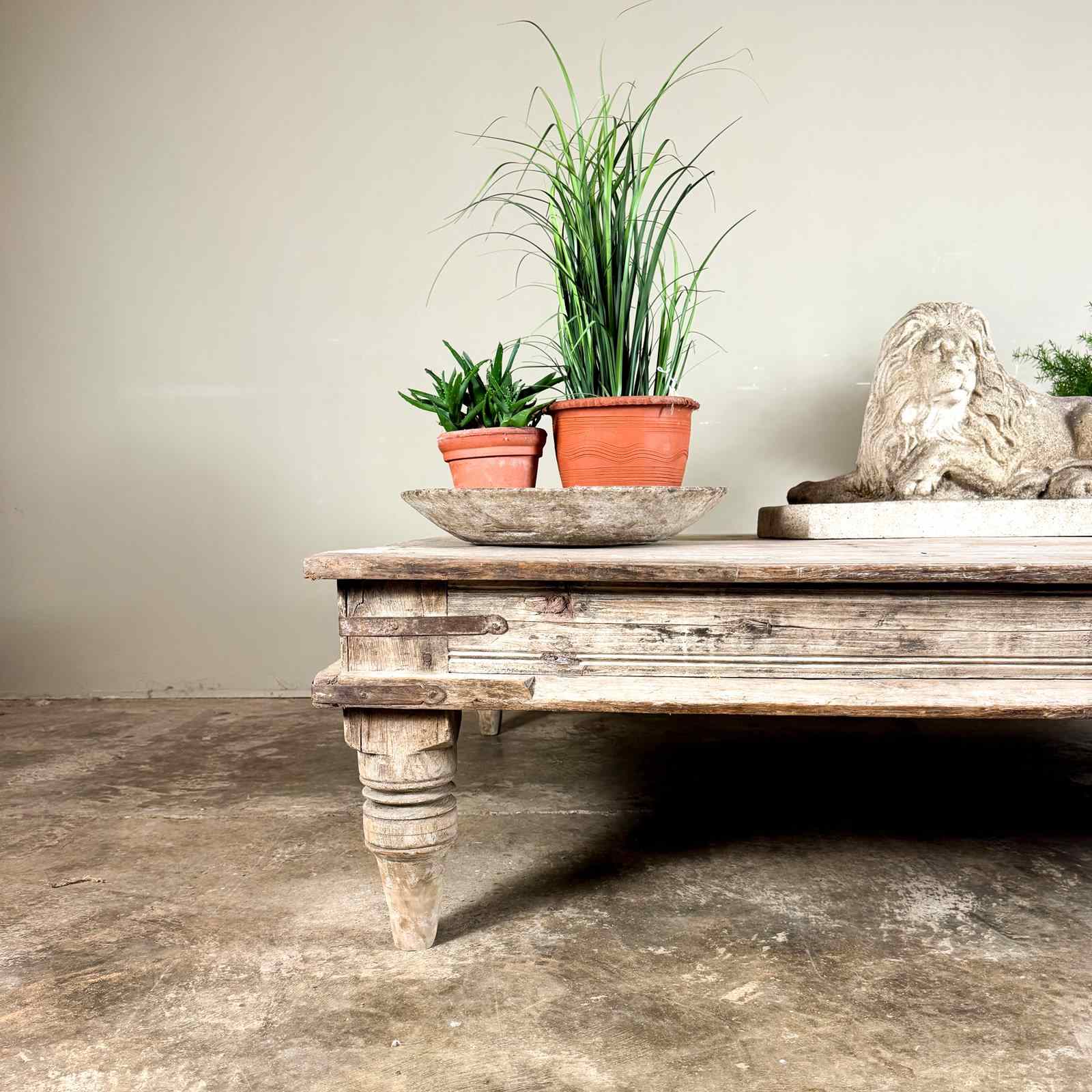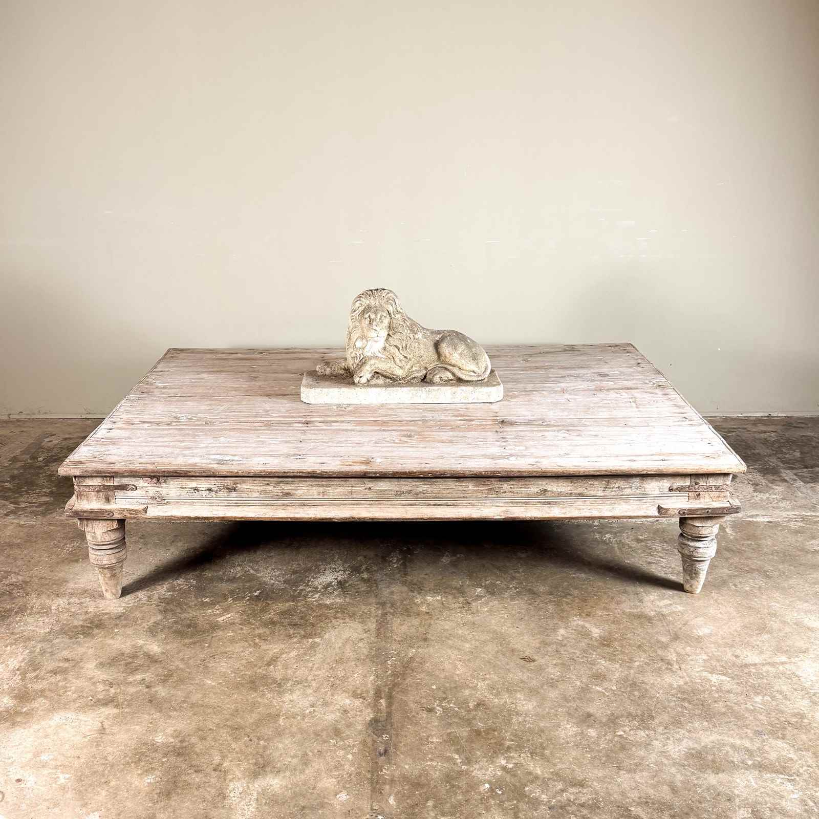 Extremely large, fabulous one of a kind coffee table. Bleached out with plank top and original metal strap work. Standing on turned legs.