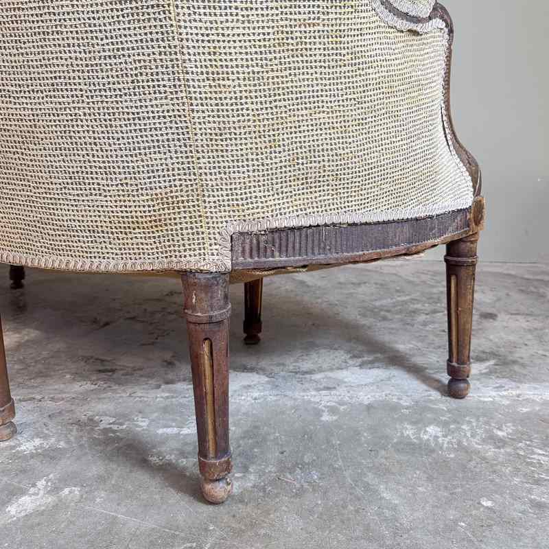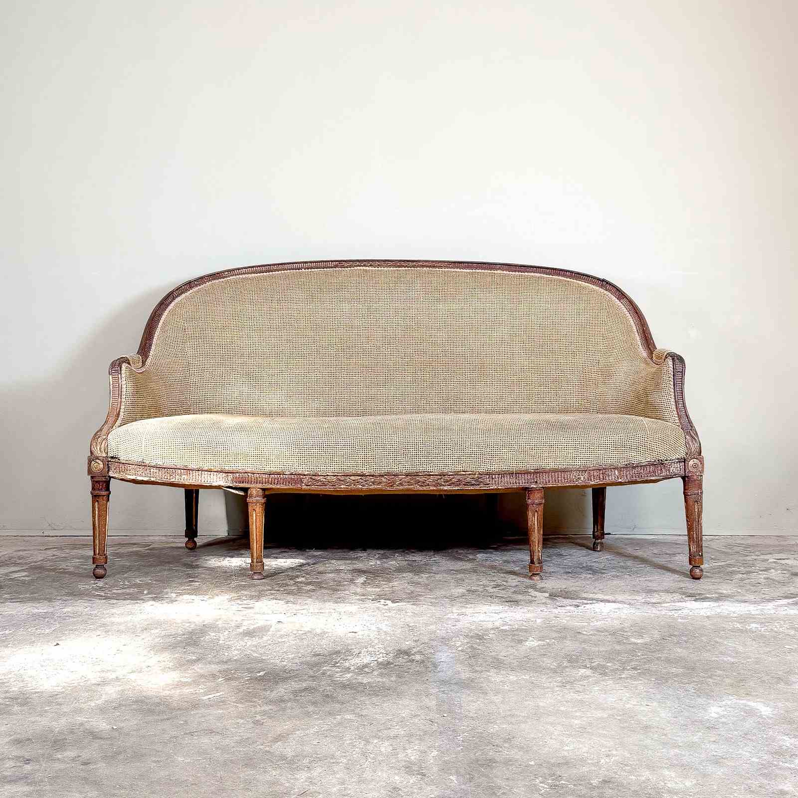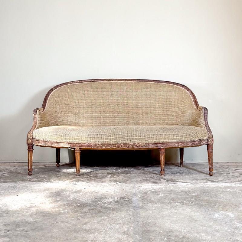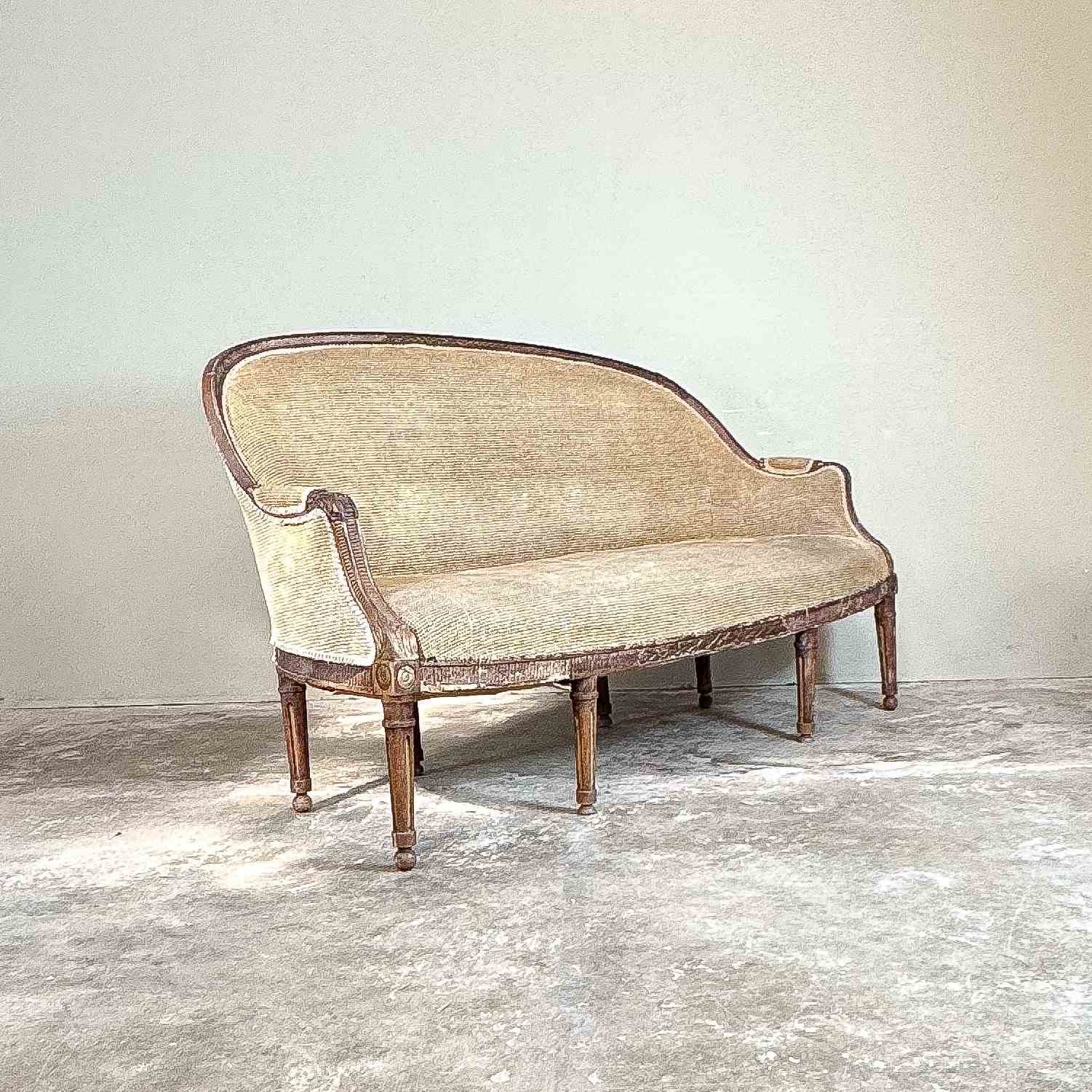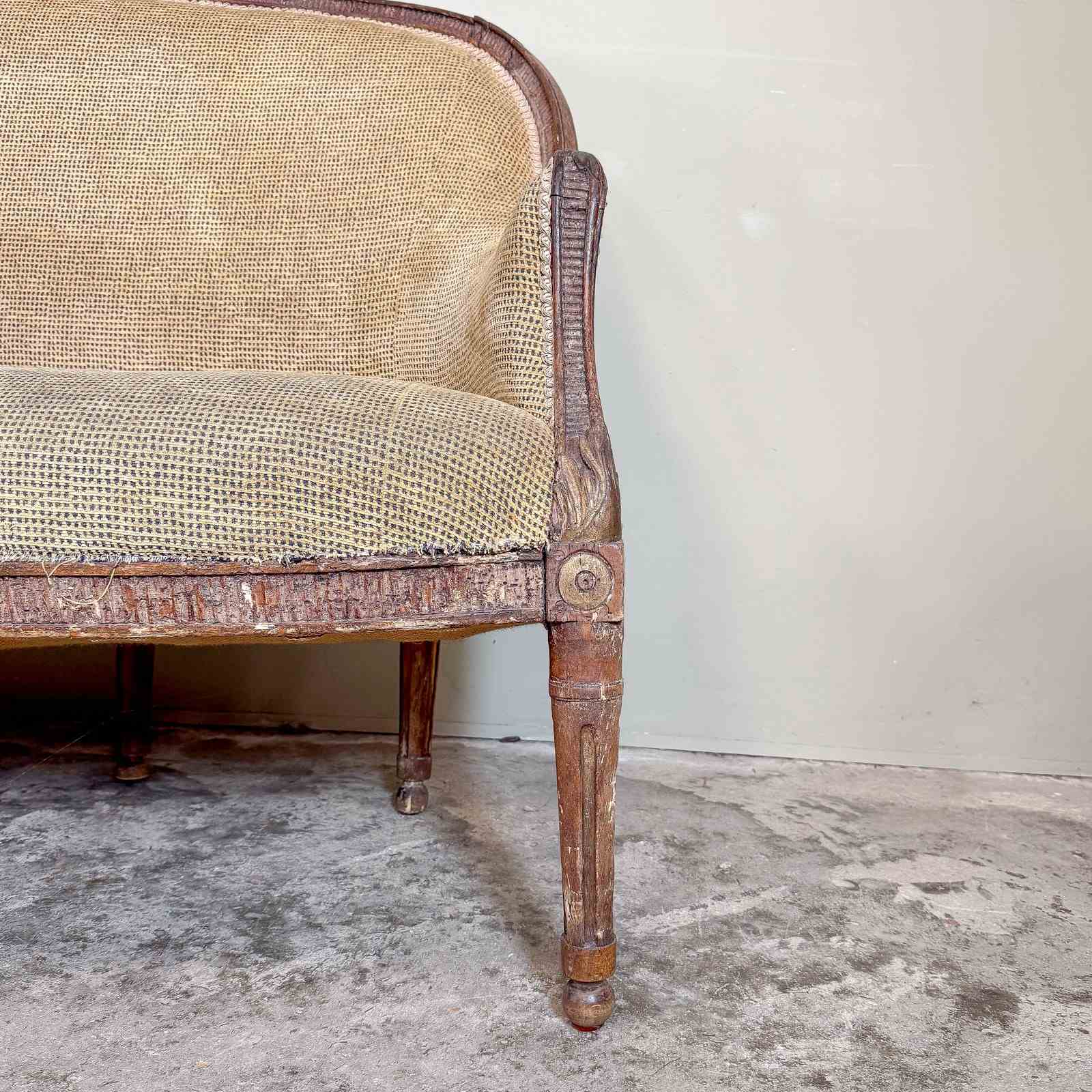 Very pretty mid 19th century French canape, with turned fluted legs and carved decoration to show wood frame. With some original guilt decoration. Circa 1850-60