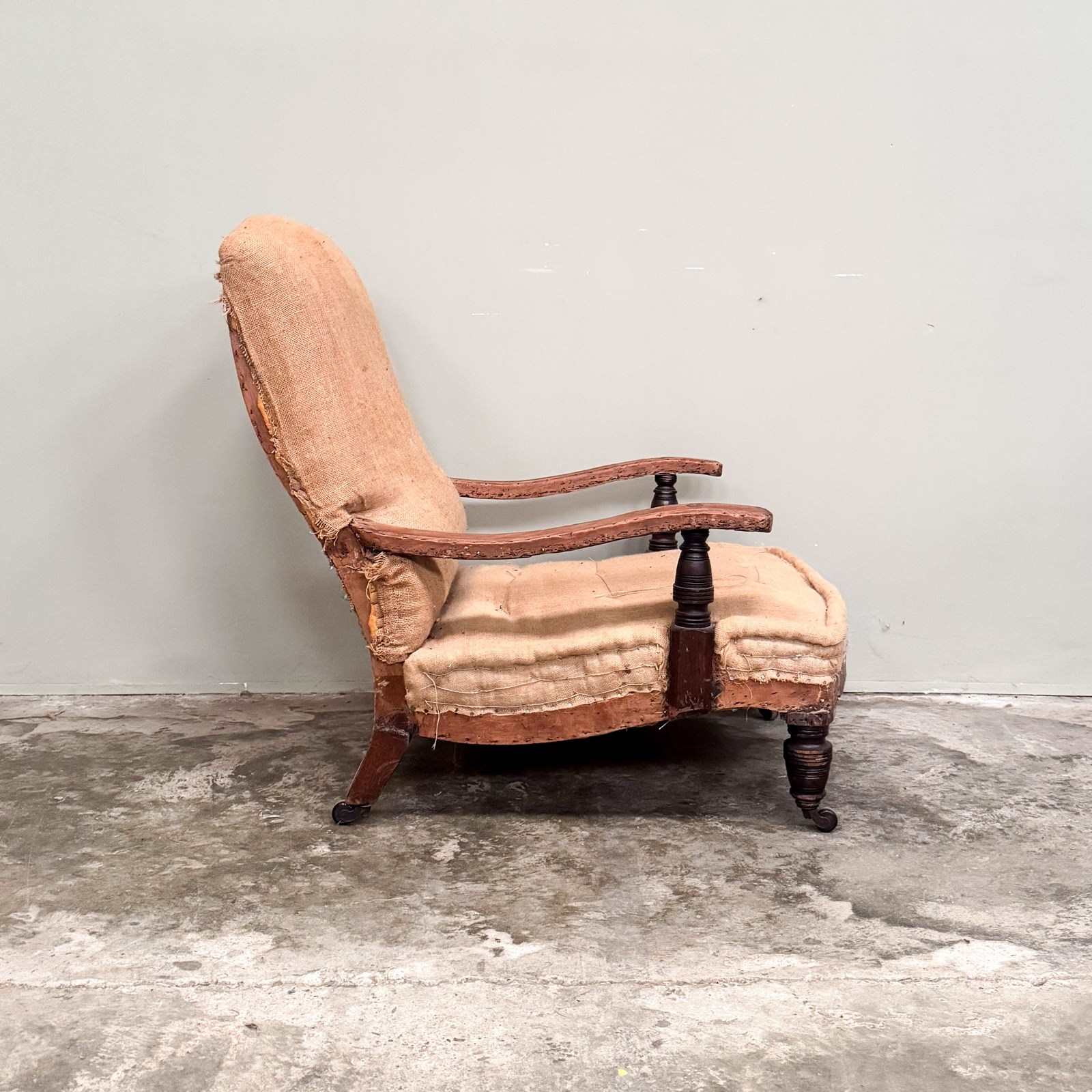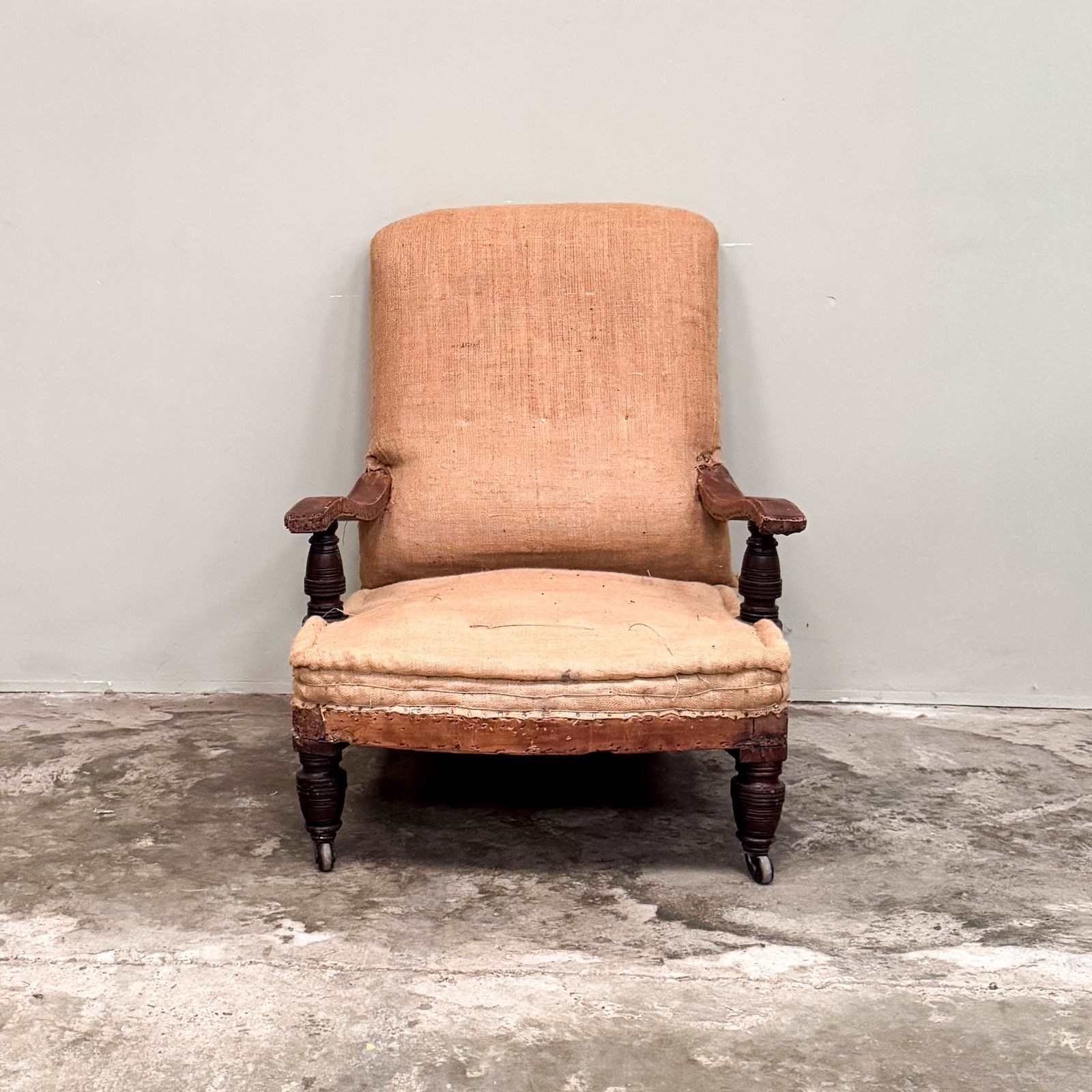 Well proportioned open arm library chair, with sprung back and seat. Standing on turned mahogany legs and brass castors. Turned arms with sweeping arm rests. Circa 1880
