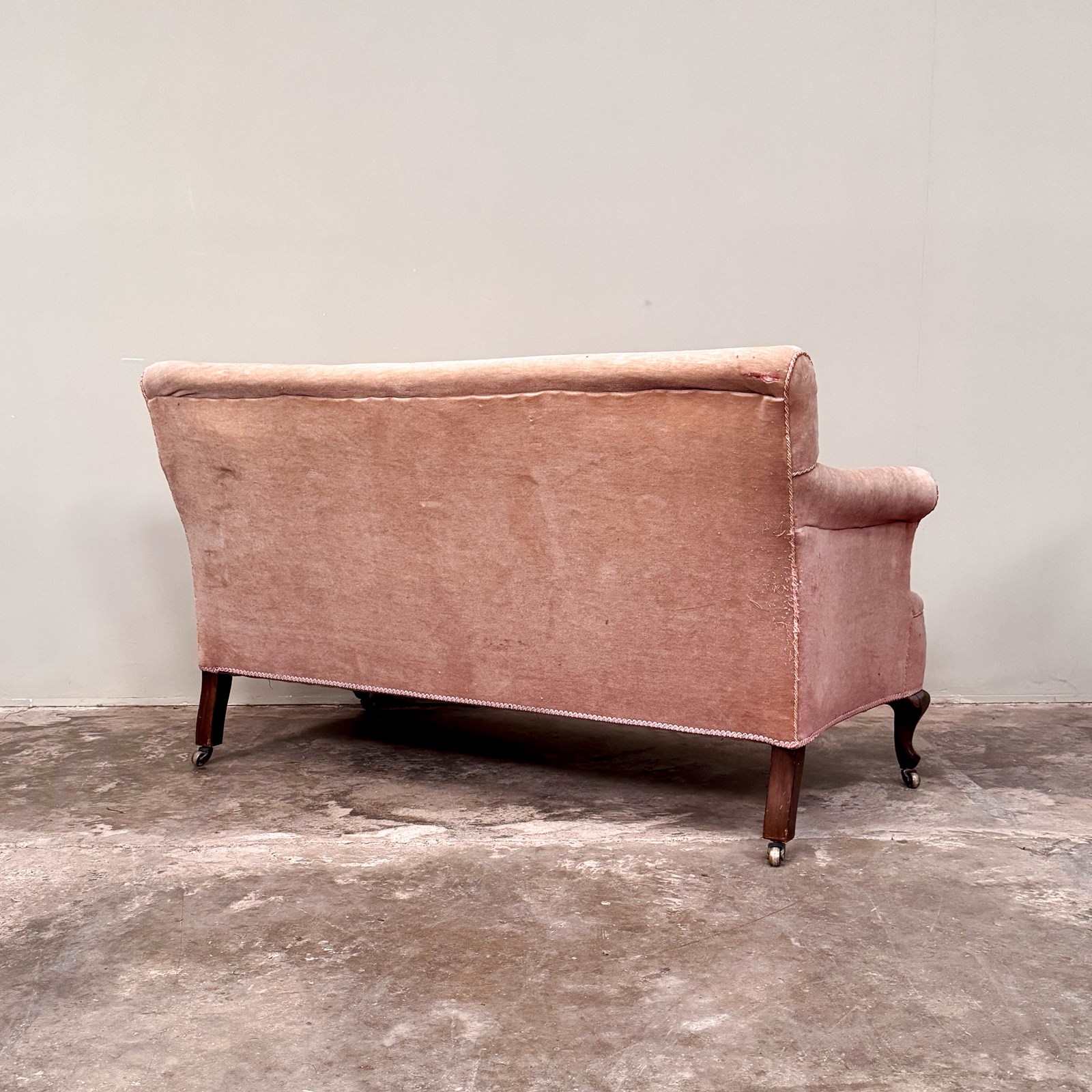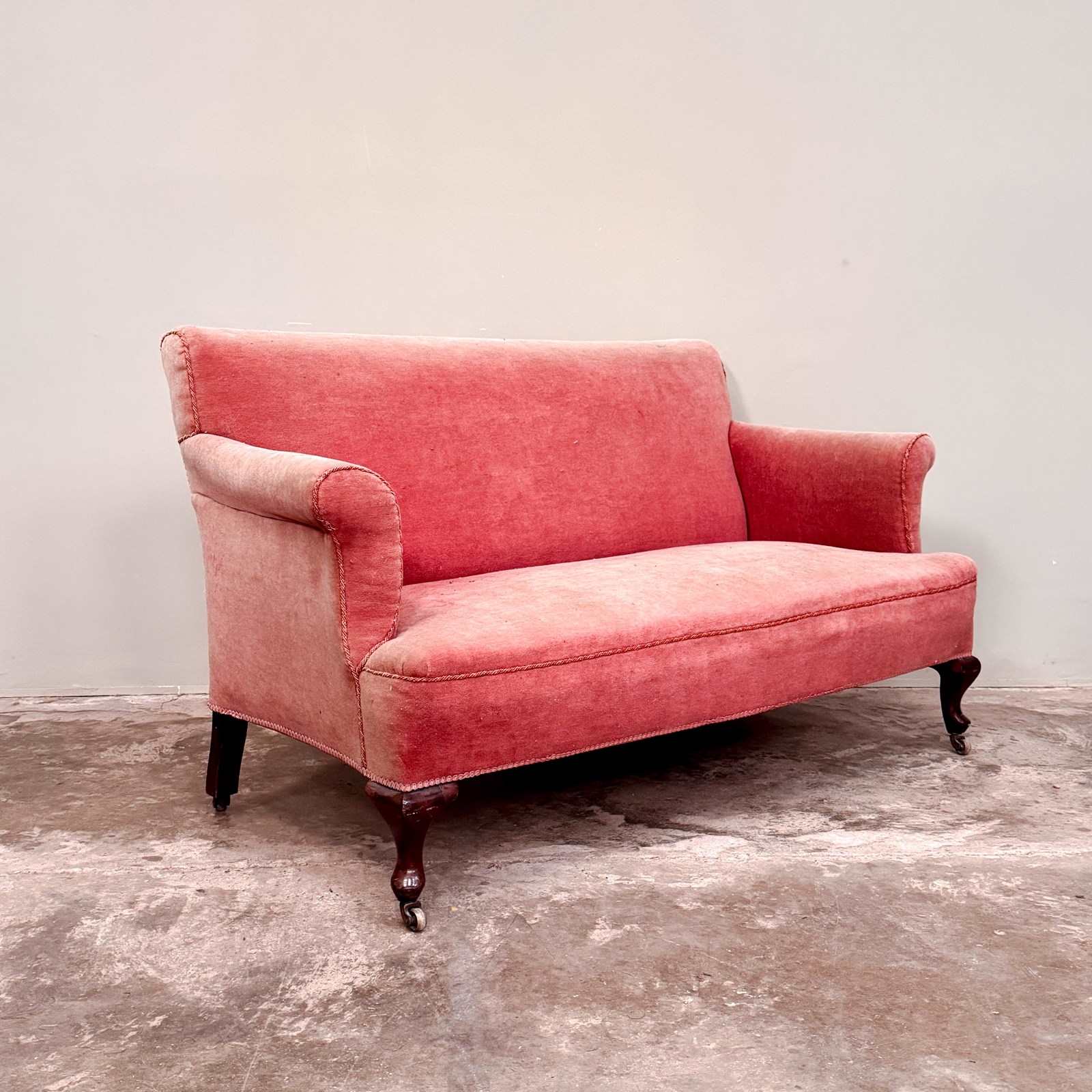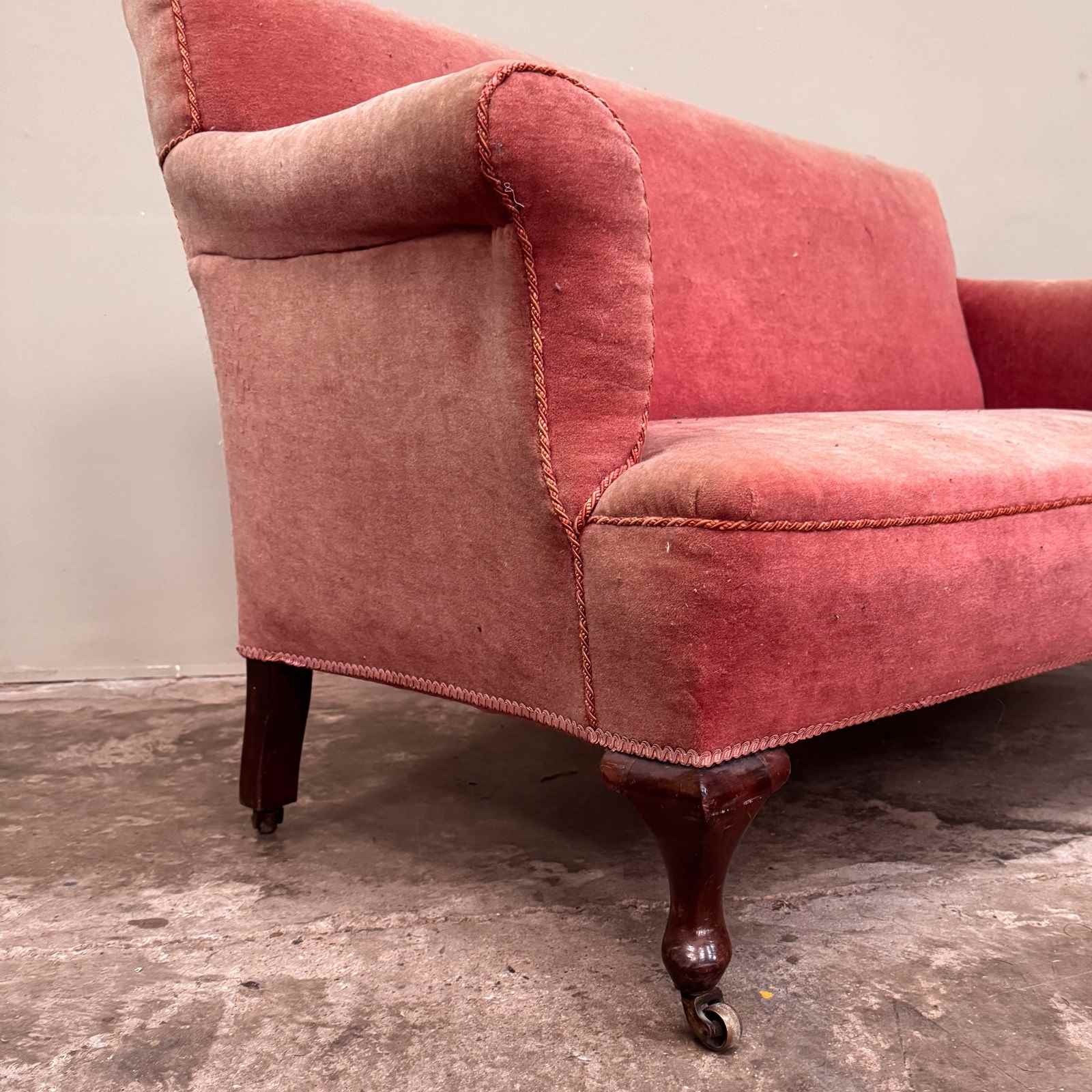 Very pretty, petite two seater English sofa. Standing on walnut cabriole leg sand original brass castors. With scroll arm and sprung back and seat. Circa 1920s