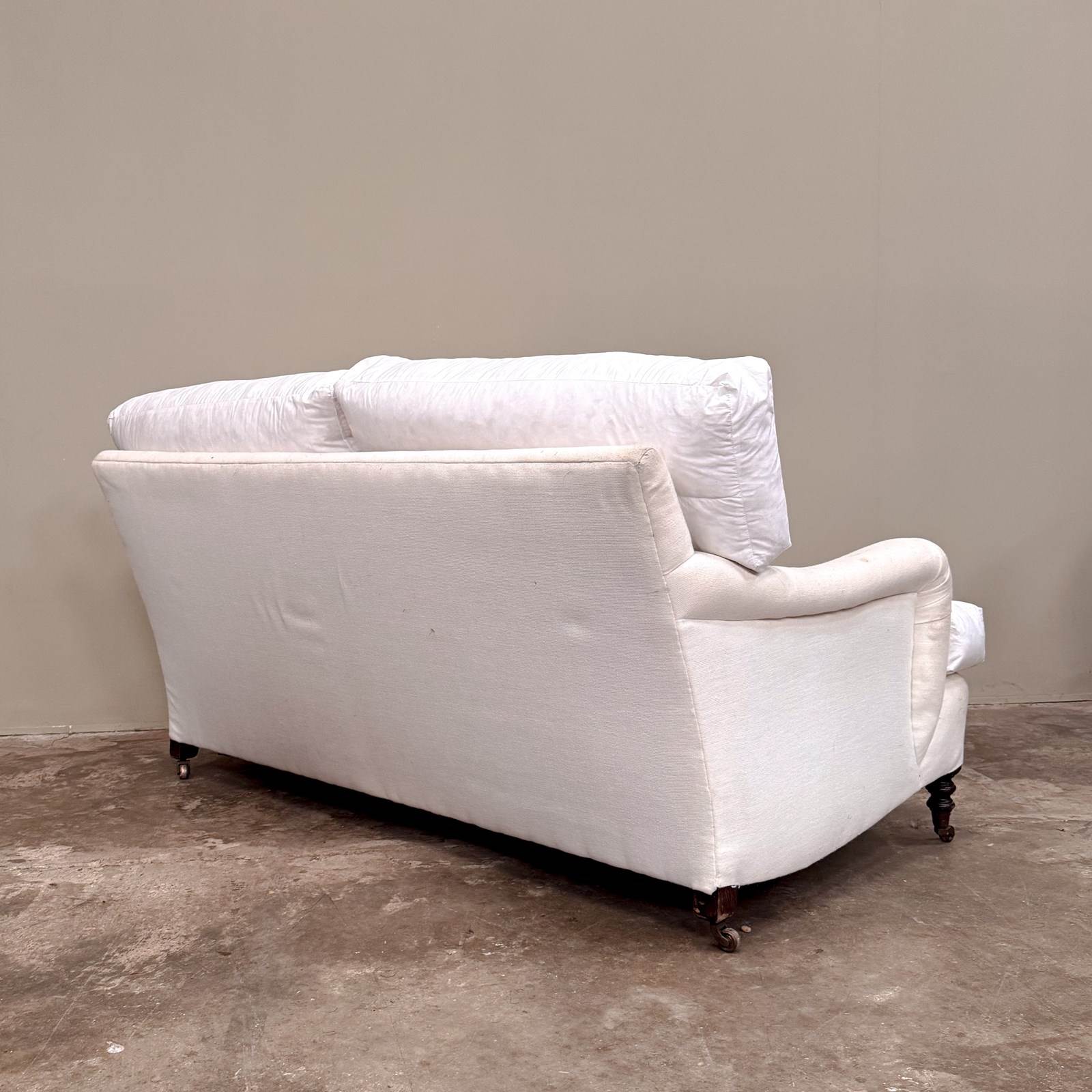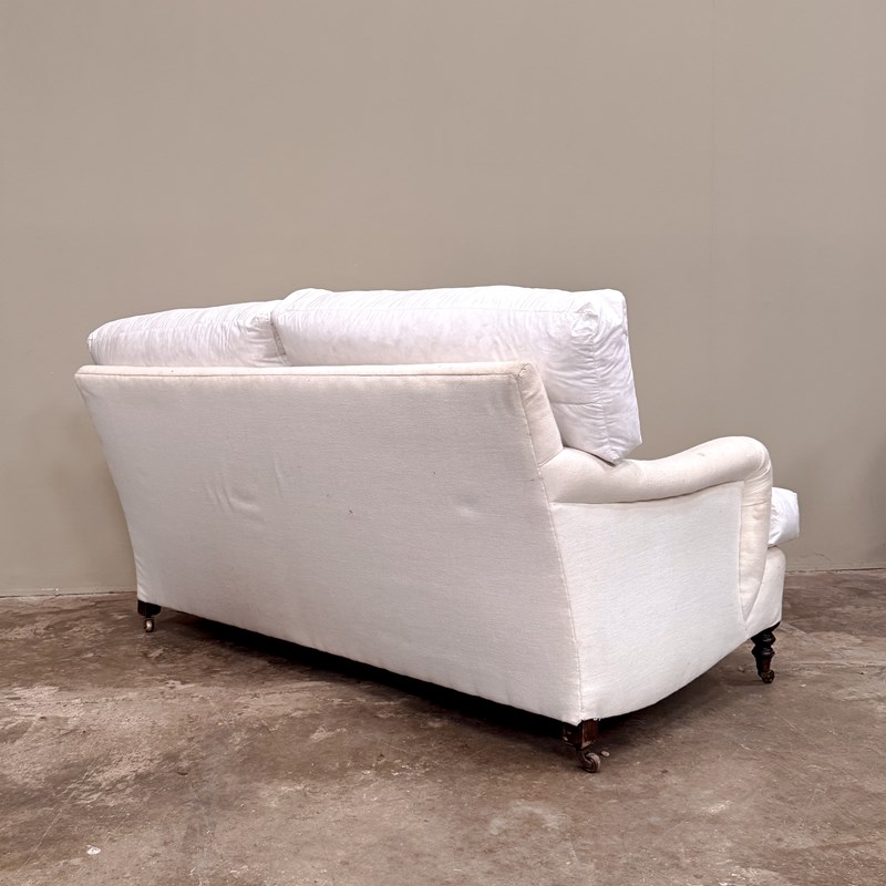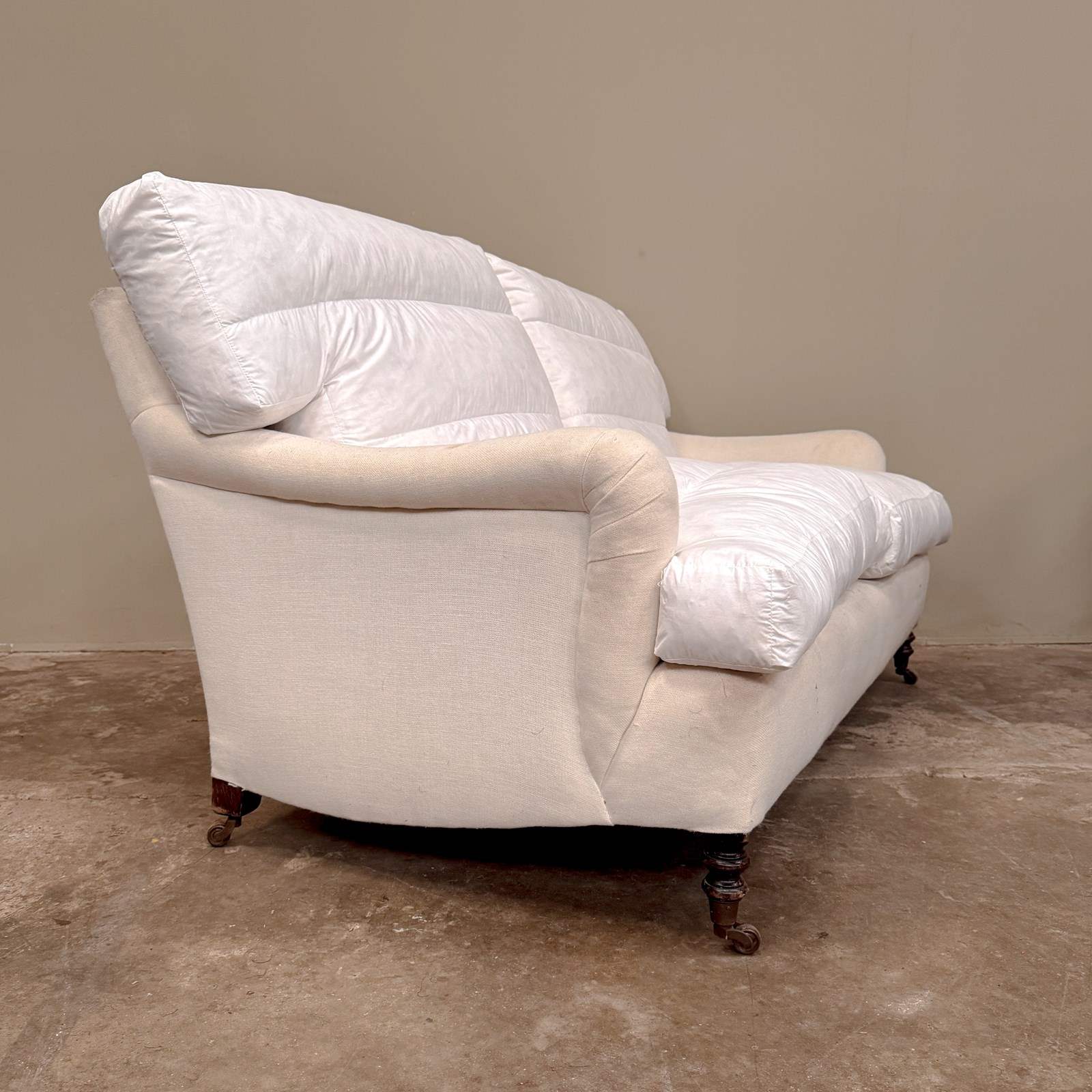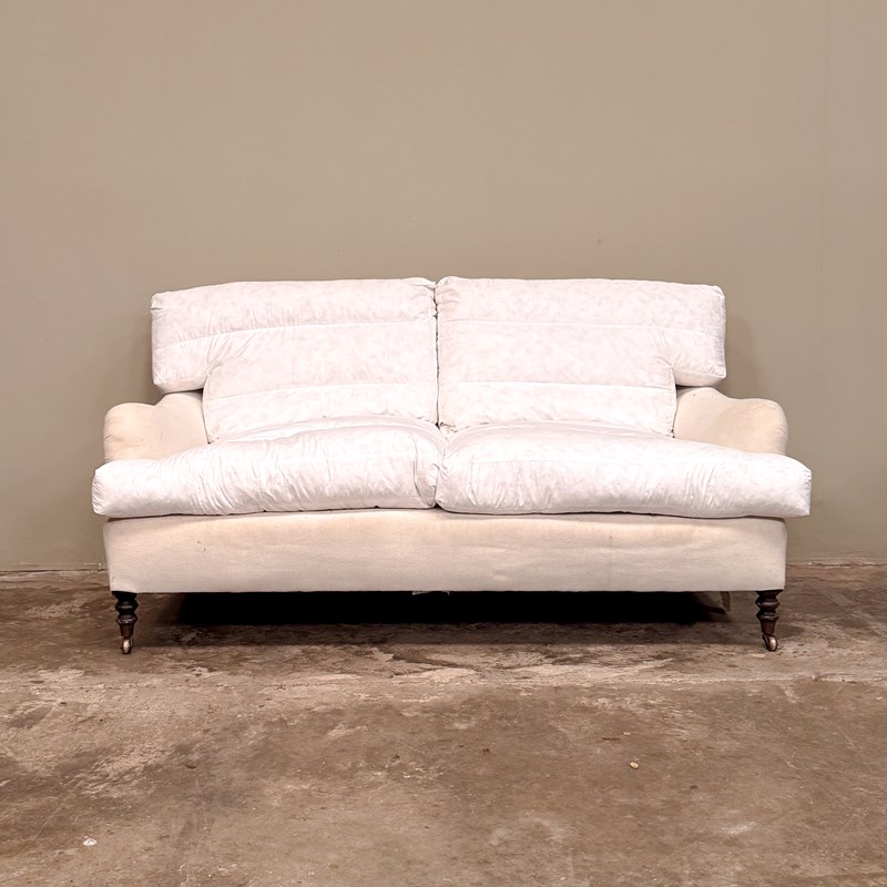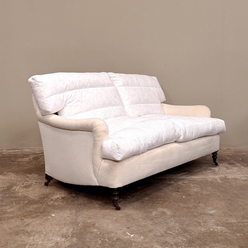 Two seater George Smith signature sofa, with standard arm. Sprung seat and feather and down seat and back cushions.