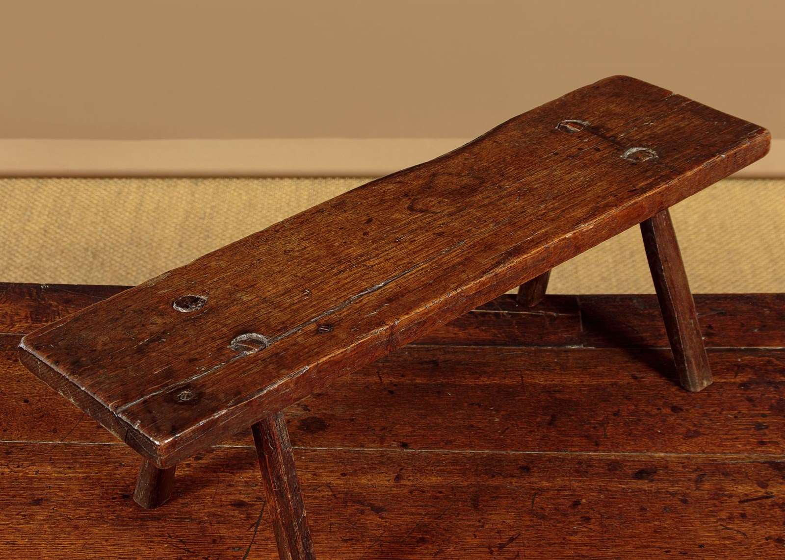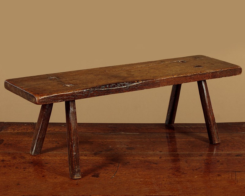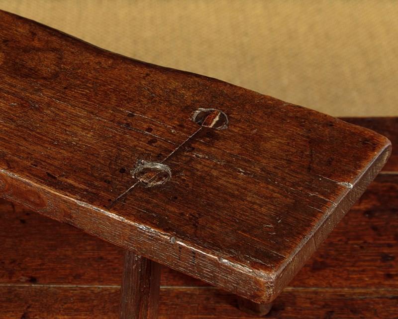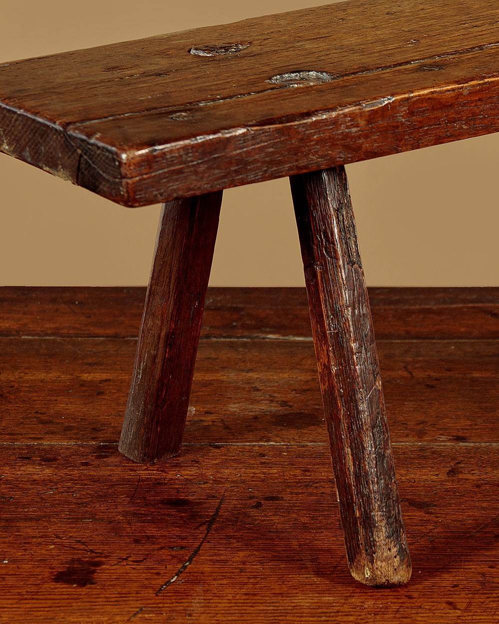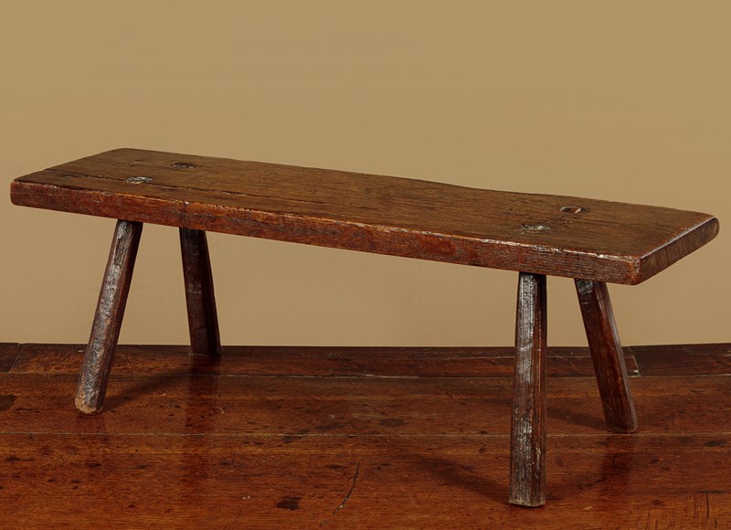 Lovely 18th.c. oak low stool or step c.1760. 28" x 8" top (a little longer than most we see) raised on the original short splayed legs with wedged tenon joints. Two screws to an old repair to the top, other wise very good condition, solid and sturdy with excellent colour and patina. Cleaned and waxed in our workshops.