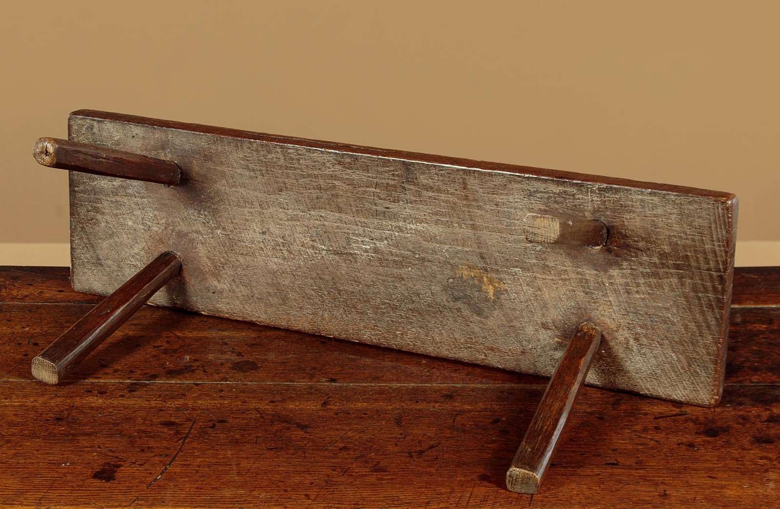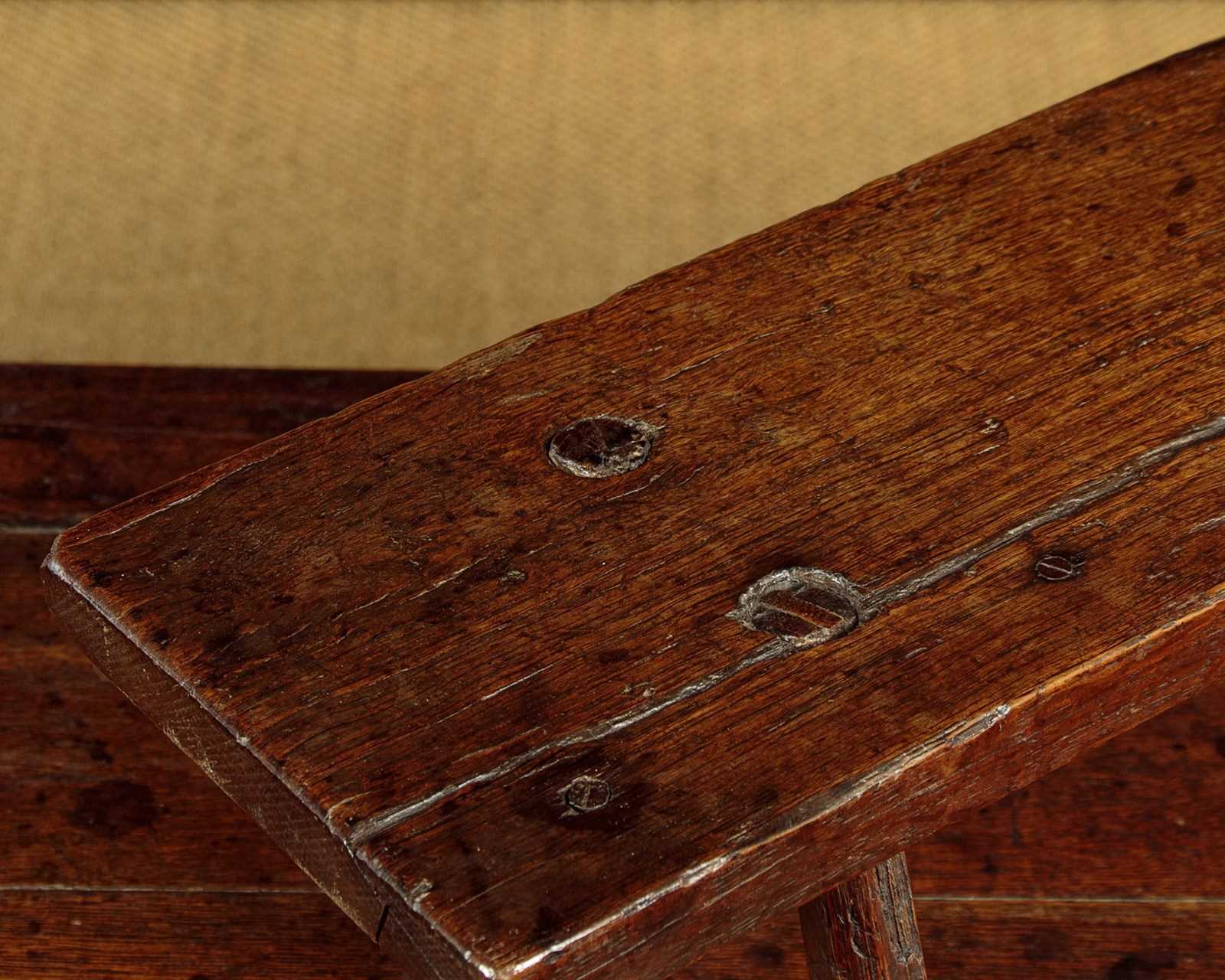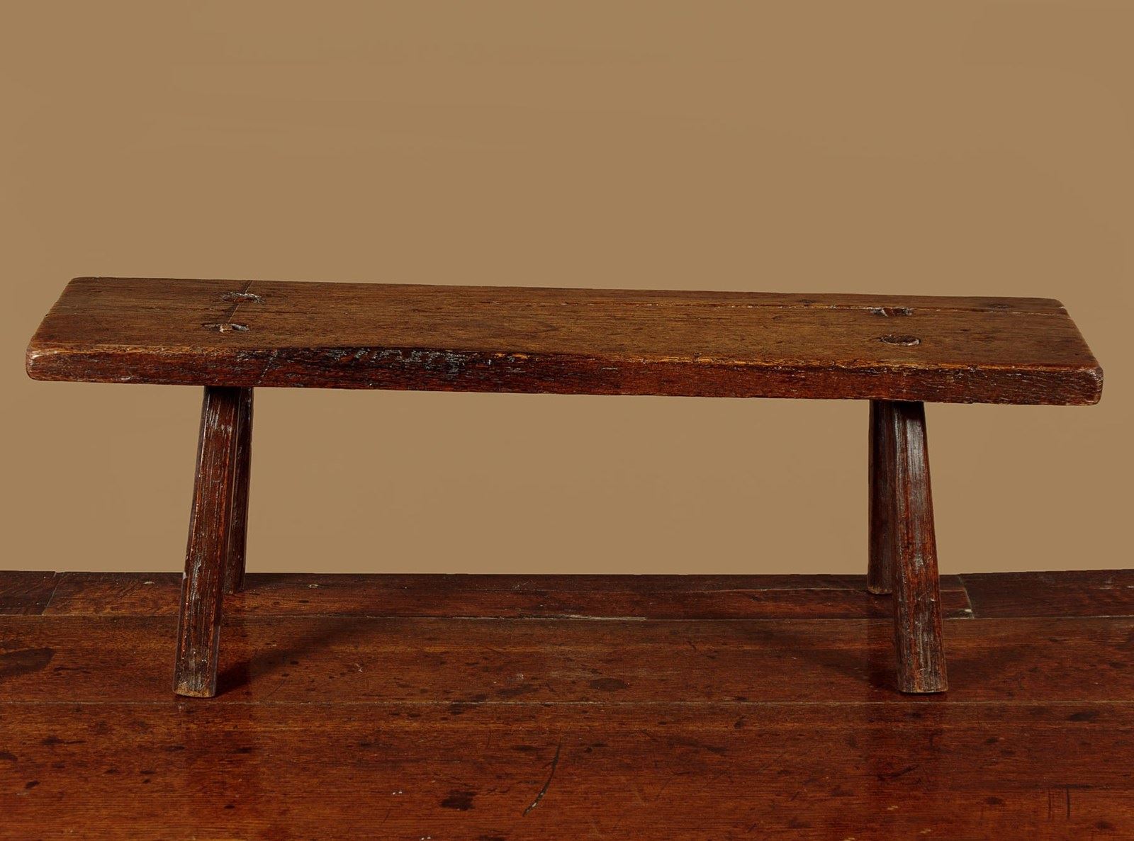 Lovely 18th.c. oak low stool or step c.1760. 28" x 8" top (a little longer than most we see) raised on the original short splayed legs with wedged tenon joints. Two screws to an old repair to the top, other wise very good condition, solid and sturdy with excellent colour and patina. Cleaned and waxed in our workshops.