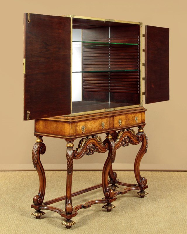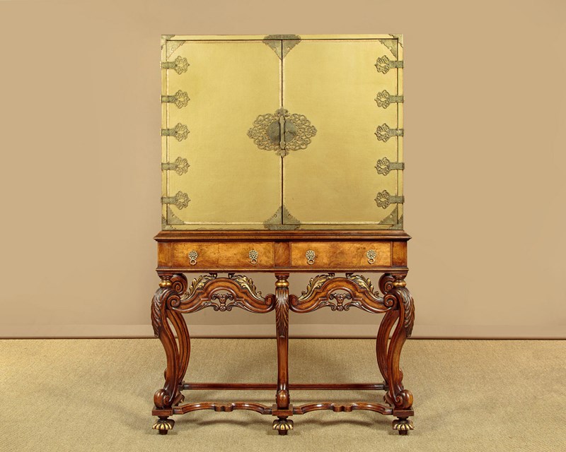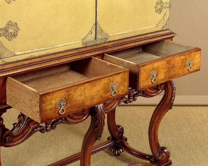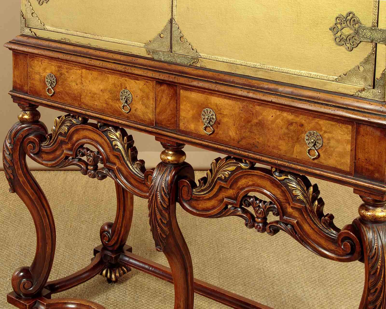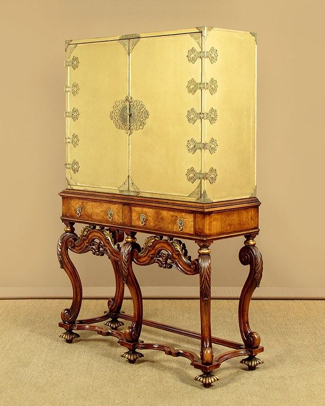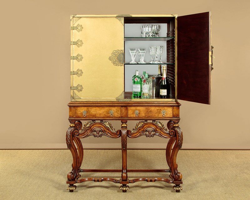 Good quality cocktail or drinks cabinet in the style of an early 18th.c. cabinet on stand c.1930. Two door cupboard top fitted inside with two adjustable plate glass shelves (depth 14"). Cloth covered exterior painted gold and with 10 decorative pierced and engraved brass hinges, large matching escutcheon plate and corner bindings. Raised on a splendid carved and gilded walnut stand with two oak lined drawers. Carved and pierced apron below the drawers with gilded acanthus leaves. Raised on cabriole legs font and rear, joined with shaped and moulded stretchers for strength, all with carved acanthus detail and scrolling terminals over gilded and gadroon carved feet. Excellent condition, key supplied.