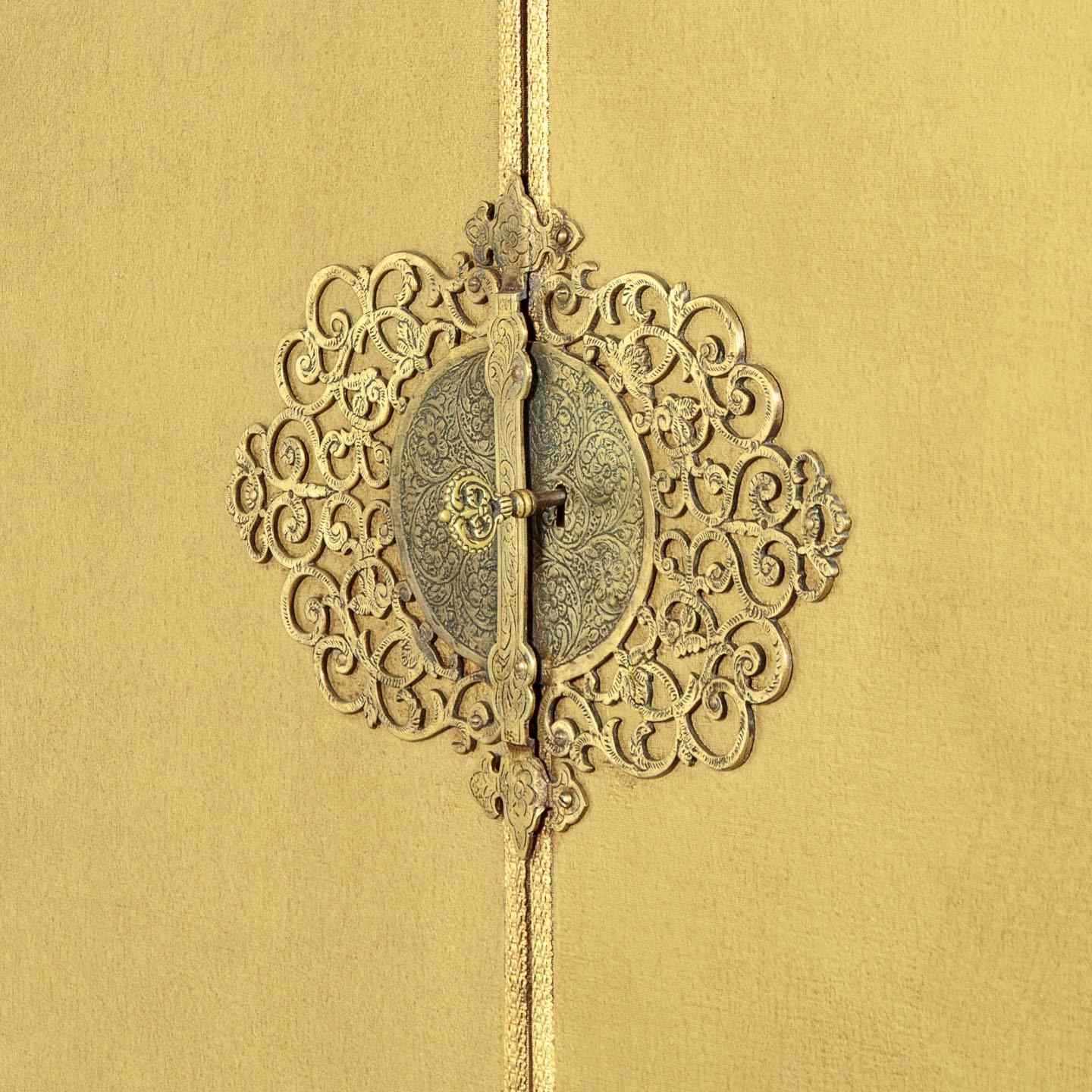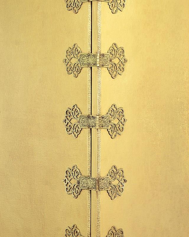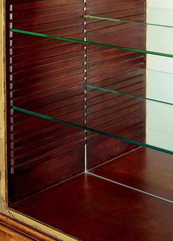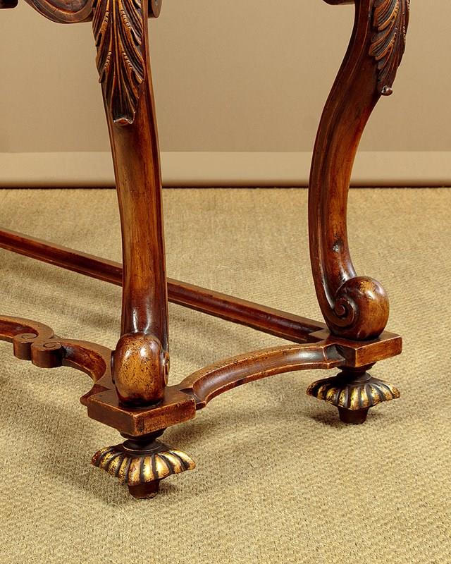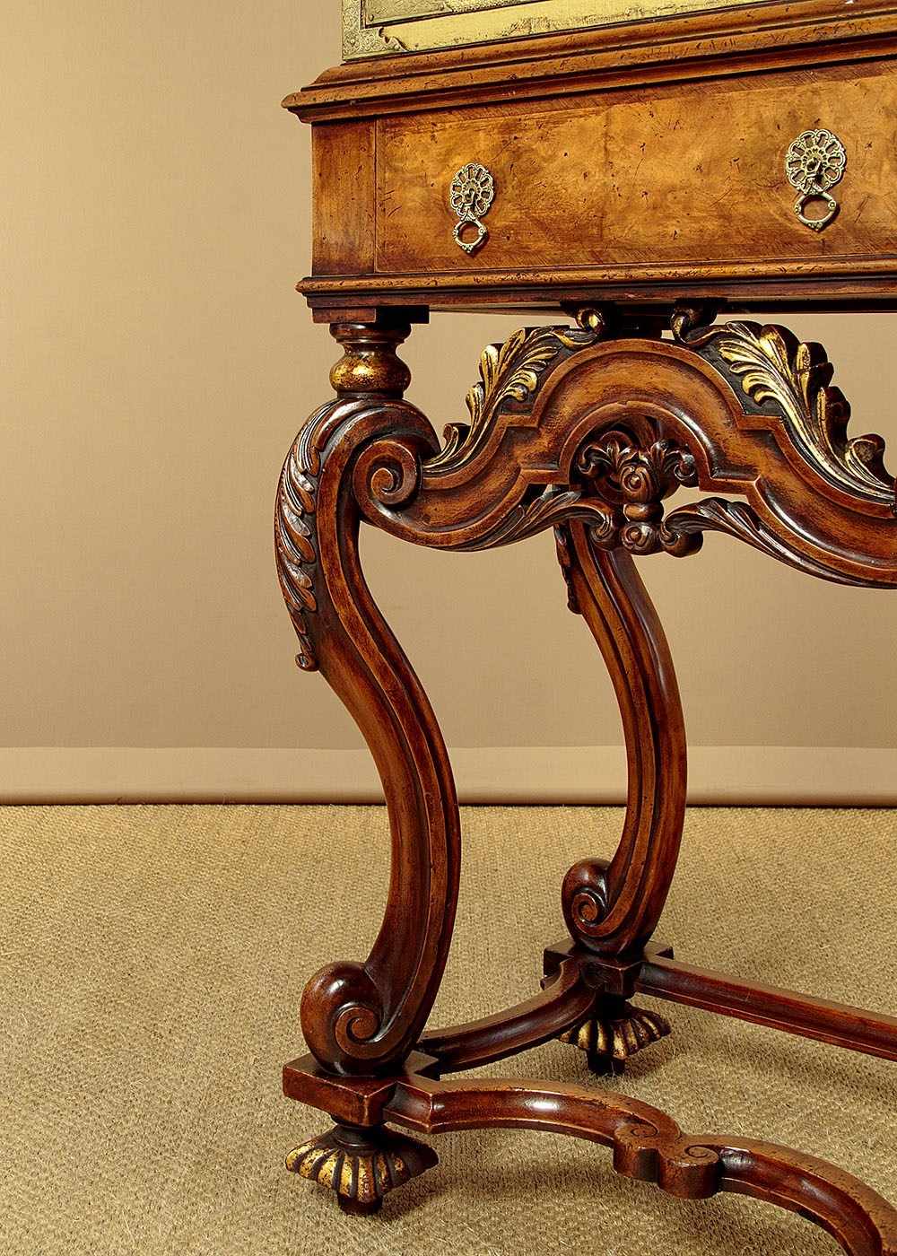Good quality cocktail or drinks cabinet in the style of an early 18th.c. cabinet on stand c.1930. Two door cupboard top fitted inside with two adjustable plate glass shelves (depth 14"). Cloth covered exterior painted gold and with 10 decorative pierced and engraved brass hinges, large matching escutcheon plate and corner bindings. Raised on a splendid carved and gilded walnut stand with two oak lined drawers. Carved and pierced apron below the drawers with gilded acanthus leaves. Raised on cabriole legs font and rear, joined with shaped and moulded stretchers for strength, all with carved acanthus detail and scrolling terminals over gilded and gadroon carved feet. Excellent condition, key supplied.