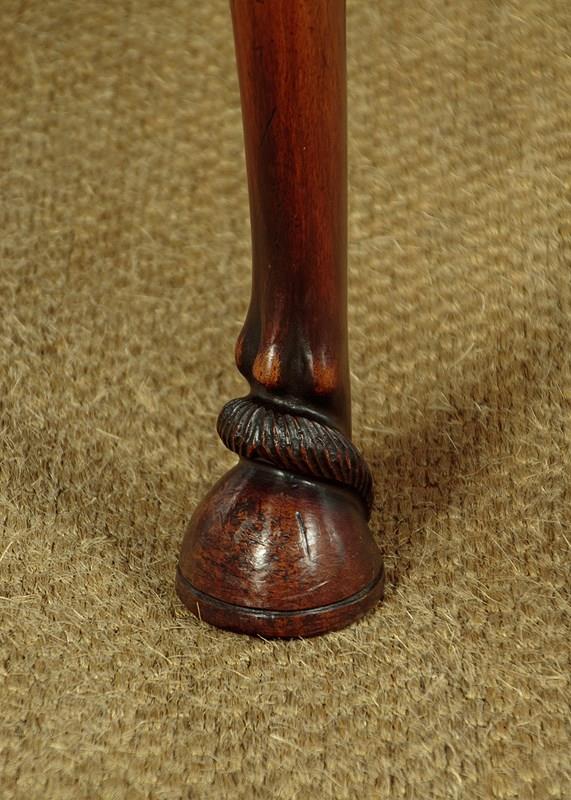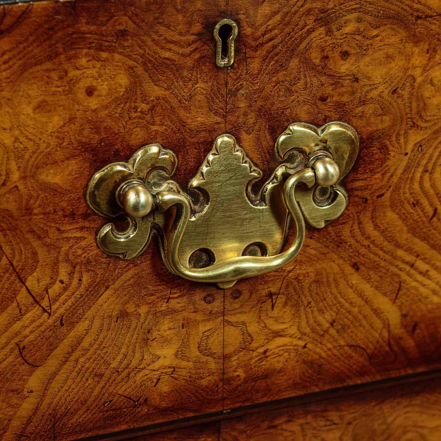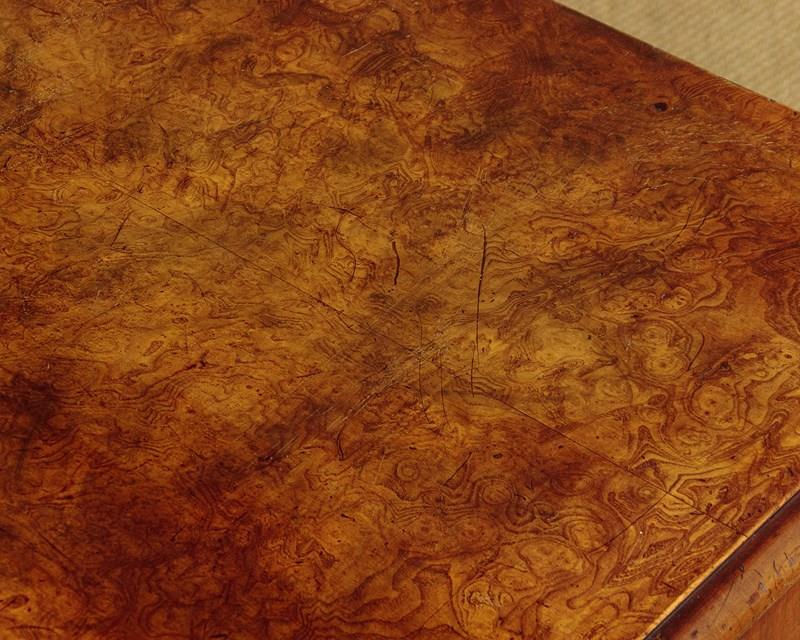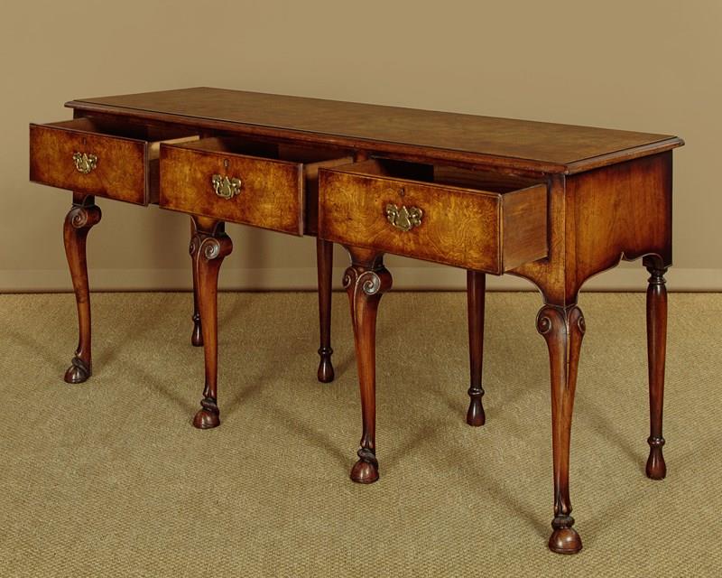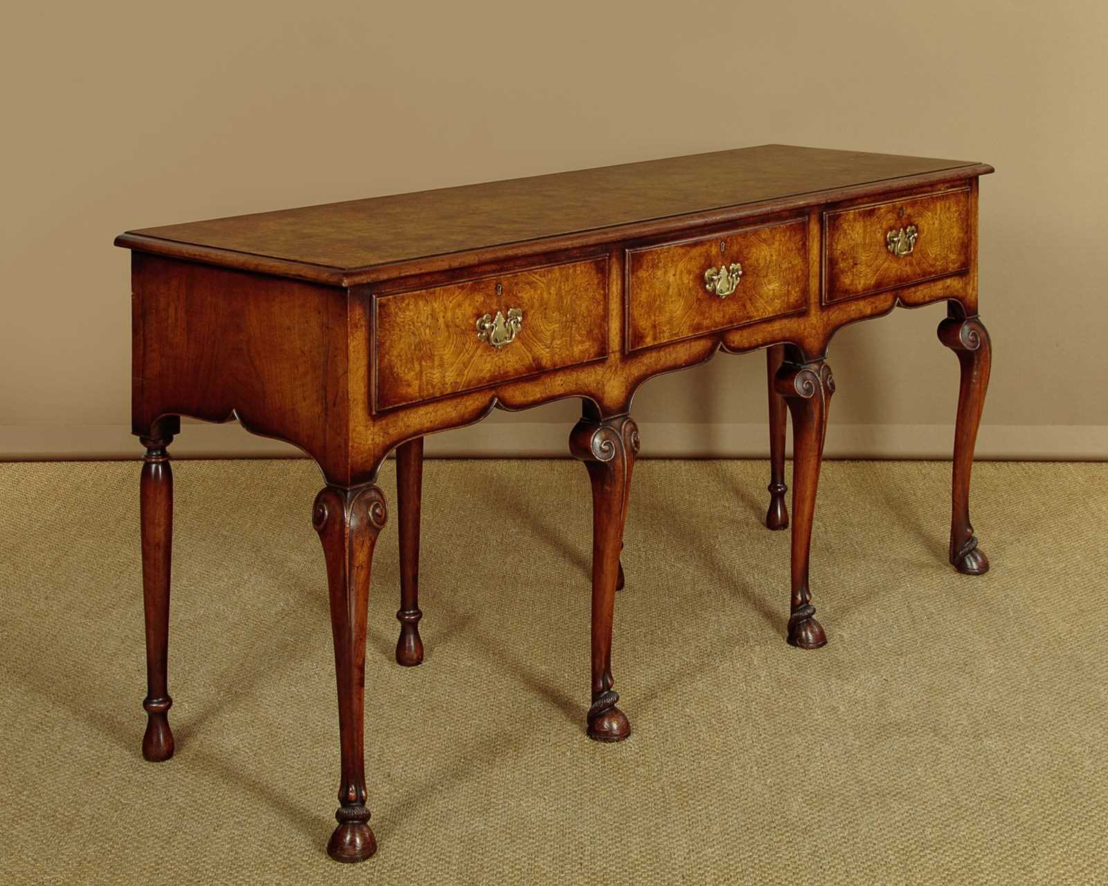 Unusual 18th.c. style dresser base or side table c.1960. Top veneered in highly figured and symmetrically arranged burr elm with a deep moulded edge. Burr elm front with three drawers, note how the grain is matched across the drawer fronts, with Georgian pattern brass handles. Oak drawer linings. Very attractive ogee arch shaped apron with a cockbeaded edge below the drawers and continued at the sides. Raised on superb George II style cabriole front legs in walnut with splendid carved hoof feet. Turned and tapering legs to the back edge. Some old wear and scratches to the top. Otherwise excellent colour and condition, cleaned and waxed in our workshops.