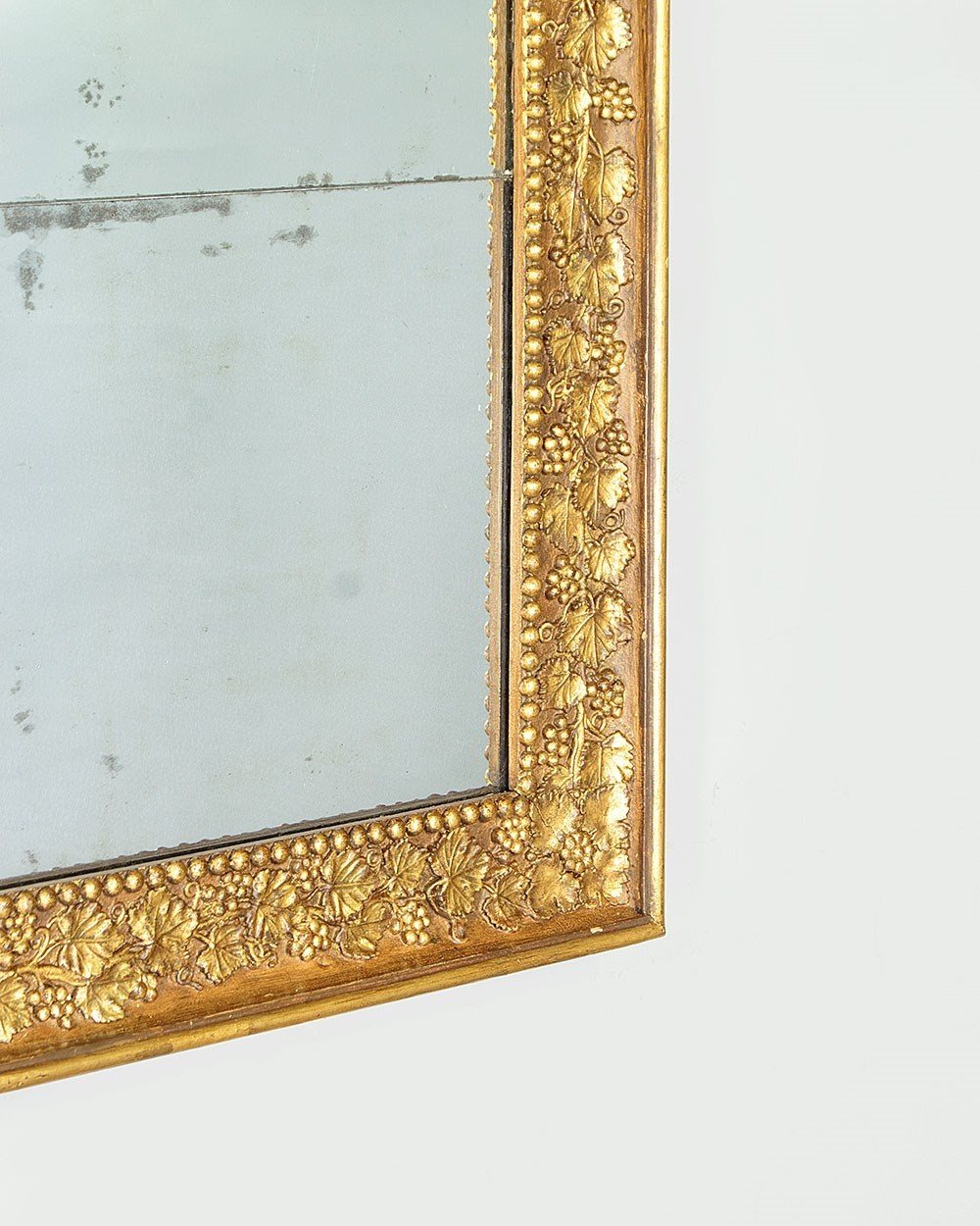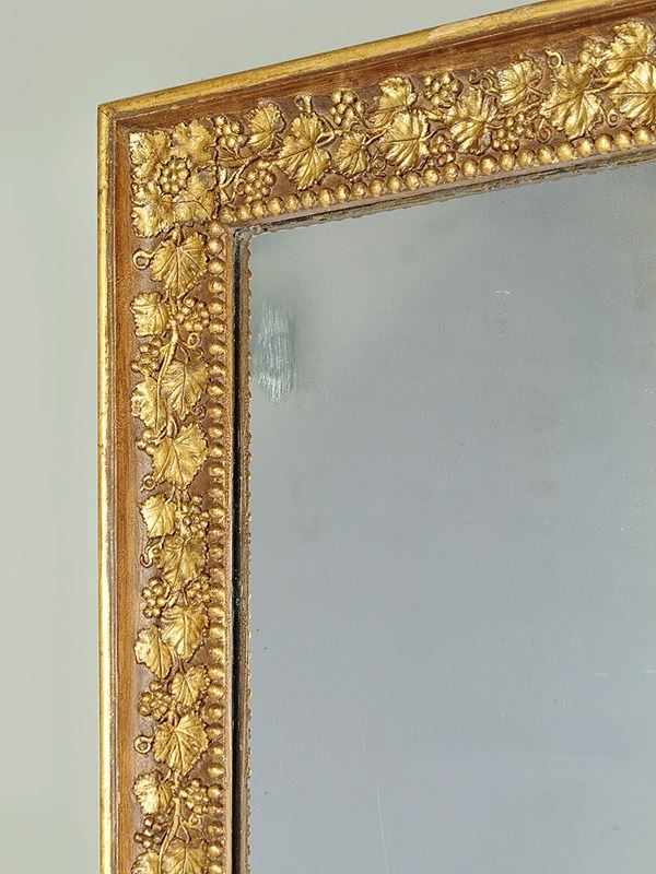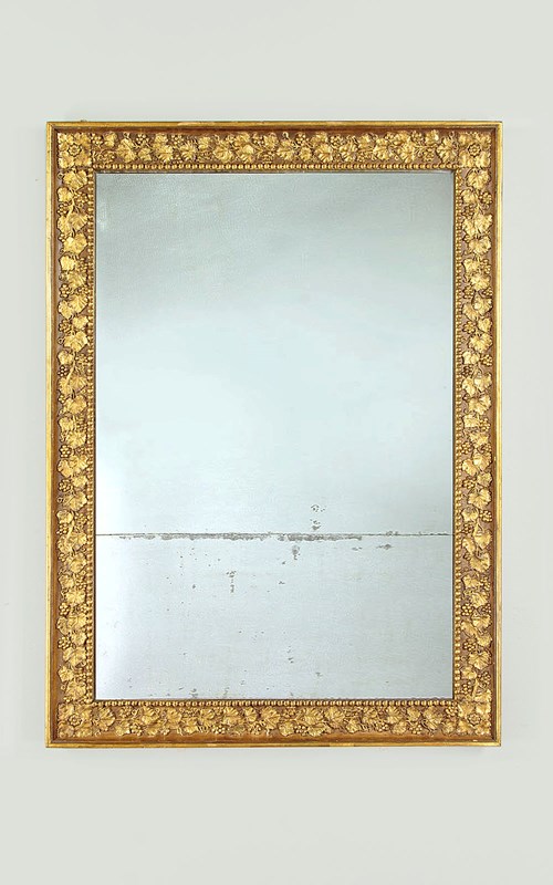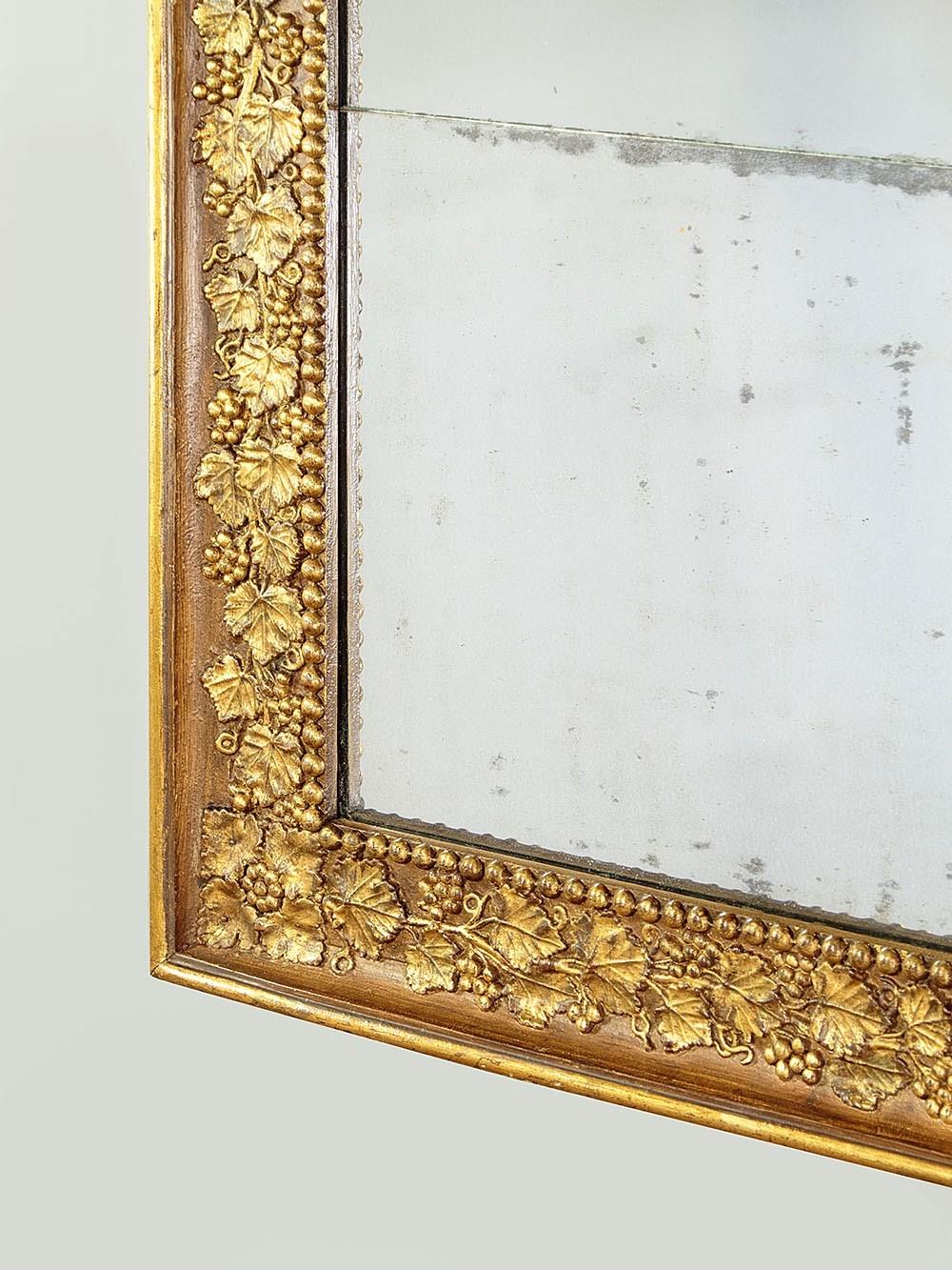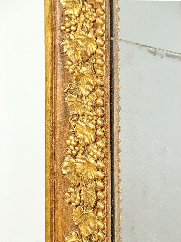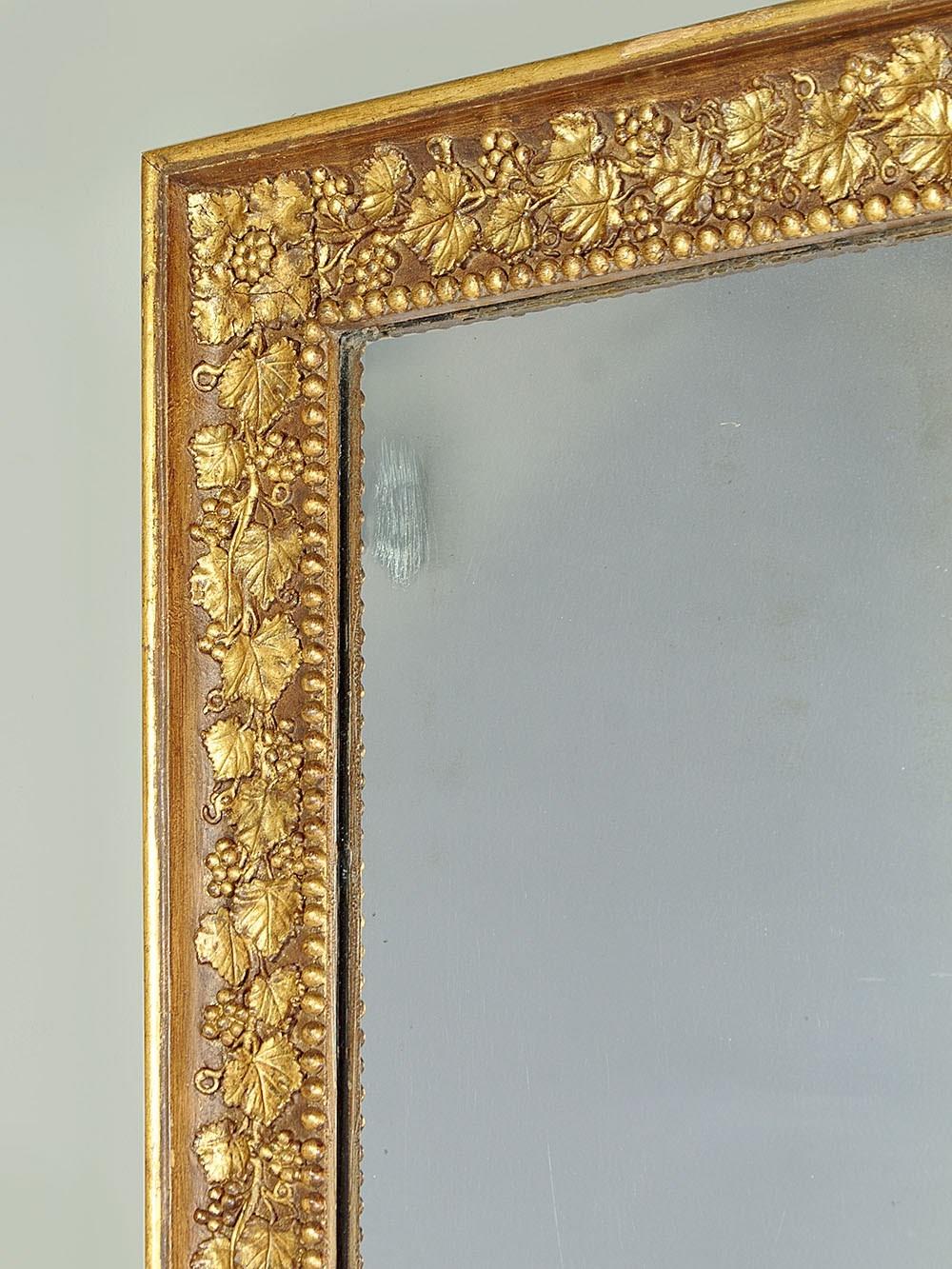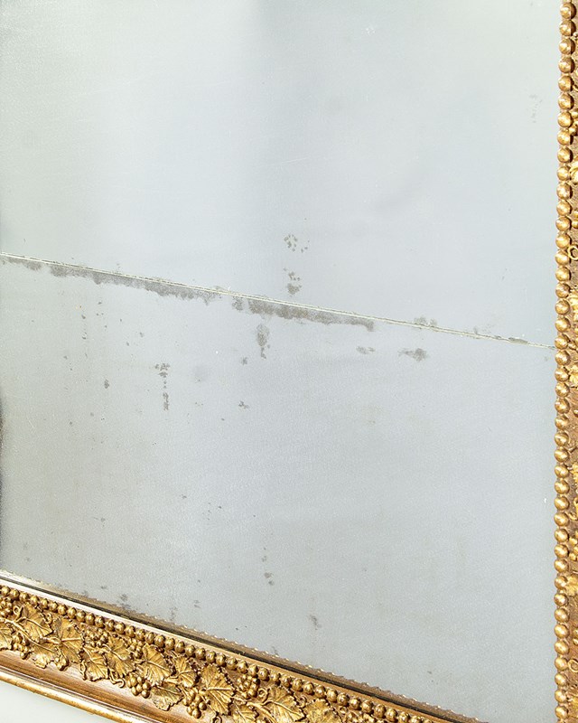 Mid 19th.c. French wall mirror c.1840. Original 29" x 43" two piece mirror plate with the distinctive sparkle of old mercury glass. Within a wooden frame with dense gesso work grape and vine leaf detail. Attractive gilt finish worn and rubbed in places. Original backboards. Some obvious tarnish and scratches to the mirror, otherwise good condition, cleaned and waxed in our workshops.