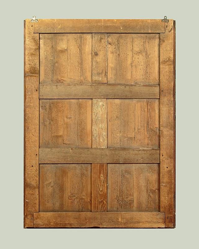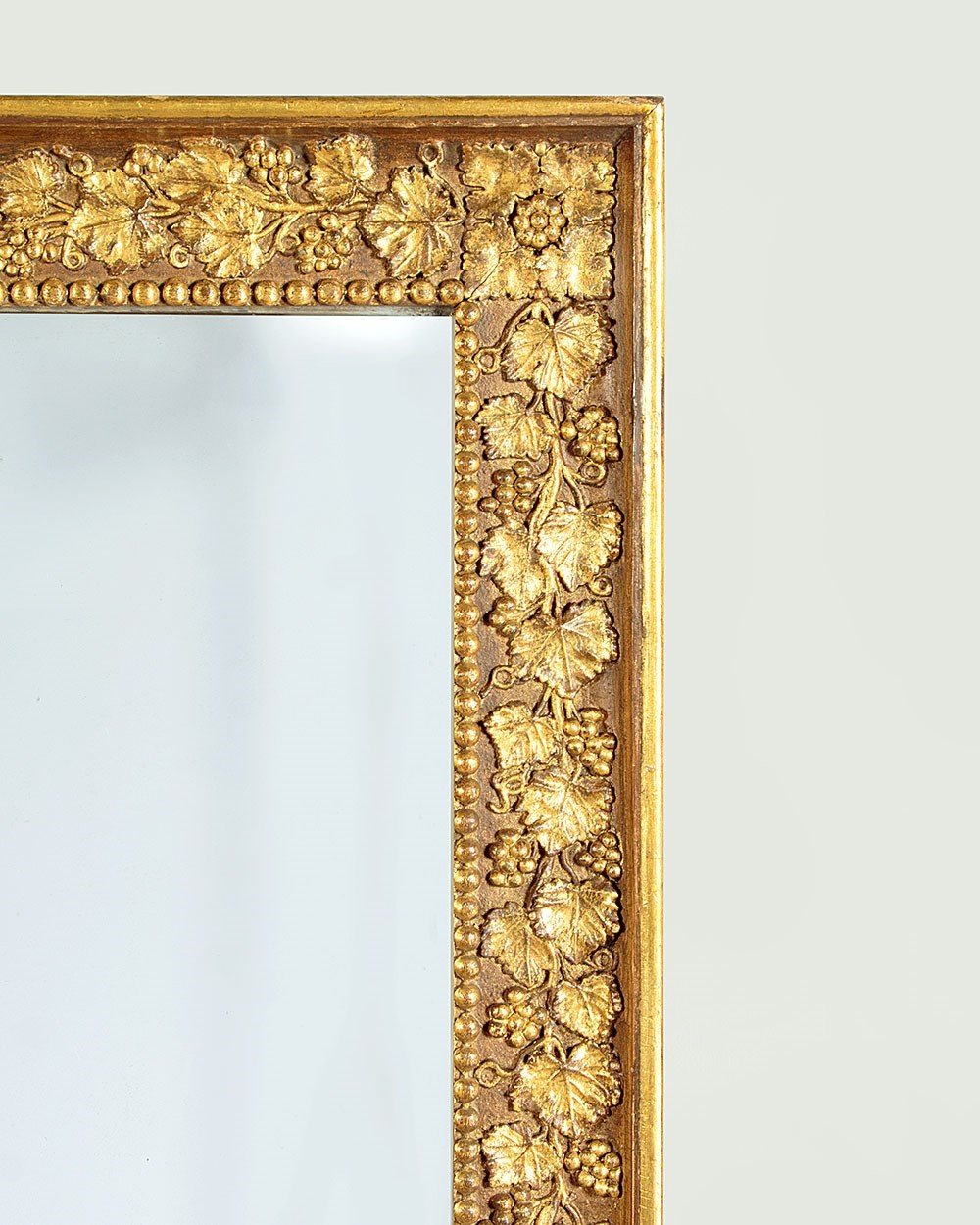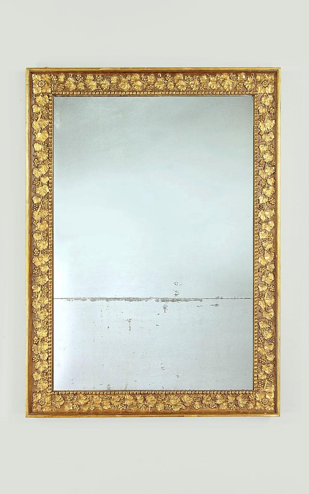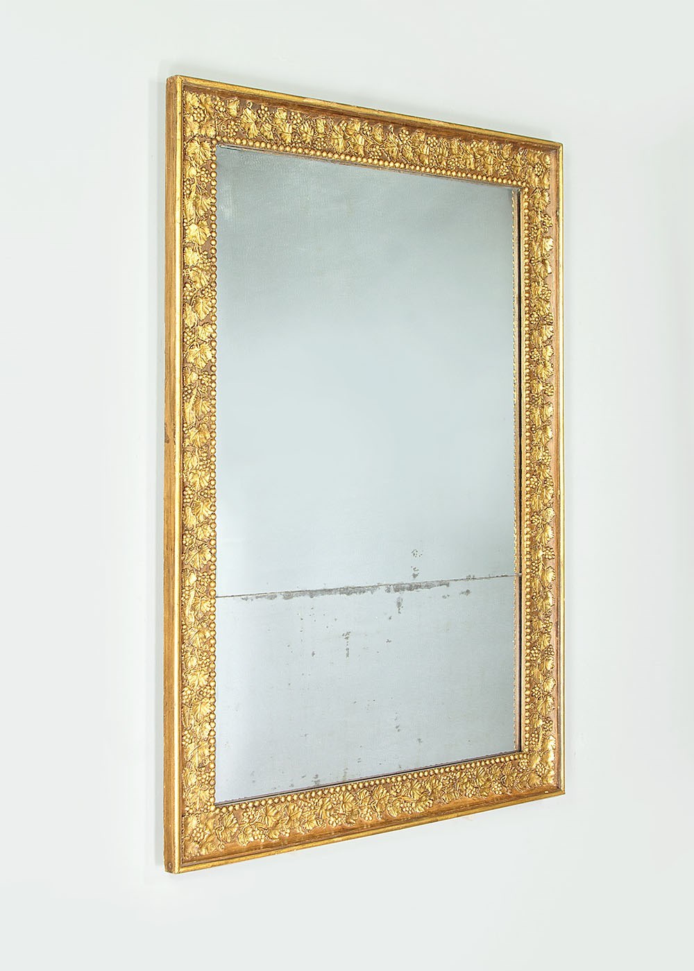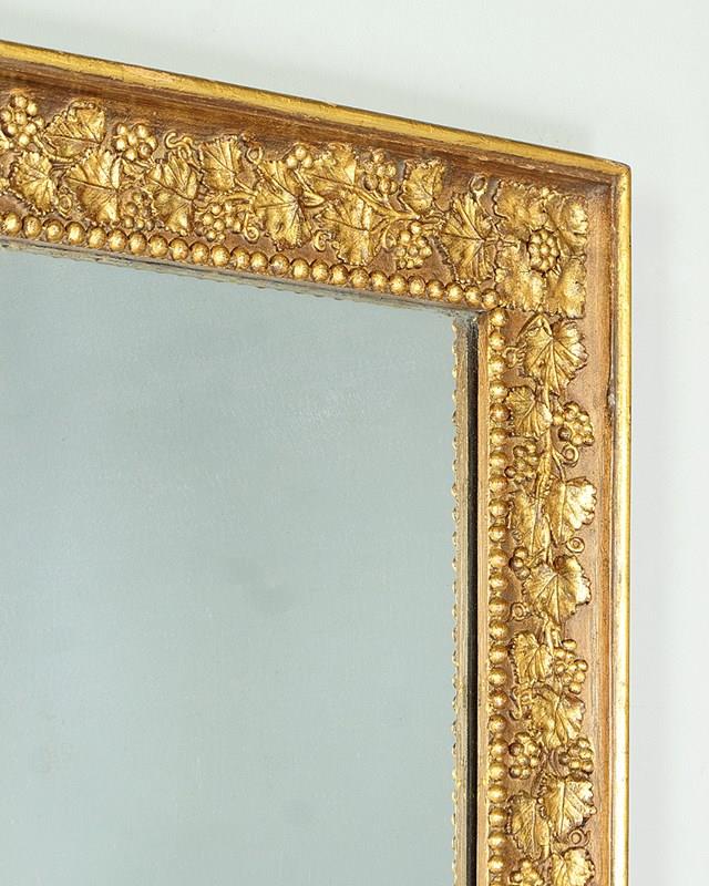 Mid 19th.c. French wall mirror c.1840. Original 29" x 43" two piece mirror plate with the distinctive sparkle of old mercury glass. Within a wooden frame with dense gesso work grape and vine leaf detail. Attractive gilt finish worn and rubbed in places. Original backboards. Some obvious tarnish and scratches to the mirror, otherwise good condition, cleaned and waxed in our workshops.