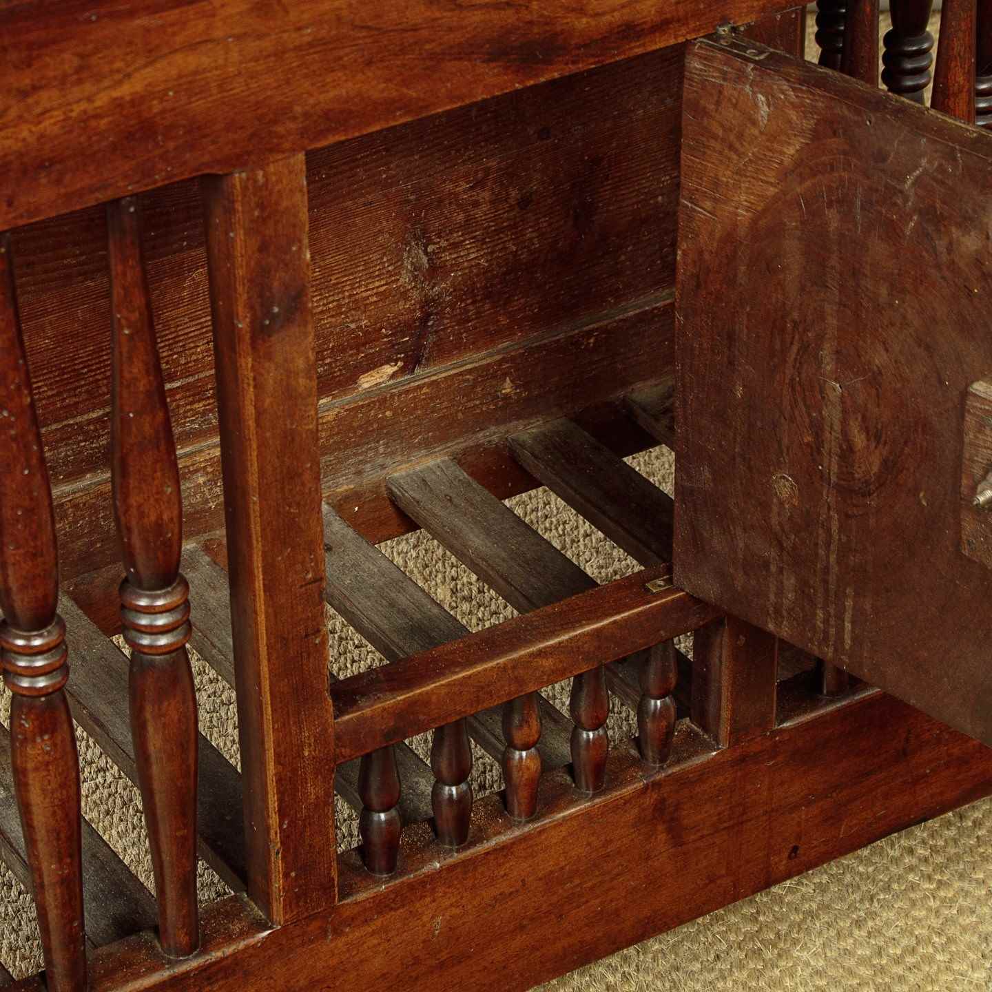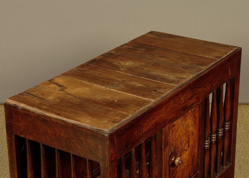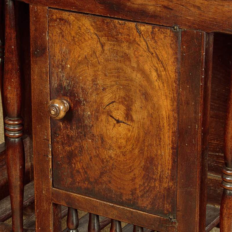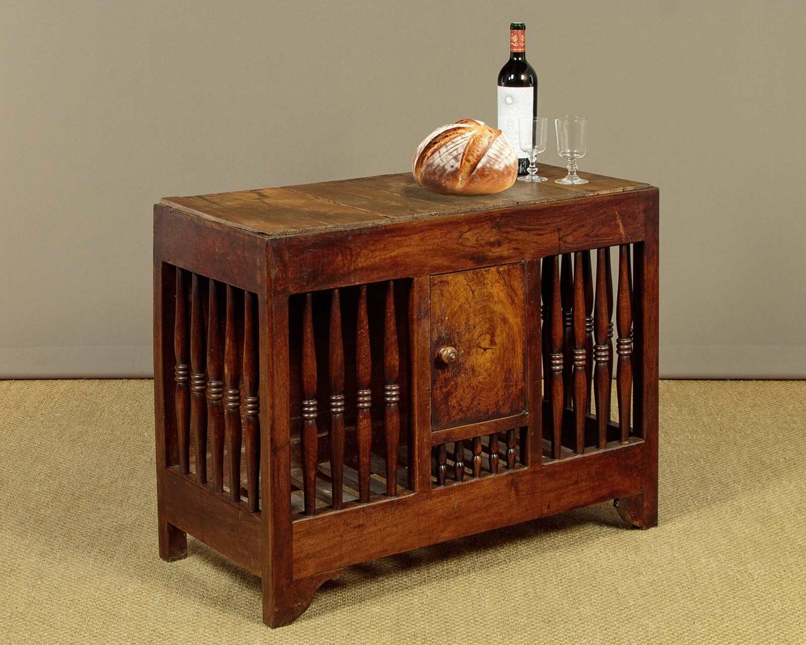 Early 19th.c. walnut panetiere or bread safe c.1820. Used for cooling and storing freshly baked bread for which it would be hung on a wall away from pests, the open sides and slatted base helping to prevent humidity which would cause the bread to spoil. A simple example of the form with 18 turned spindles to the front and sides between straight rails. Small door in the front with a twist catch attached to the knob. Pine top and back panel with holes in the rear for fixing to the wall. Missing a portion of the shaped bracket inside the right hand front foot. Otherwise very good original colour and condition. Cleaned and waxed in our workshops.