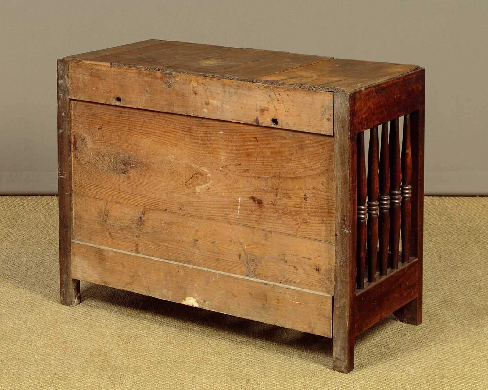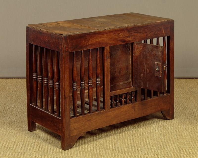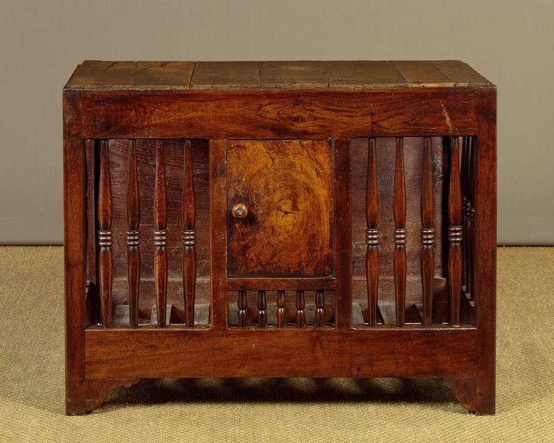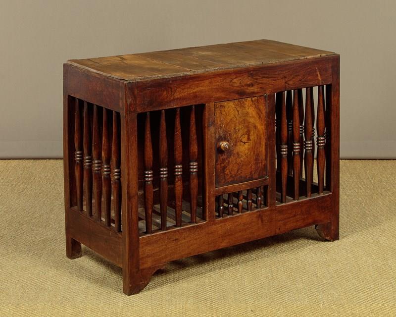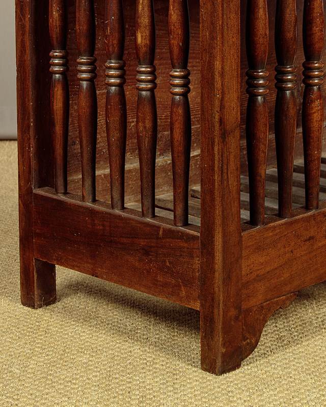 Early 19th.c. walnut panetiere or bread safe c.1820. Used for cooling and storing freshly baked bread for which it would be hung on a wall away from pests, the open sides and slatted base helping to prevent humidity which would cause the bread to spoil. A simple example of the form with 18 turned spindles to the front and sides between straight rails. Small door in the front with a twist catch attached to the knob. Pine top and back panel with holes in the rear for fixing to the wall. Missing a portion of the shaped bracket inside the right hand front foot. Otherwise very good original colour and condition. Cleaned and waxed in our workshops.