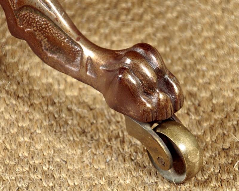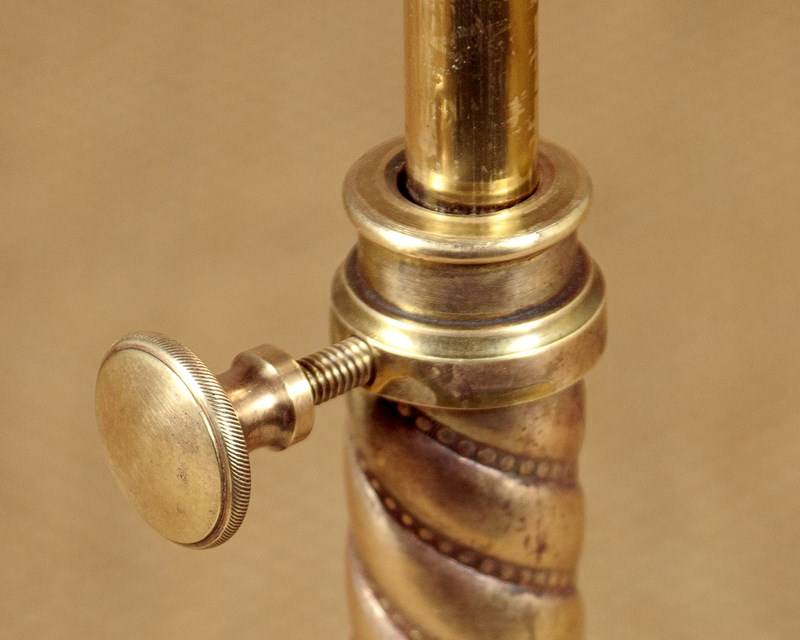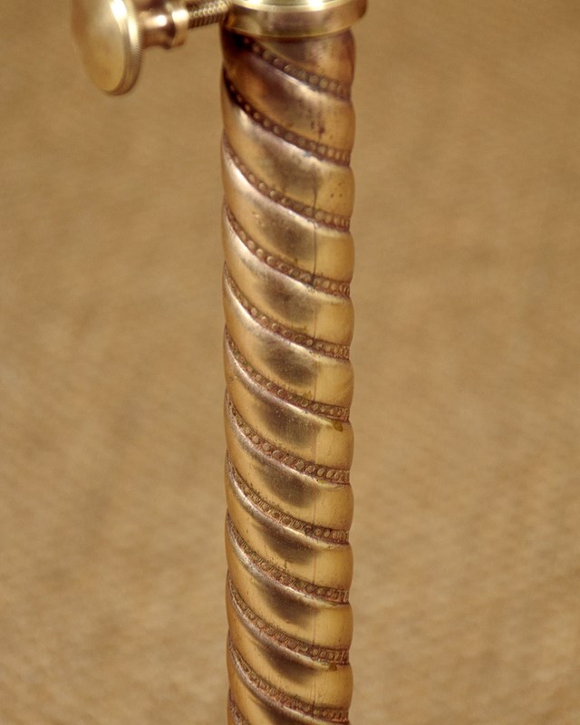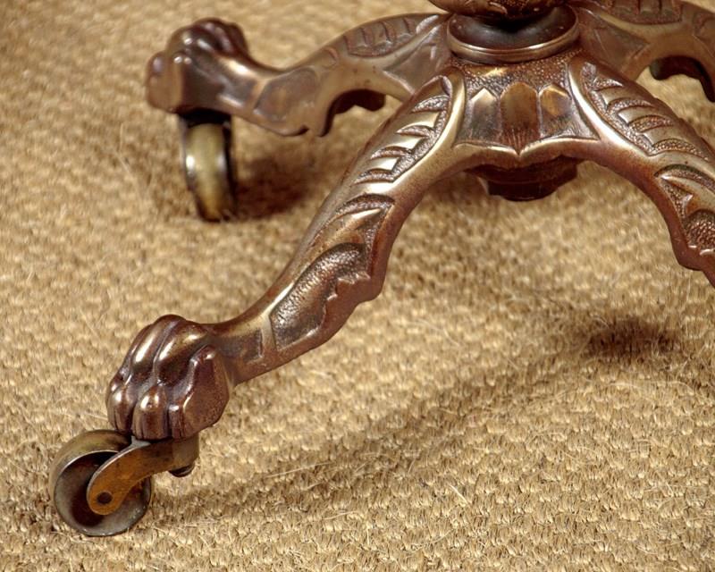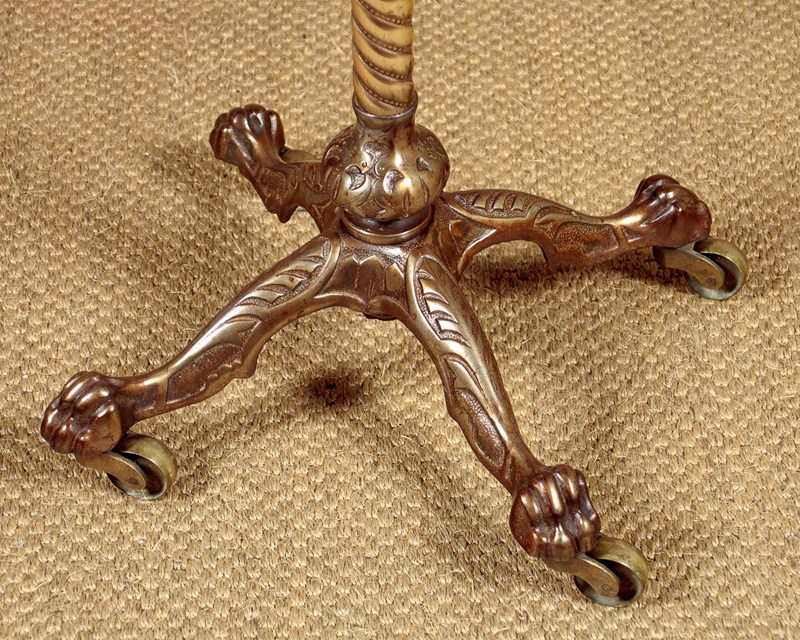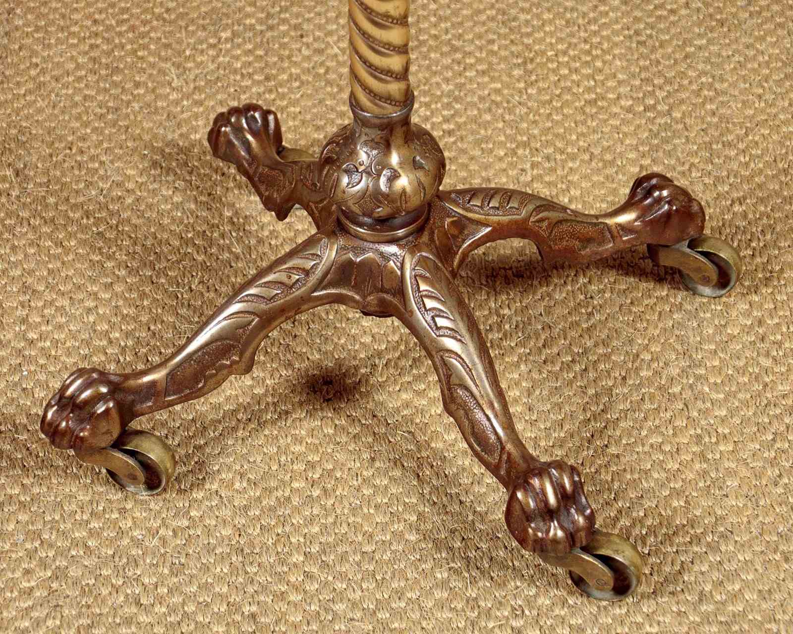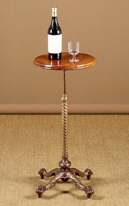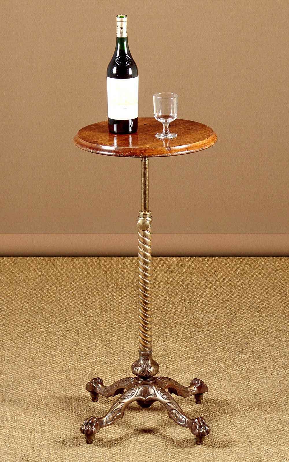 Late 19th.c adjustable wine table c.1890. 15" diameter mahogany table top with a moulded edge. Height adjustable from 26" - 46" on a spiral cast telescopic brass column. On a heavy cast iron base with claw feet and large brass castors. Very good condition, cleaned and waxed in our workshops.