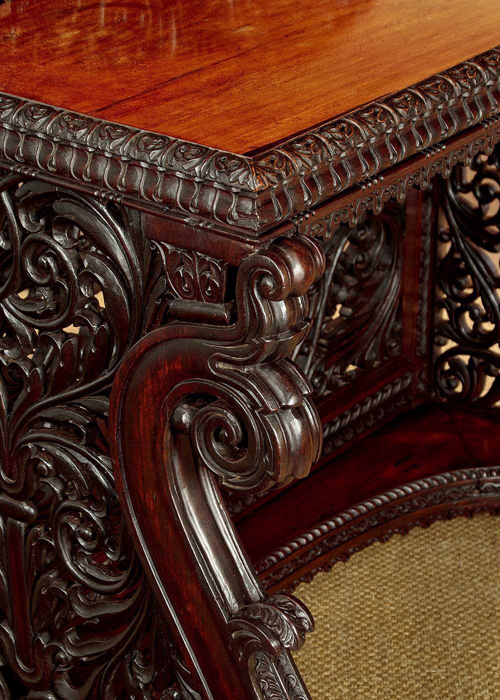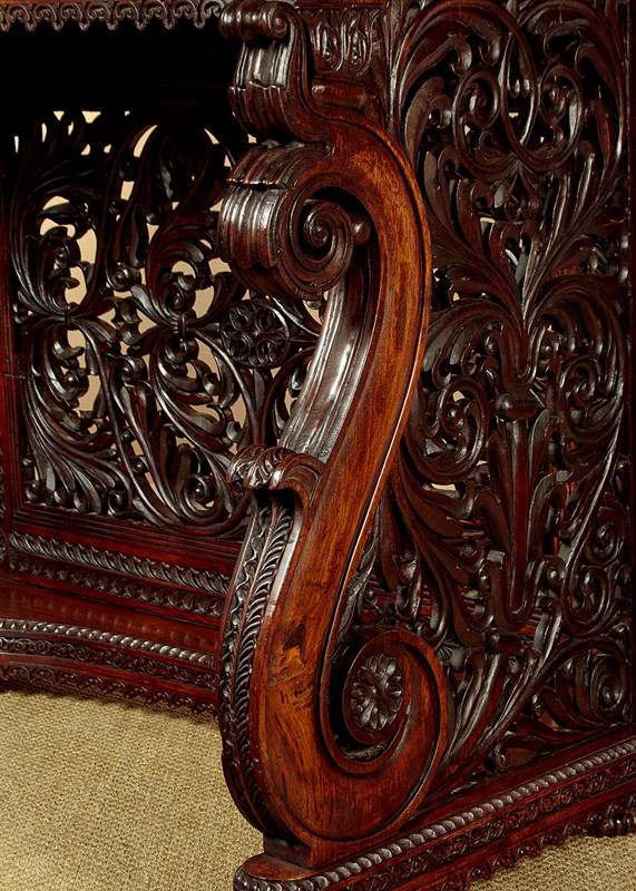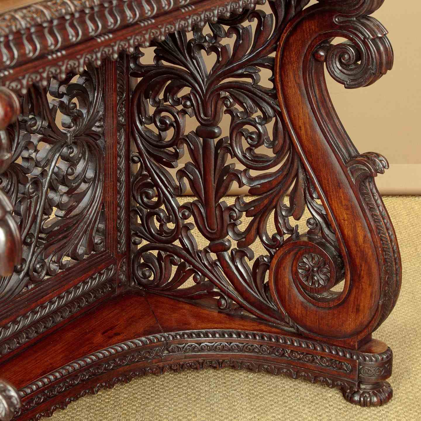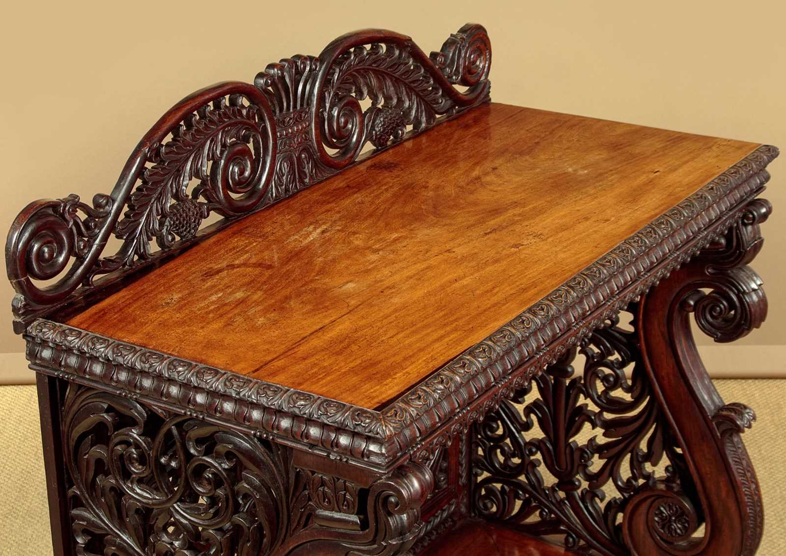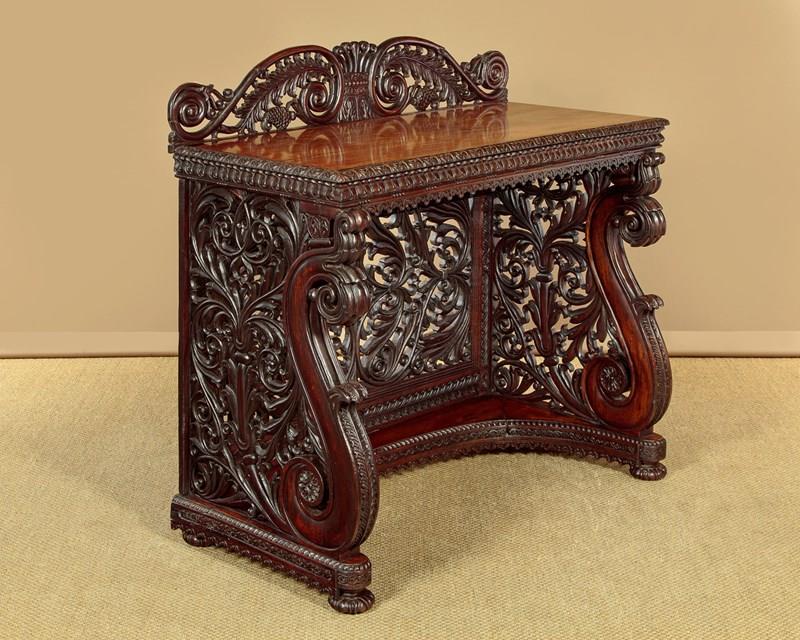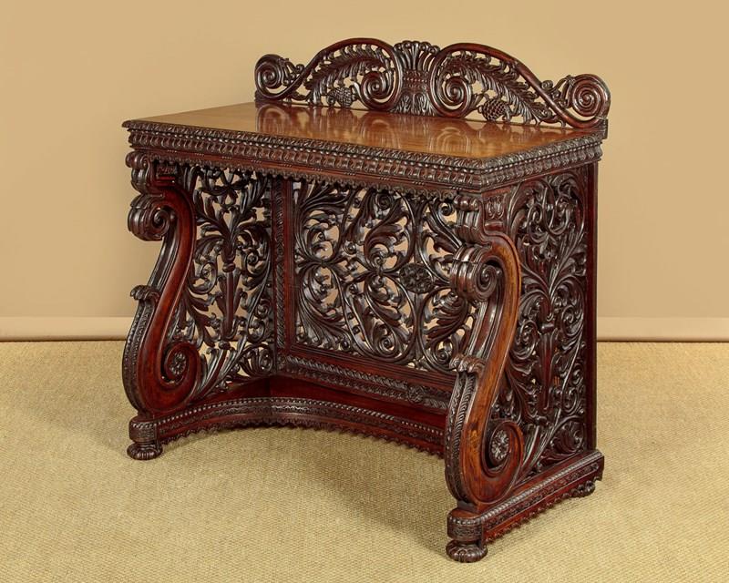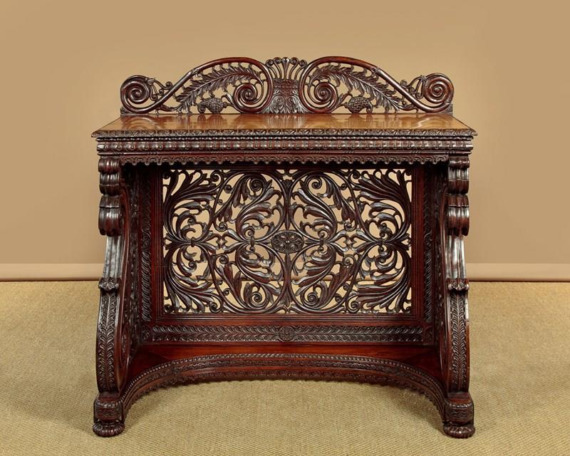 Spectacular Anglo Indian console table in Indian rosewood c.1860. Raised gallery along the back edge beautifully carved and pierced with scrolling acanthus foliage. Over the well figured single piece table top with bands of carved moulding to the front and sides and a shallow caved apron across the front. Raised on a splendid pair of crisply carved and moulded S-shaped supports. Enclosed sides and rear with densely carved and pierced foliate panels with symmetrically arranged decoration. Further carving to the surrounding frame. On a concave plinth with a gadrooned top edge over bands of carving all continued on the sides. Raised on turned and carved bun feet front and rear. Excellent colour and condition, cleaned and waxed in our workshops.
