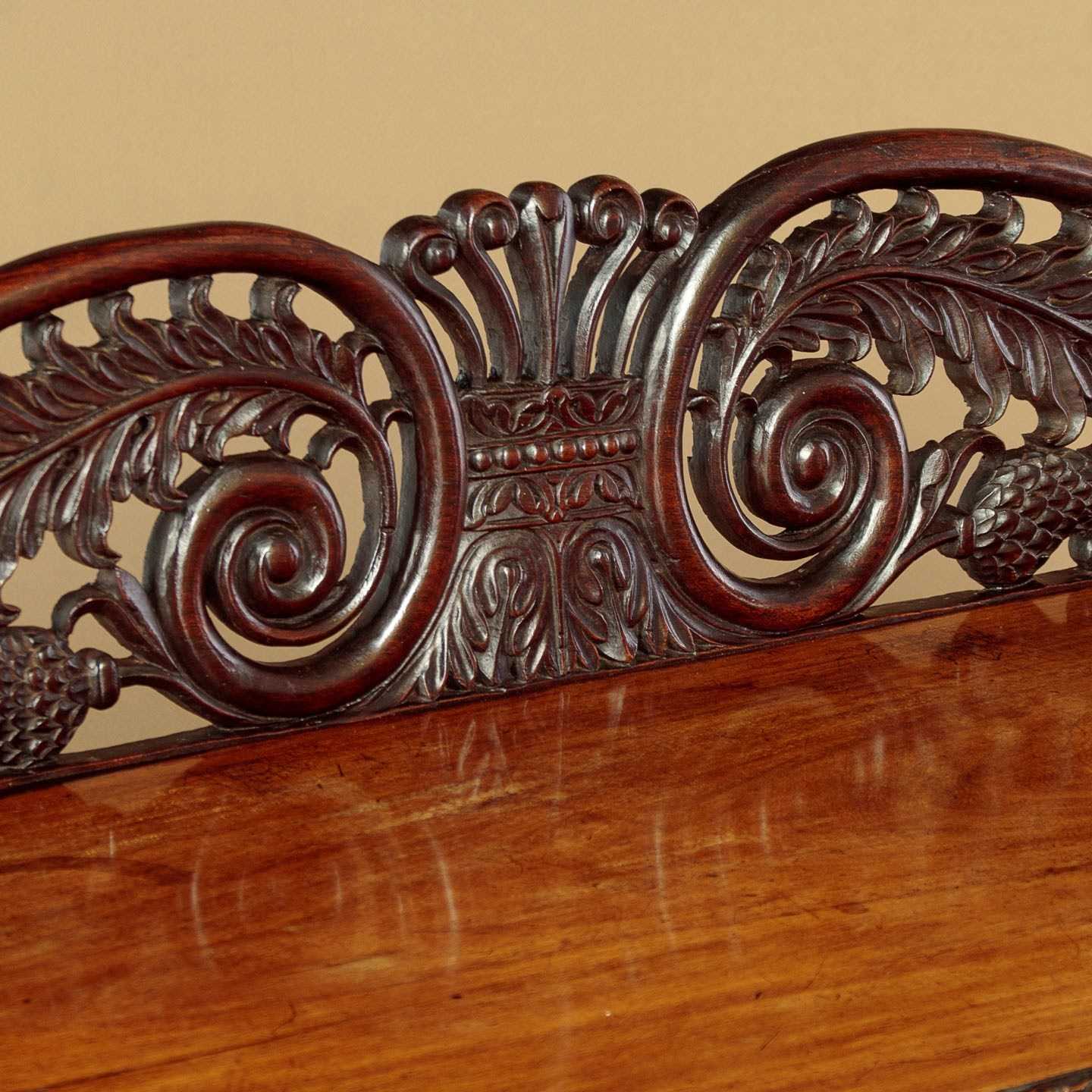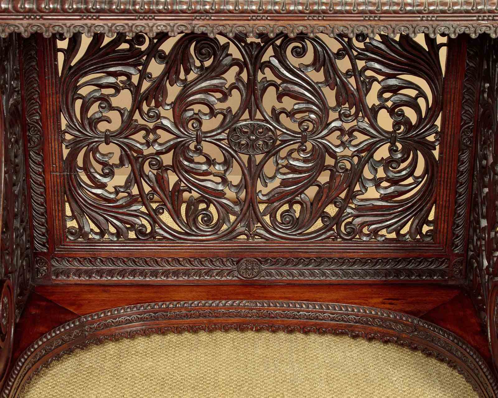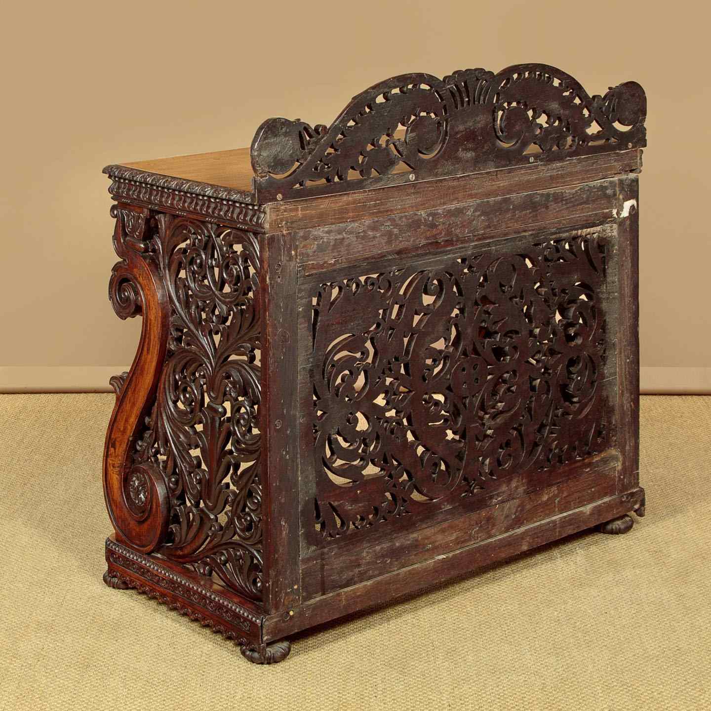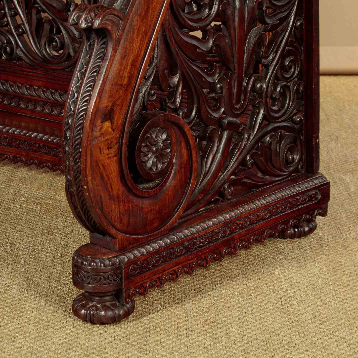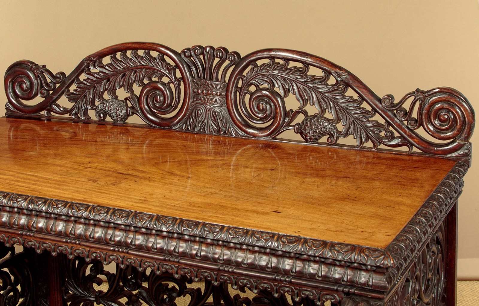 Spectacular Anglo Indian console table in Indian rosewood c.1860. Raised gallery along the back edge beautifully carved and pierced with scrolling acanthus foliage. Over the well figured single piece table top with bands of carved moulding to the front and sides and a shallow caved apron across the front. Raised on a splendid pair of crisply carved and moulded S-shaped supports. Enclosed sides and rear with densely carved and pierced foliate panels with symmetrically arranged decoration. Further carving to the surrounding frame. On a concave plinth with a gadrooned top edge over bands of carving all continued on the sides. Raised on turned and carved bun feet front and rear. Excellent colour and condition, cleaned and waxed in our workshops.
