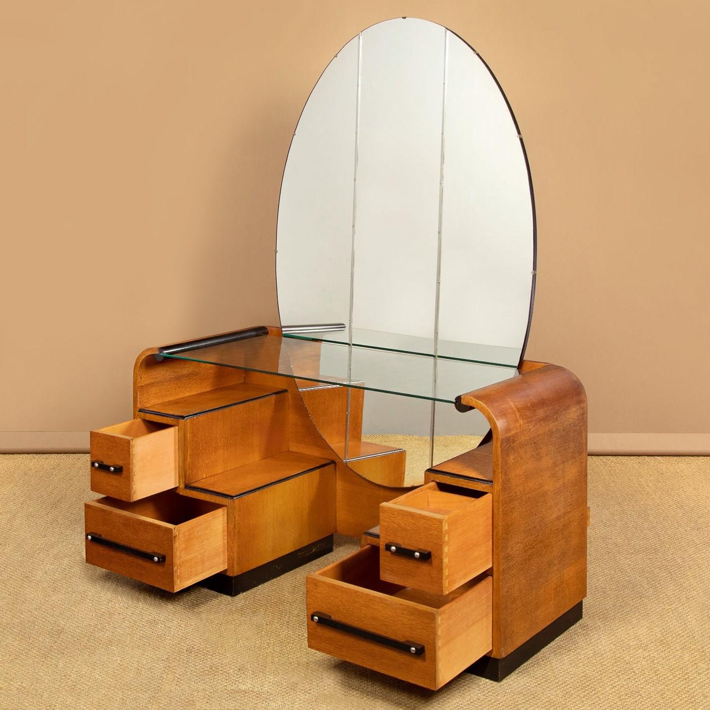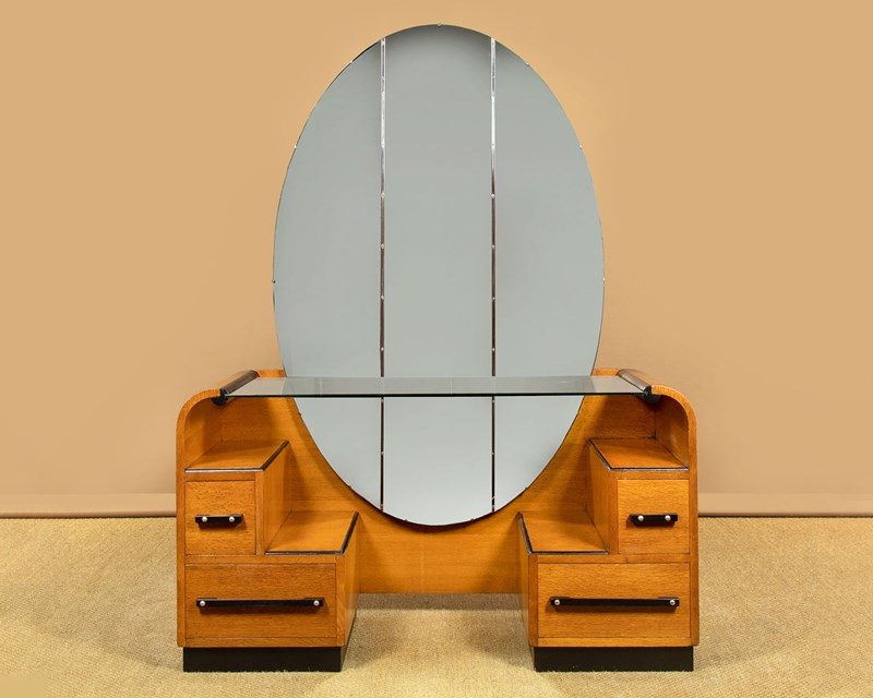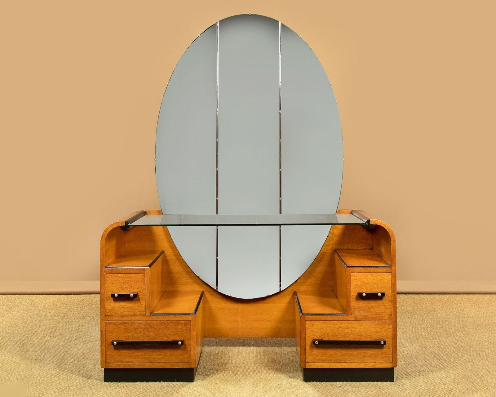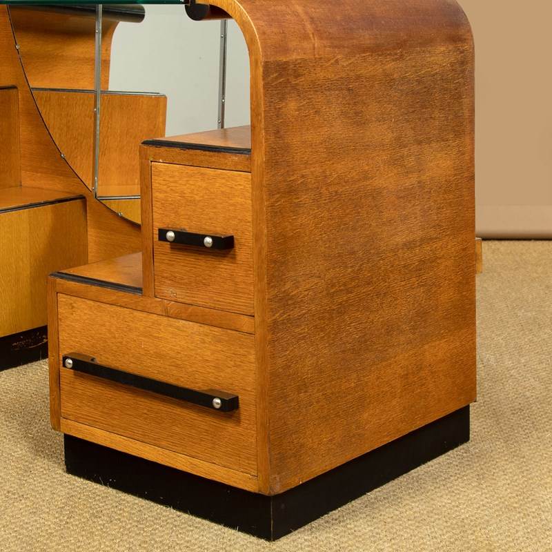 Stylish English Art Deco oak dressing table by Gomme of Wycombe (later famous for their G-Plan brand) c.1930. Distinctive machine-age design featuring 35" x 53½" oval dressing mirror in three pieces with a chrome trim, bisected by the plate glass table top (height 26"). Oak veneered base with stepped drawer pedestals flanking the kneehole. Oak veneers with dramatic ebonised black trim, drawer handles and plinth. Gomme badge inside the top right hand drawer. Excellent condition, fitted with new mirrors, cleaned and waxed in our workshops.