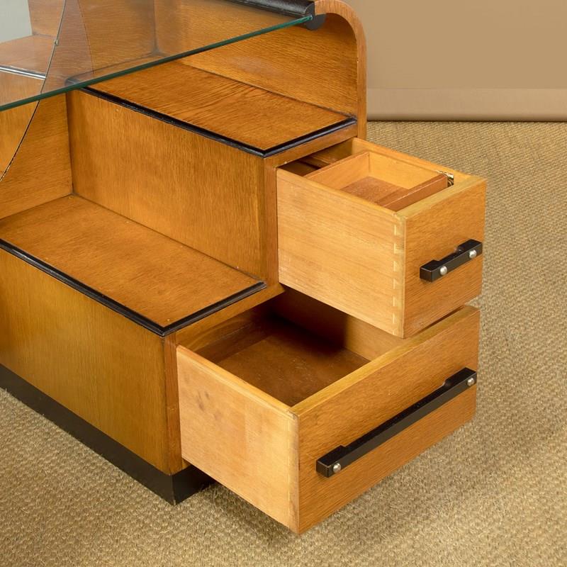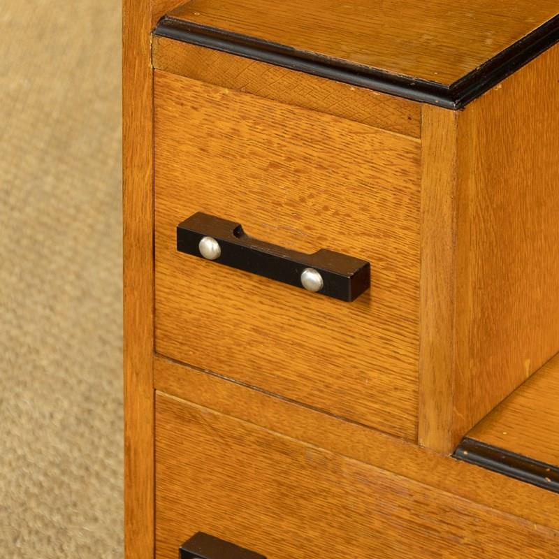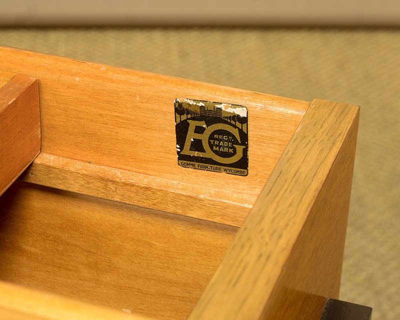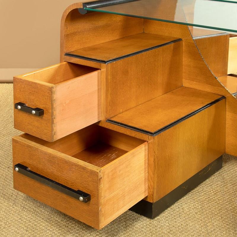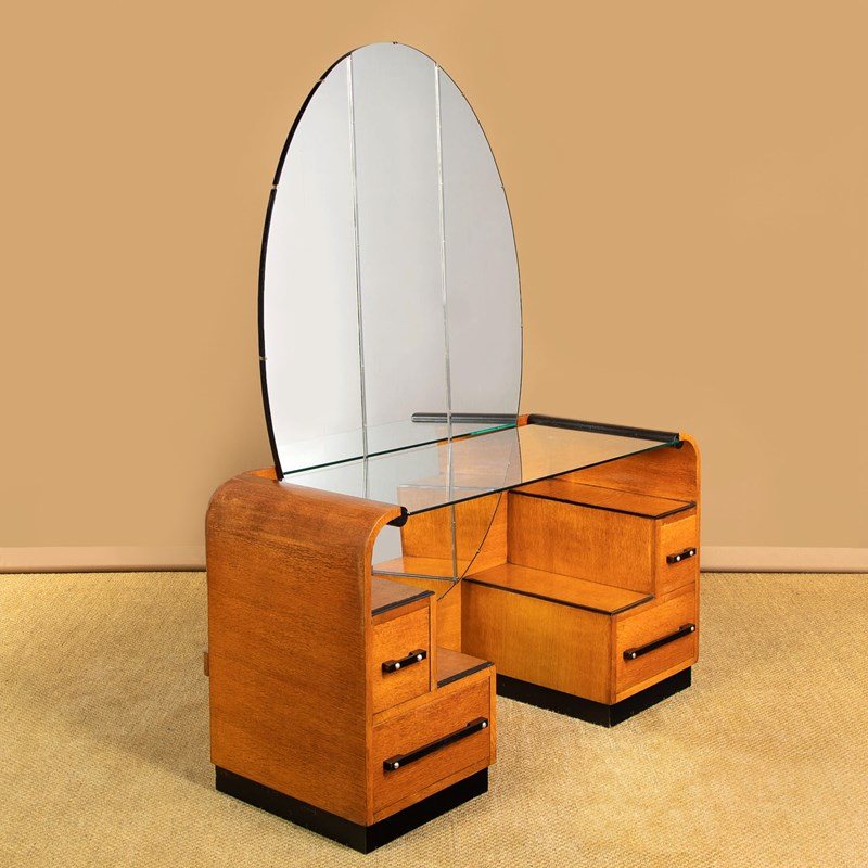 Stylish English Art Deco oak dressing table by Gomme of Wycombe (later famous for their G-Plan brand) c.1930. Distinctive machine-age design featuring 35" x 53½" oval dressing mirror in three pieces with a chrome trim, bisected by the plate glass table top (height 26"). Oak veneered base with stepped drawer pedestals flanking the kneehole. Oak veneers with dramatic ebonised black trim, drawer handles and plinth. Gomme badge inside the top right hand drawer. Excellent condition, fitted with new mirrors, cleaned and waxed in our workshops.