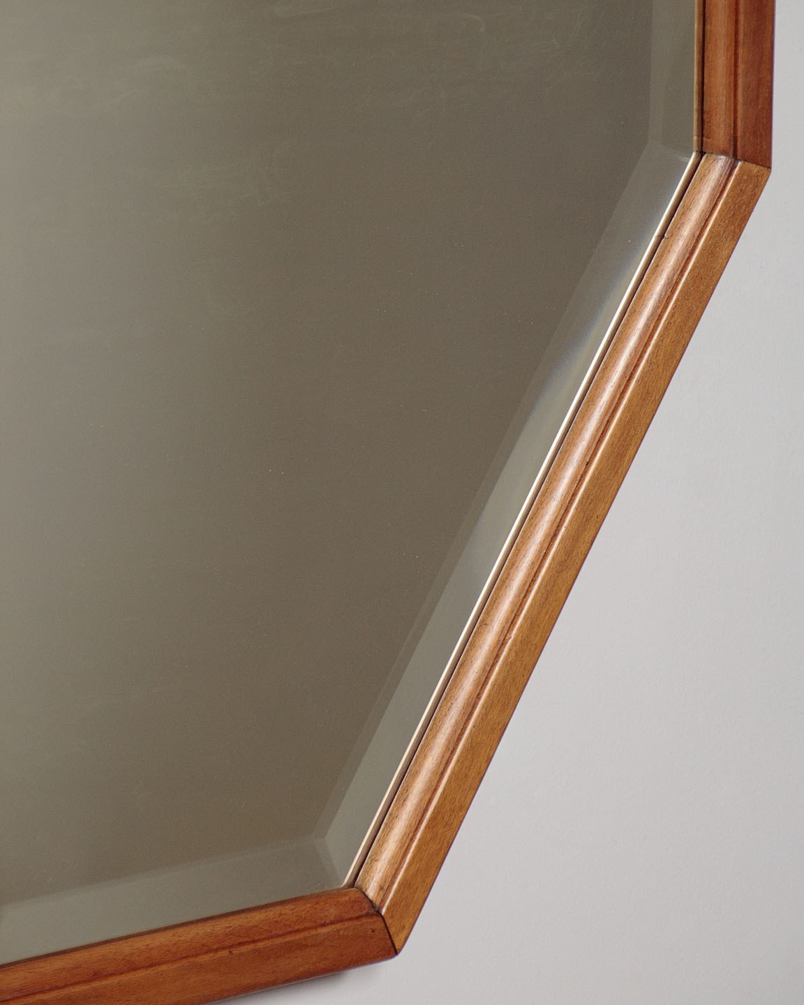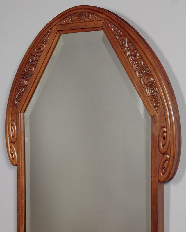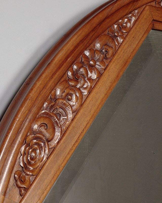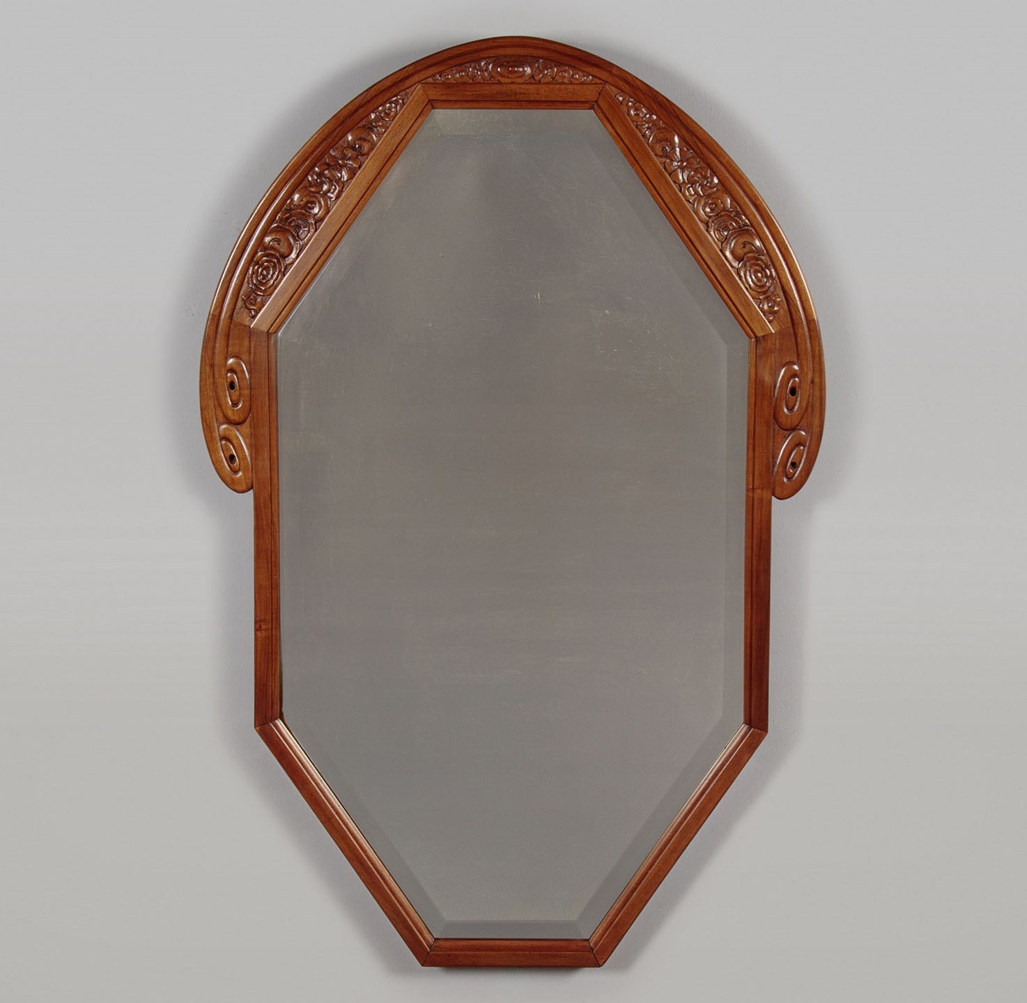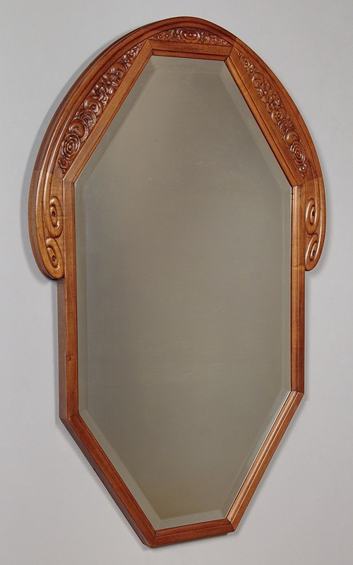 Unusual art deco wall mirror c.1930. Elongated octagonal mirror (width 41" x 23") with a bevelled edge. In a hardwood frame with an arched top and carved decoration. Some shading and tarnish to the mirror plate, otherwise very good condition.