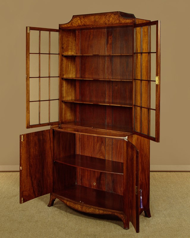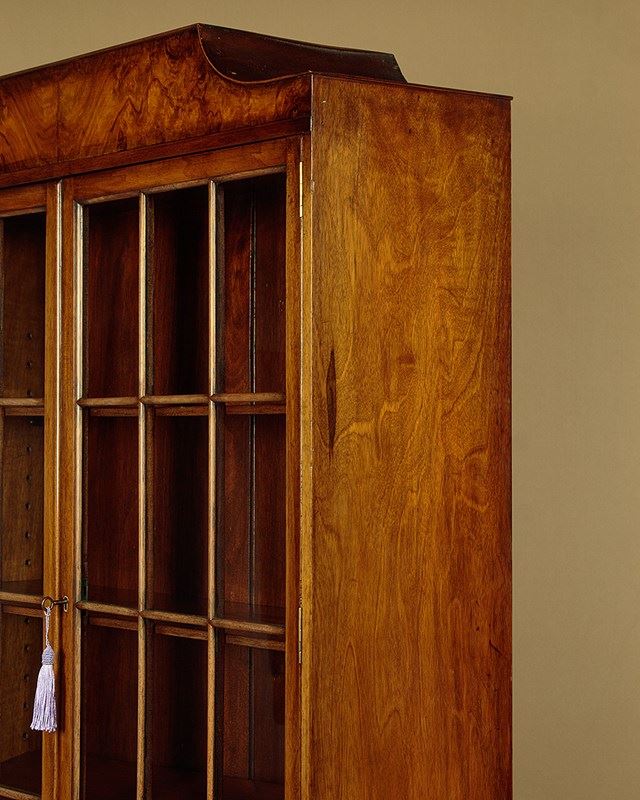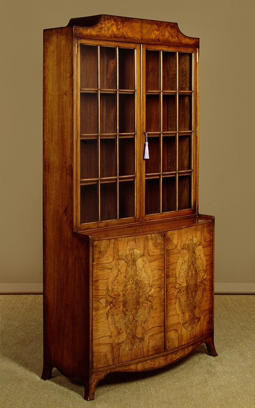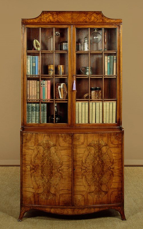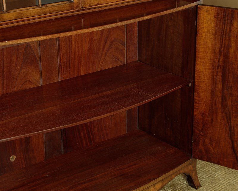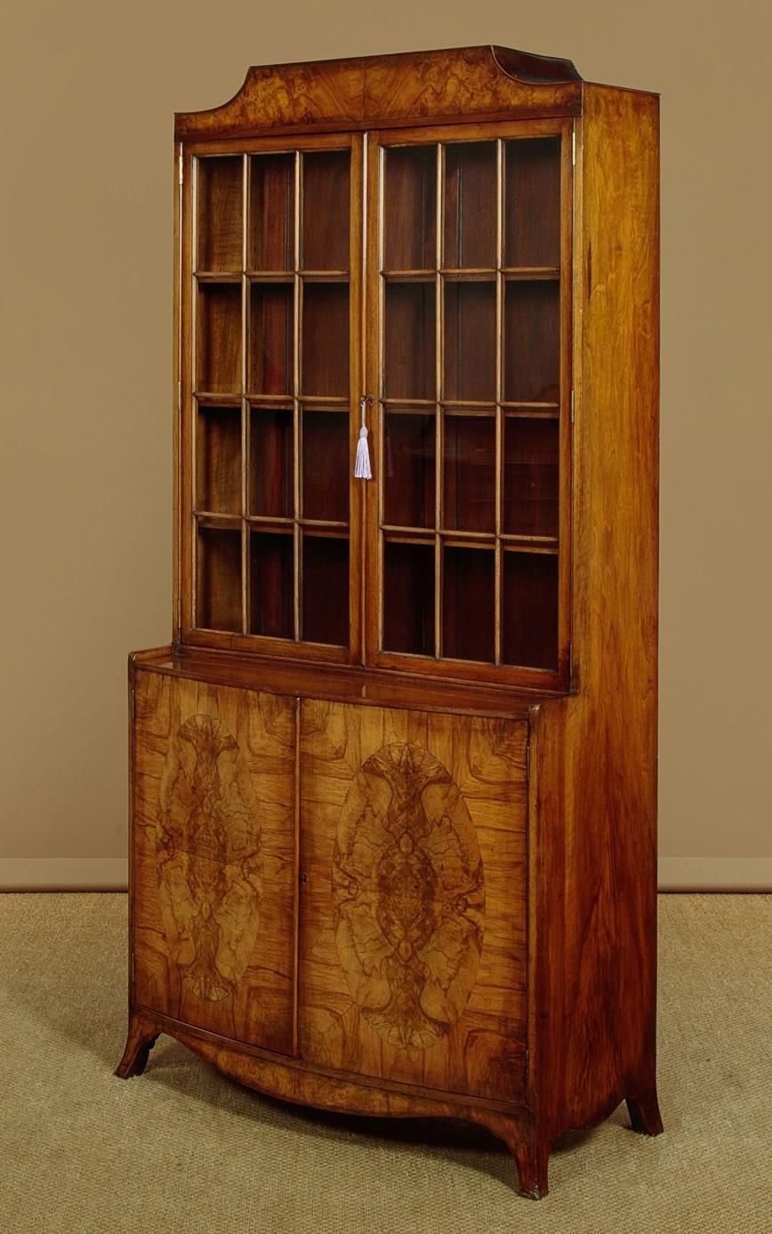 Very smart Art Deco walnut bookcase c.1930. In one piece with a glazed bookcase top fitted with three adjustable shelves (internal depth 8¼"). Over a deeper bow fronted cupboard base with a single shelf (depth 15"). Simple uncluttered design free of any carved or applied decoration save for the shaped pediment and the highly figured burr walnut veneers used across the front. Note the symmetrical pattern created by the quarter veneers on the lower doors. Solid walnut sides. Shaped apron around the base and slightly flared legs to the front and sides. Excellent colour and condition, cleaned and waxed in our workshops. Key supplied.