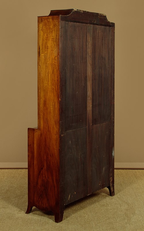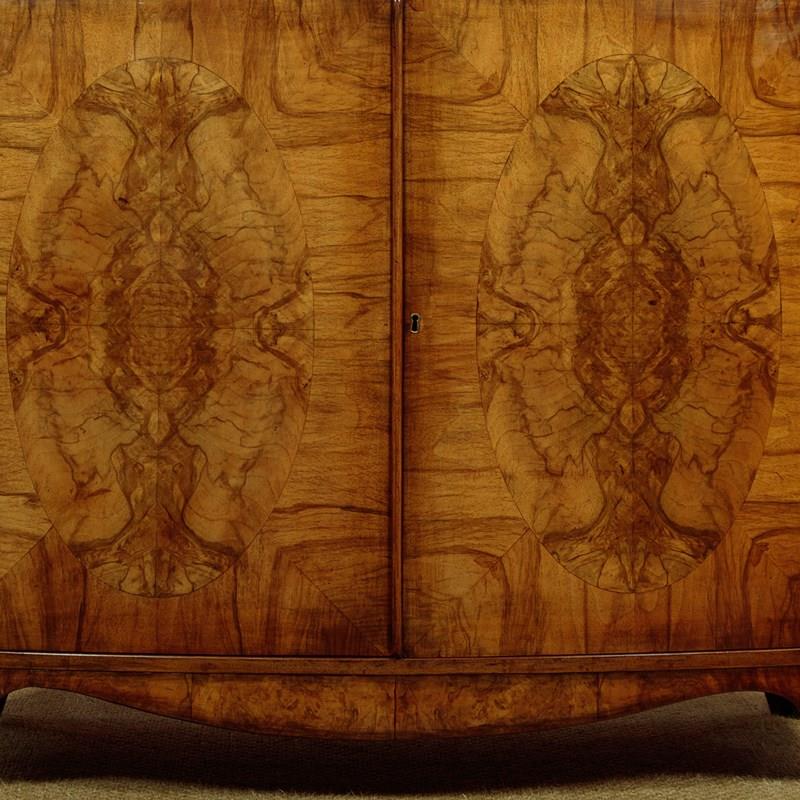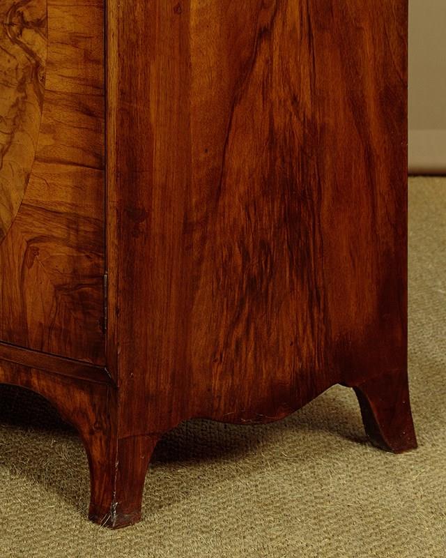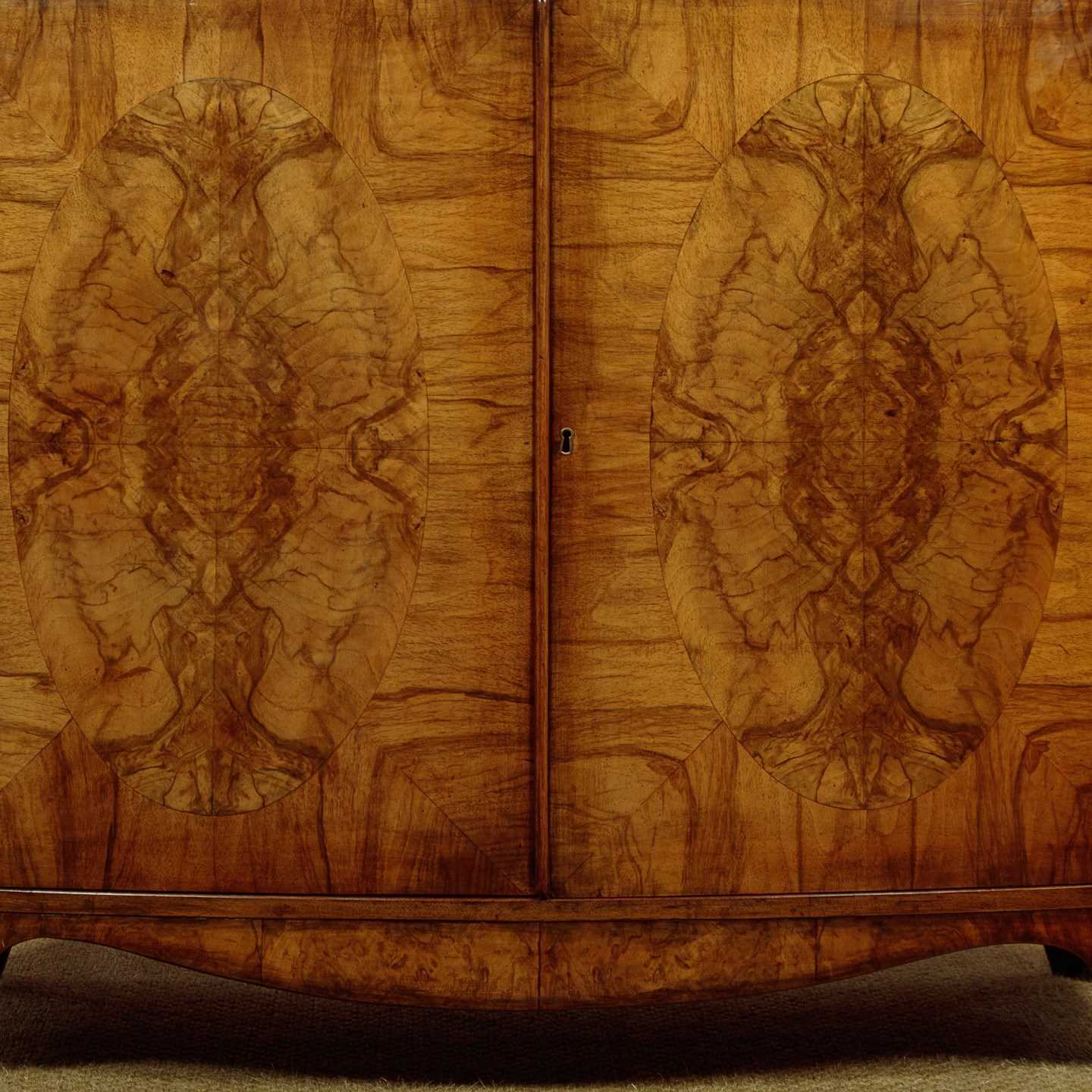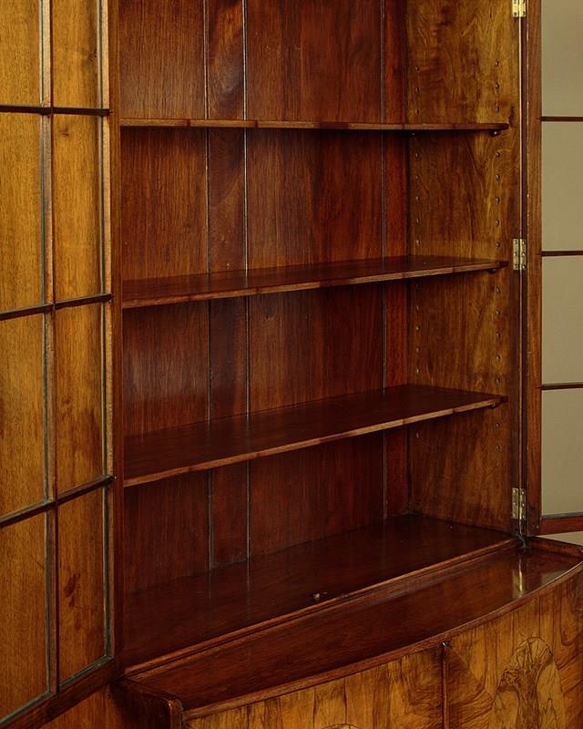 Very smart Art Deco walnut bookcase c.1930. In one piece with a glazed bookcase top fitted with three adjustable shelves (internal depth 8¼"). Over a deeper bow fronted cupboard base with a single shelf (depth 15"). Simple uncluttered design free of any carved or applied decoration save for the shaped pediment and the highly figured burr walnut veneers used across the front. Note the symmetrical pattern created by the quarter veneers on the lower doors. Solid walnut sides. Shaped apron around the base and slightly flared legs to the front and sides. Excellent colour and condition, cleaned and waxed in our workshops. Key supplied.