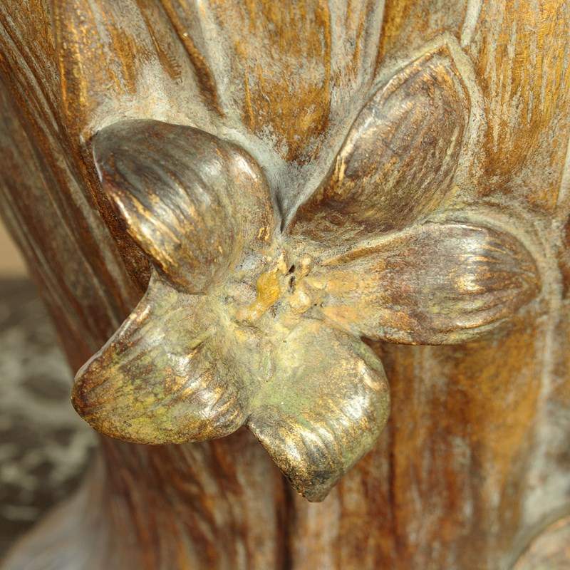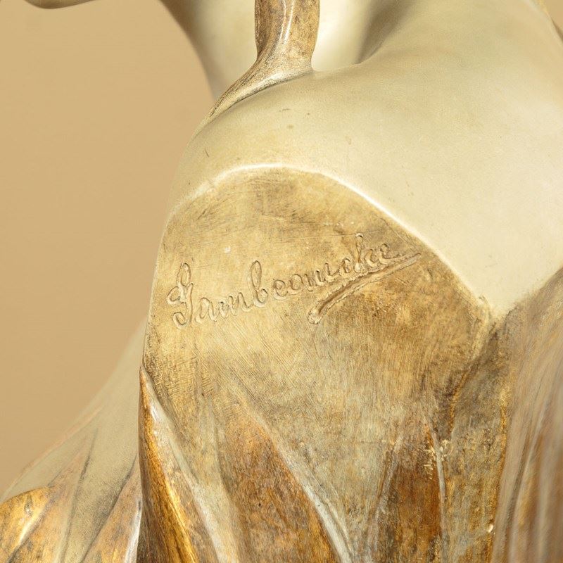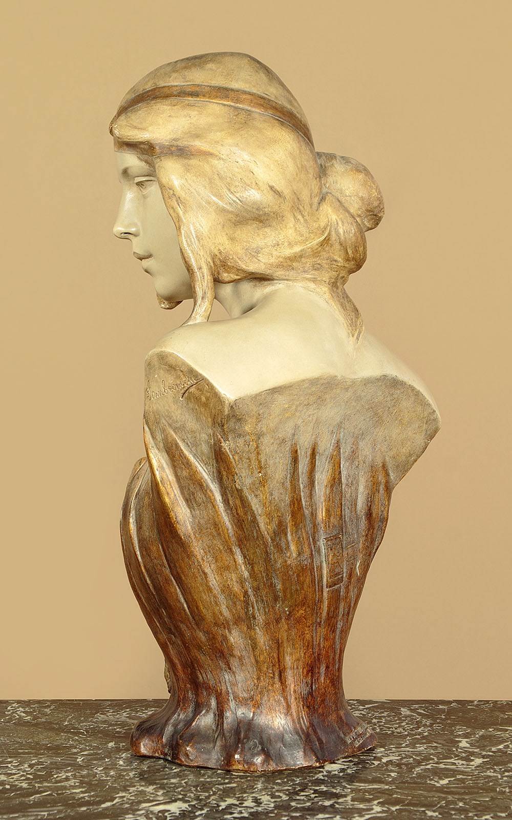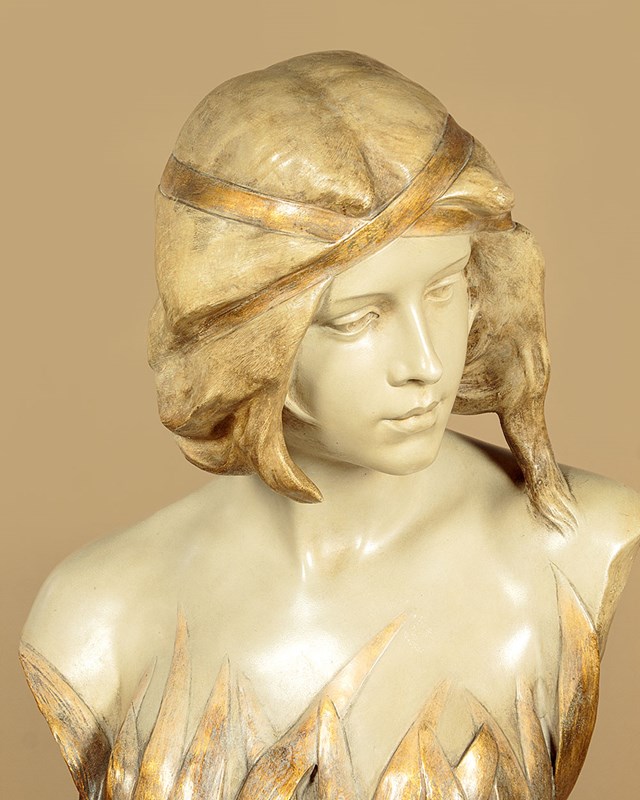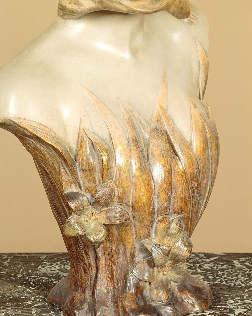 Fine Art Nouveau bust of a woman by the celebrated Austrian makers Goldscheider c.1900. Standing 23" (58cm) tall. Beautifully modelled in painted terracotta as a young woman with her hair loosely tied with a gold ribbon. Apparently naked but surrounded by long spear shaped leaves, also painted gold, and with three flower heads at the front. Signed by the artist 'Gambeourke' in the clay, with the factory mark of Friedrich Goldscheider on the rear together with the serial numbers 2437 / 149 / 19 and the Reproduction Reserve stamp. Excellent condition with the original painted finish and no chips or cracks.