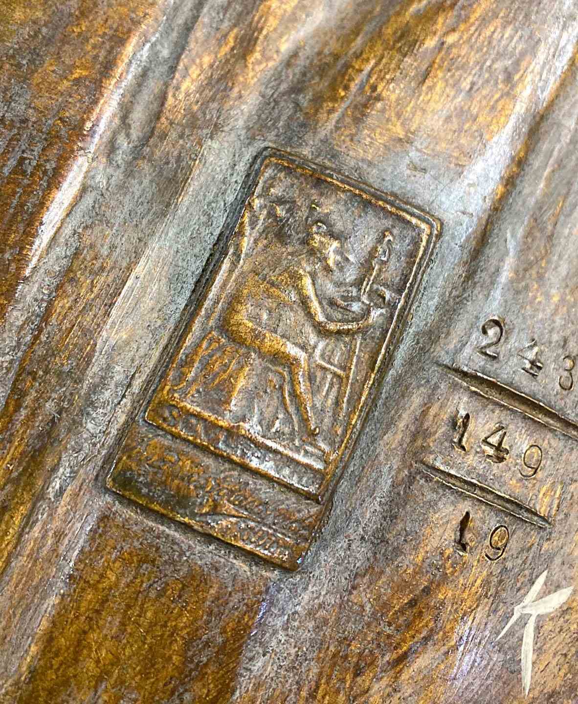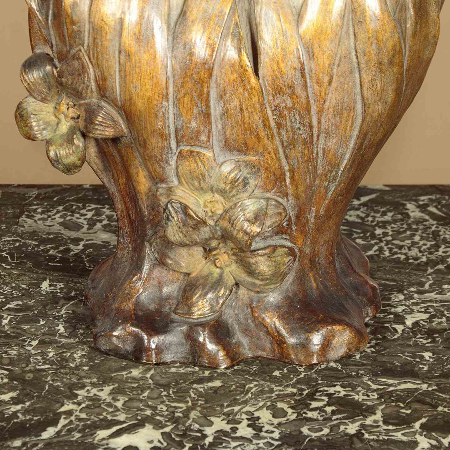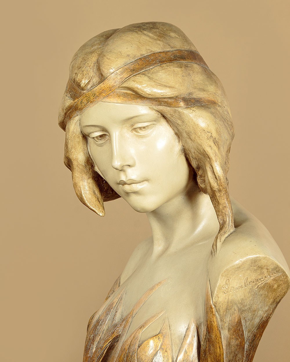 Fine Art Nouveau bust of a woman by the celebrated Austrian makers Goldscheider c.1900. Standing 23" (58cm) tall. Beautifully modelled in painted terracotta as a young woman with her hair loosely tied with a gold ribbon. Apparently naked but surrounded by long spear shaped leaves, also painted gold, and with three flower heads at the front. Signed by the artist 'Gambeourke' in the clay, with the factory mark of Friedrich Goldscheider on the rear together with the serial numbers 2437 / 149 / 19 and the Reproduction Reserve stamp. Excellent condition with the original painted finish and no chips or cracks.