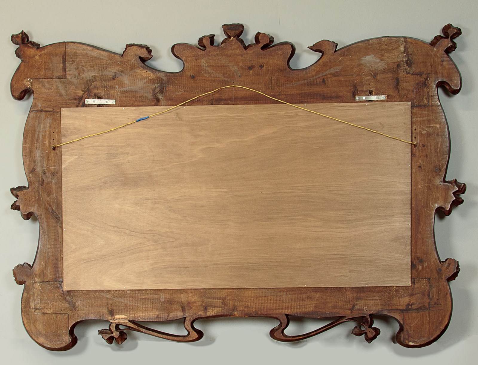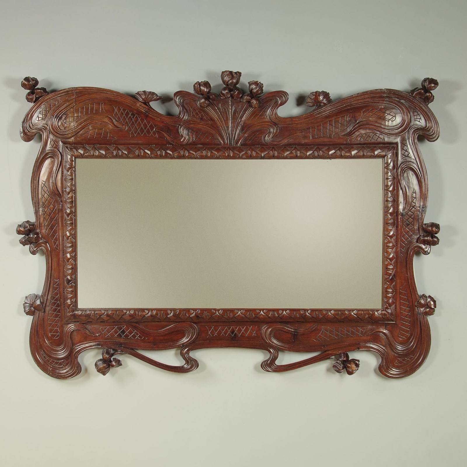 Fabulous large Art Nouveau carved wooden frame c.1900. Fitted with a 42½" x 21" mirror plate. Superb Art Nouveau detail, crowned with three flowerheads at the centre, surrounded with whiplash foliage continued as pierced detail to the bottom edge and with additional heads around the edges. Some minor wear and repairs, generally very good condition, cleaned and waxed in our workshops.