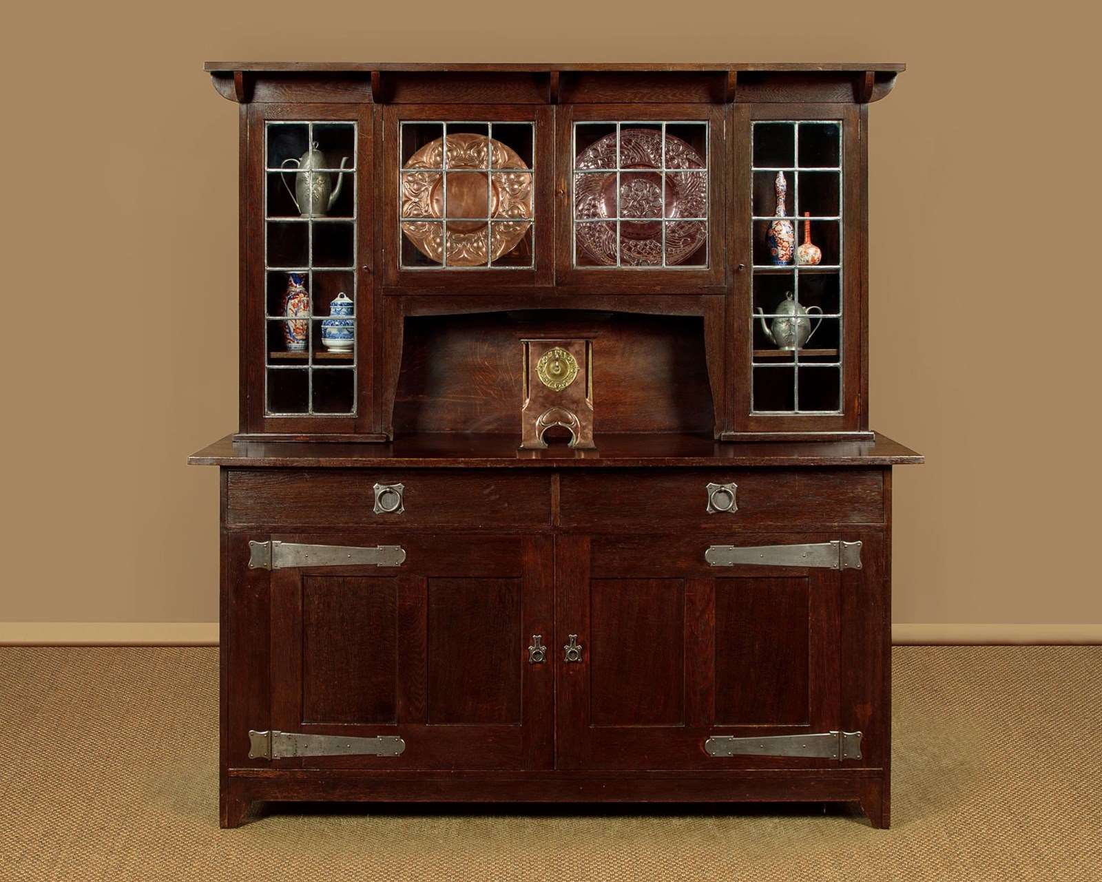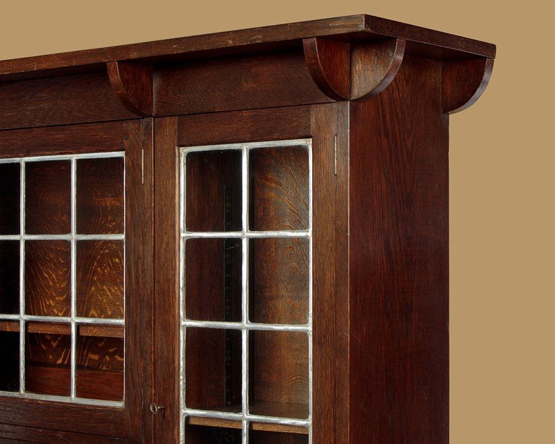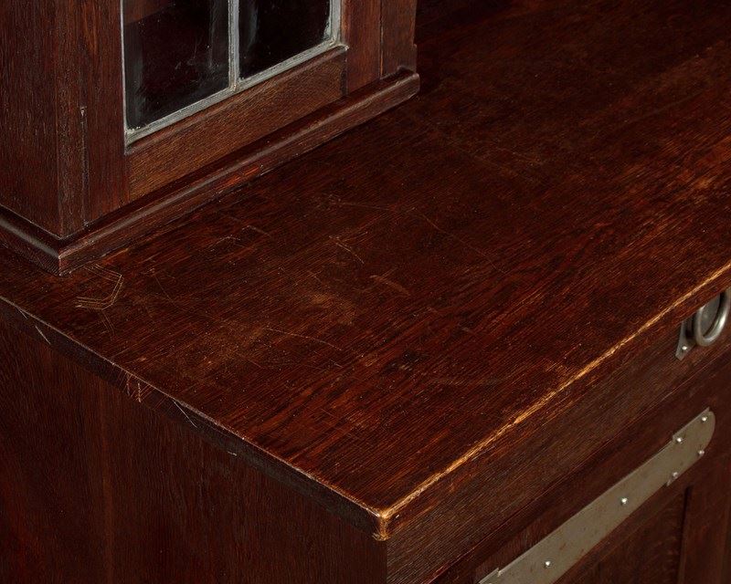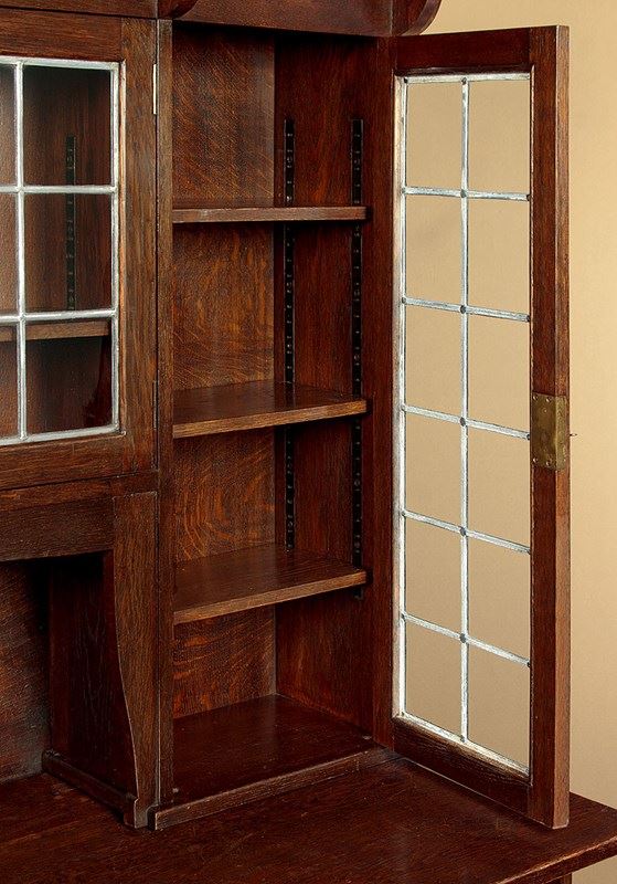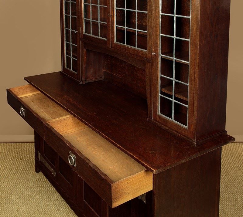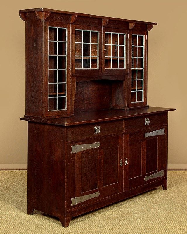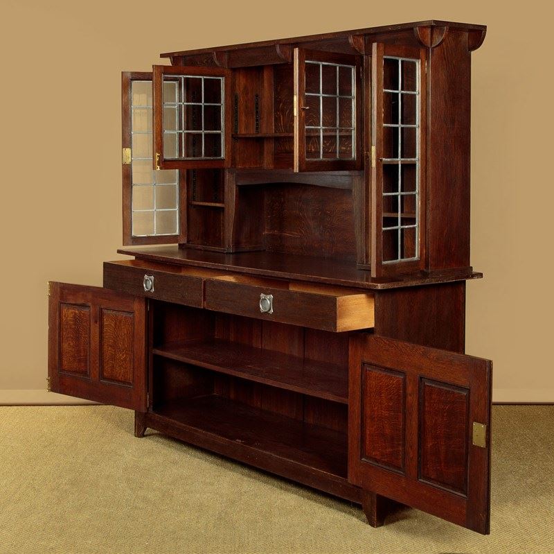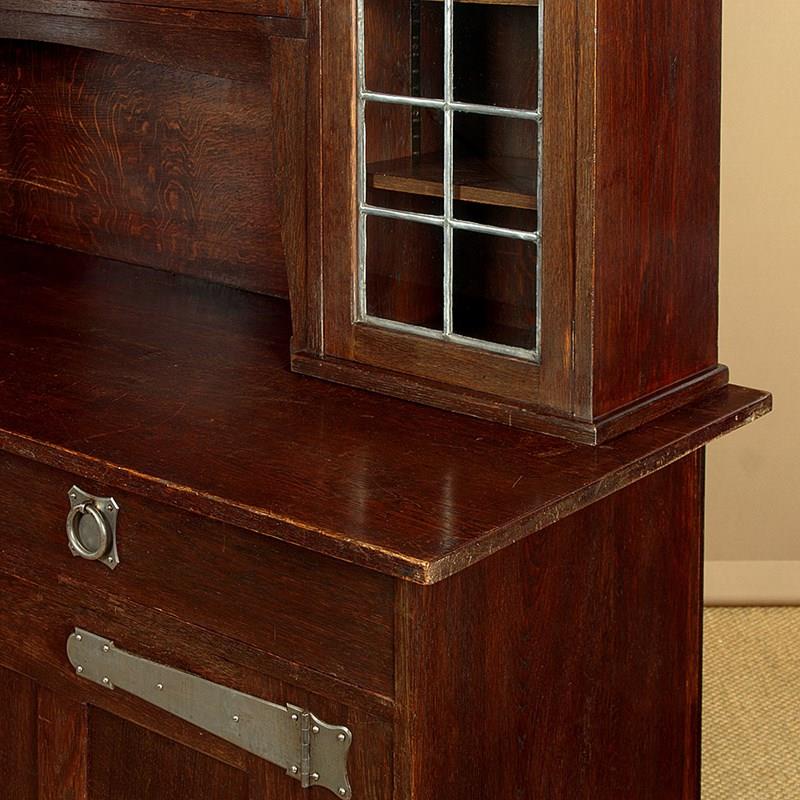 Superb Arts & Crafts oak sideboard or dresser in oak by the celebrated makers and retailers Liberty & Co. of London. Known as the 'Hambleden' and featured in the companies 1907 furniture catalogue. In two pieces with a glazed display top with an overhanging cornice on quarter round brackets, over leaded glass doors fitted inside with adjustable shelves (depth 8"), arranged around the open middle with a shaped apron. Base with two large drawers over a two door cupboard fitted with a single adjustable shelf inside (depth 18"). Retaining the original and distinctive steel handles and hinges. Shaped detail to the feet. Solid oak sides, shelves and backboards. Liberty & Co. label to the rear. Some wear to the finish on the top of the base. Otherwise very good condition, cleaned and waxed in our workshops. Keys supplied.