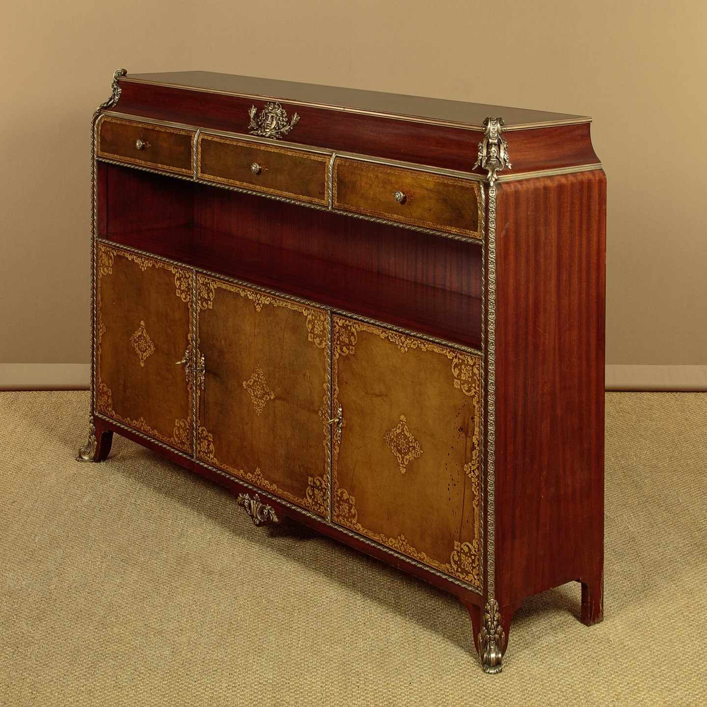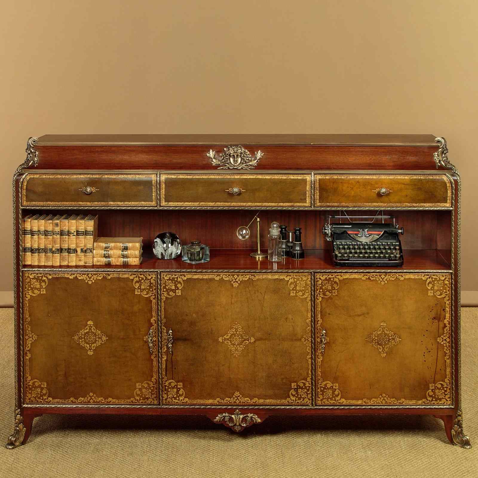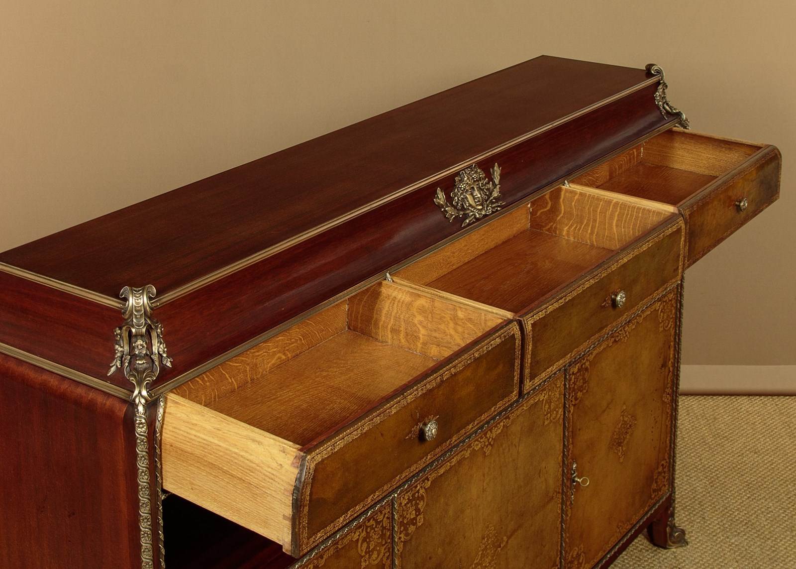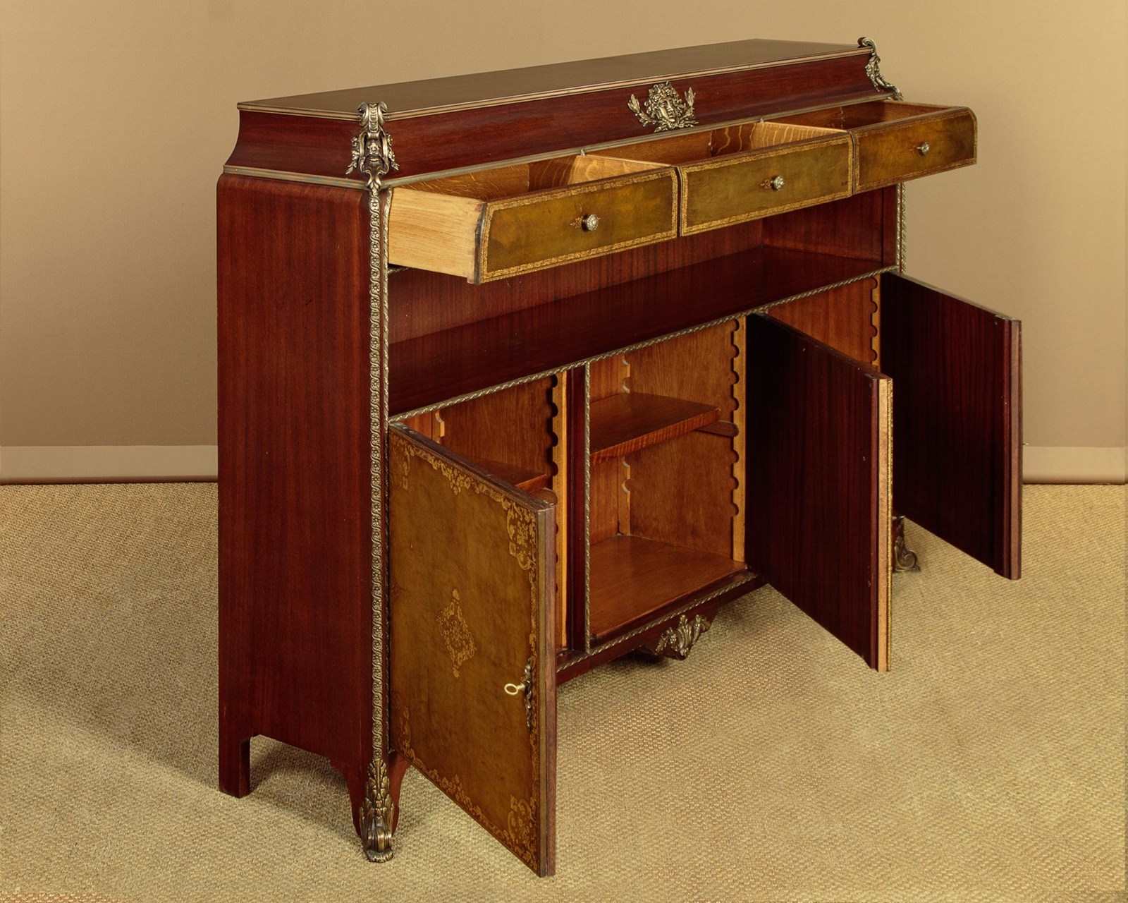 Fine quality brass mounted side cabinet by the acclaimed French cabinet makers Chaleyssin c.1950. Mahogany cabinet featuring three drawers over a long open shelf (height 8½") and three lockable cupboards below, each with a single adjustable shelf inside (internal depth 11"). Leather fronts to the drawers and doors, featuring decorative gilt tooling. Extensive and large Louis XVI style brass mounts to the moulded top, apron and feet. Plus brass mouldings, drawer knobs and escutcheons. Clearly maker's stamps and serial numbers to the rear. Inks pots or similar to the right hand door front. Otherwise excellent colour and condition with only minor wear. Cleaned and waxed in our workshops. Keys supplied.