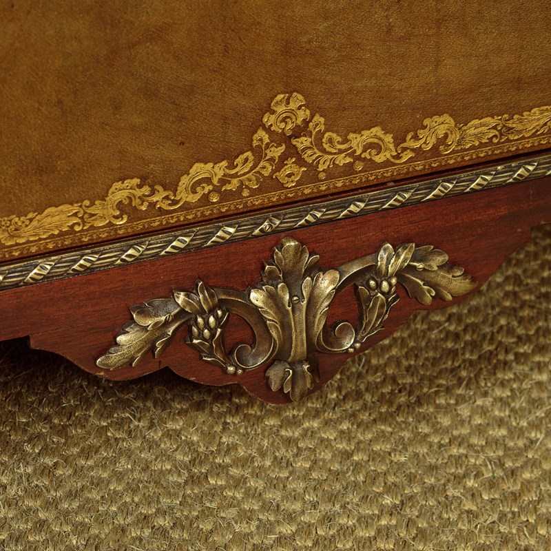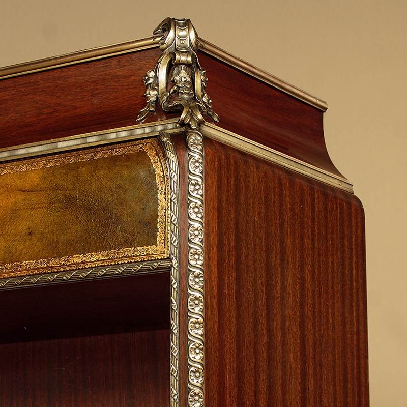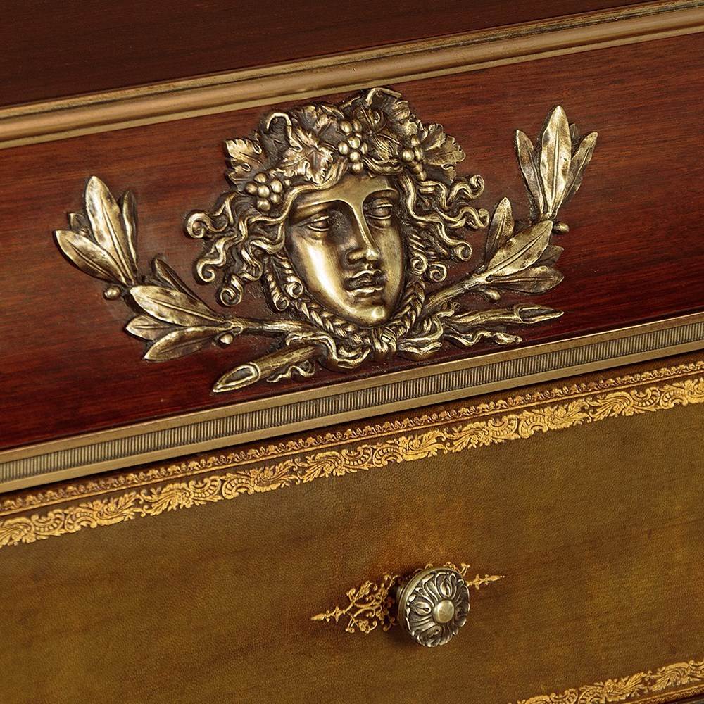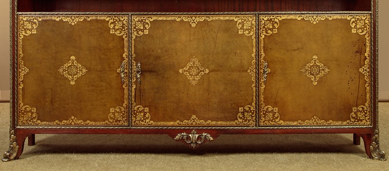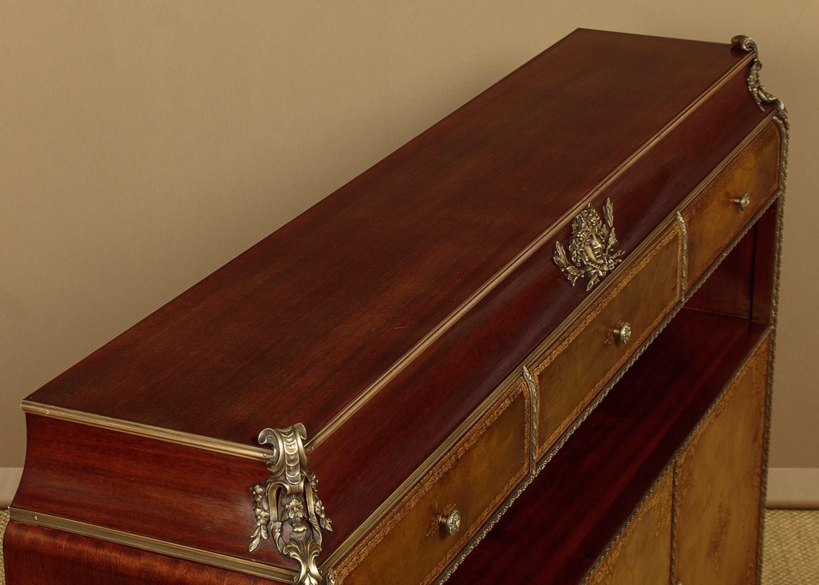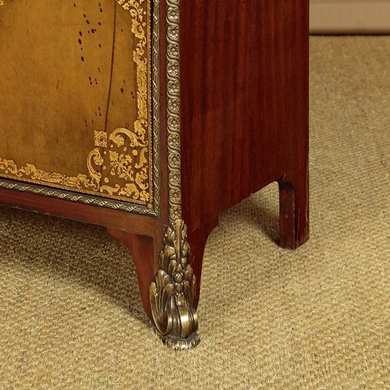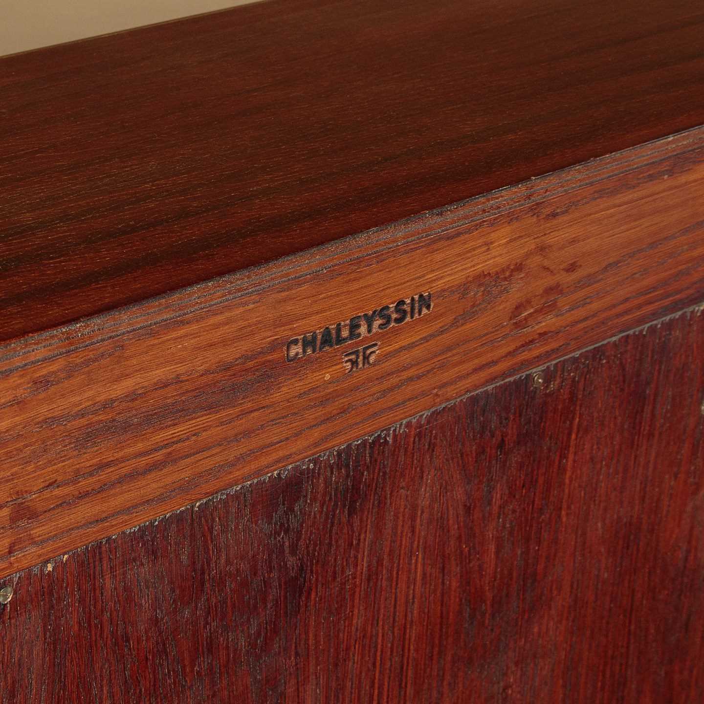Fine quality brass mounted side cabinet by the acclaimed French cabinet makers Chaleyssin c.1950. Mahogany cabinet featuring three drawers over a long open shelf (height 8½") and three lockable cupboards below, each with a single adjustable shelf inside (internal depth 11"). Leather fronts to the drawers and doors, featuring decorative gilt tooling. Extensive and large Louis XVI style brass mounts to the moulded top, apron and feet. Plus brass mouldings, drawer knobs and escutcheons. Clearly maker's stamps and serial numbers to the rear. Inks pots or similar to the right hand door front. Otherwise excellent colour and condition with only minor wear. Cleaned and waxed in our workshops. Keys supplied.