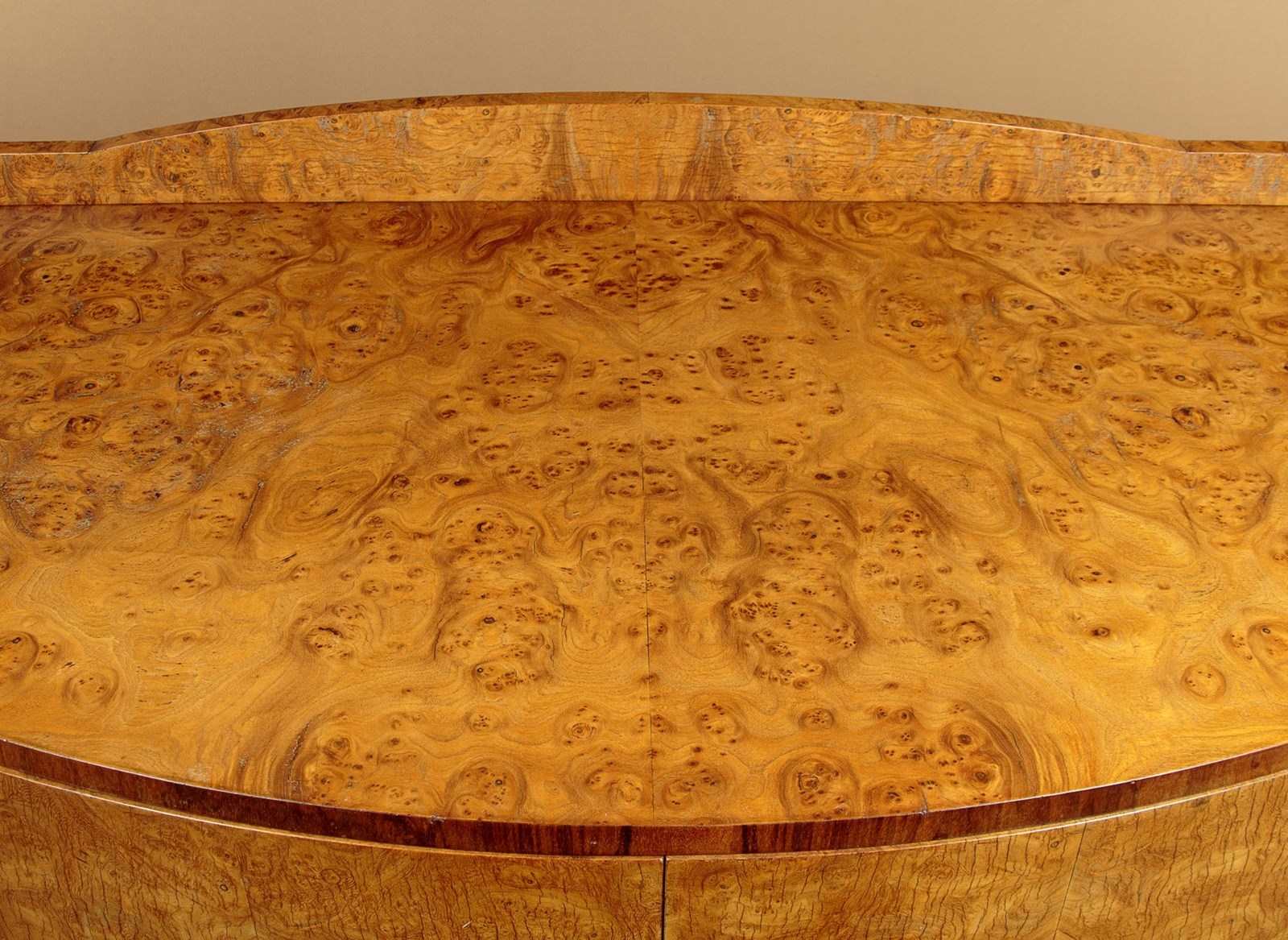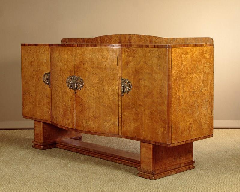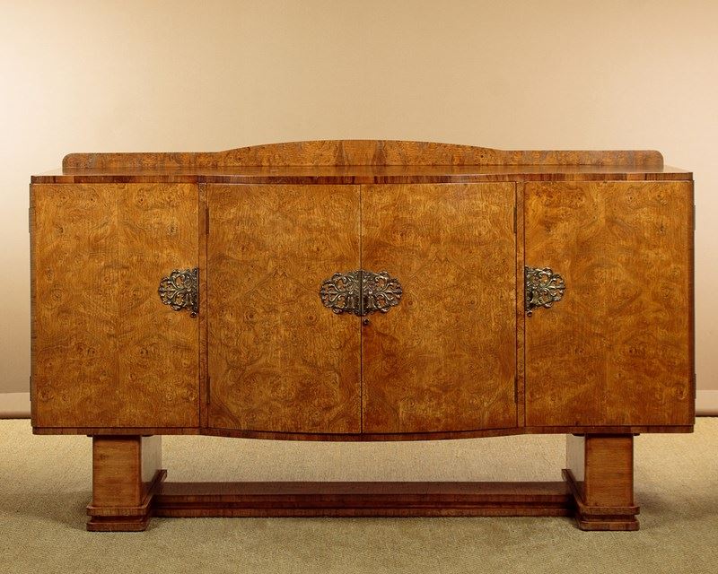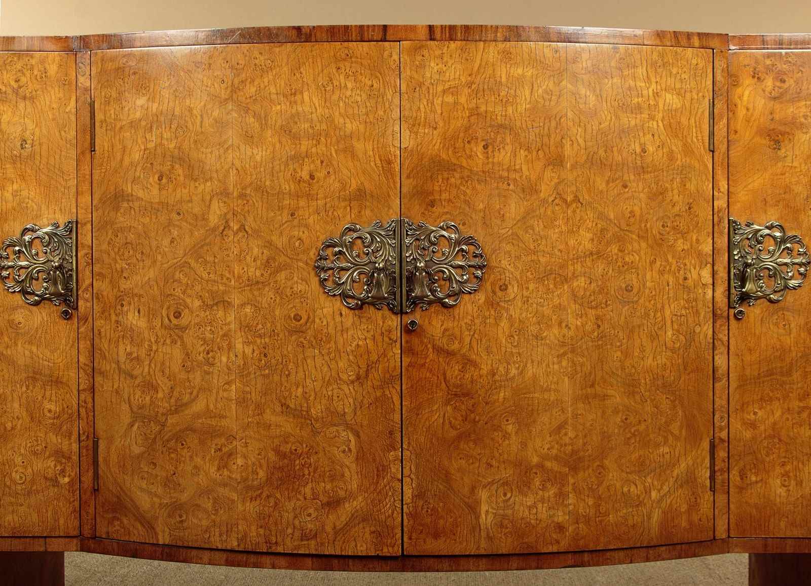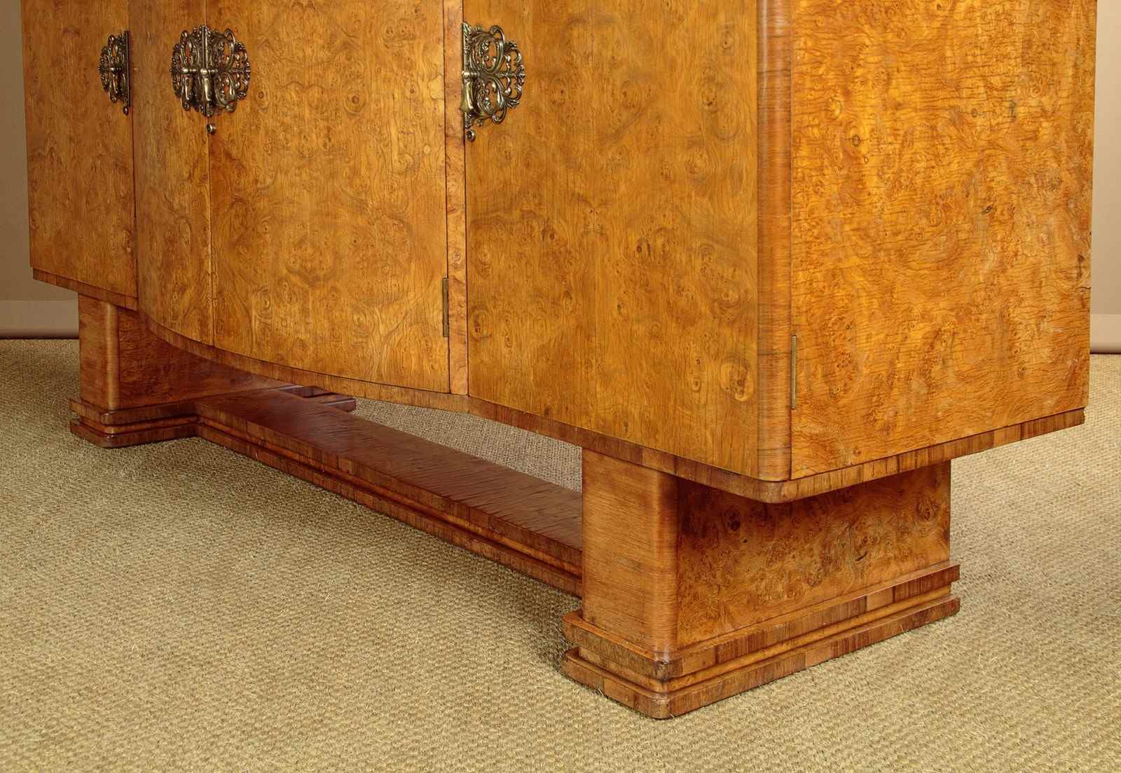 Handsome four door bow fronted Art Deco sideboard c.1930. Top with a low upstand along the back and crossbanded edges. Over a bow fronted centre opening to reveal a fitted interior of four small and two large drawers of graduated height, flanked with cupboard to either side, both fitted with adjustable shelves. Beautifully figured burr elm veneers arranged in a symmetrical pattern across the top, front and sides. Original brass handles with highly decorative pieced backplates. Streamlined modernist design to the base with stout column legs joined with a low stretcher, both veneered and crossbanded to match. Very good colour and condition, cleaned and waxed in our workshops.