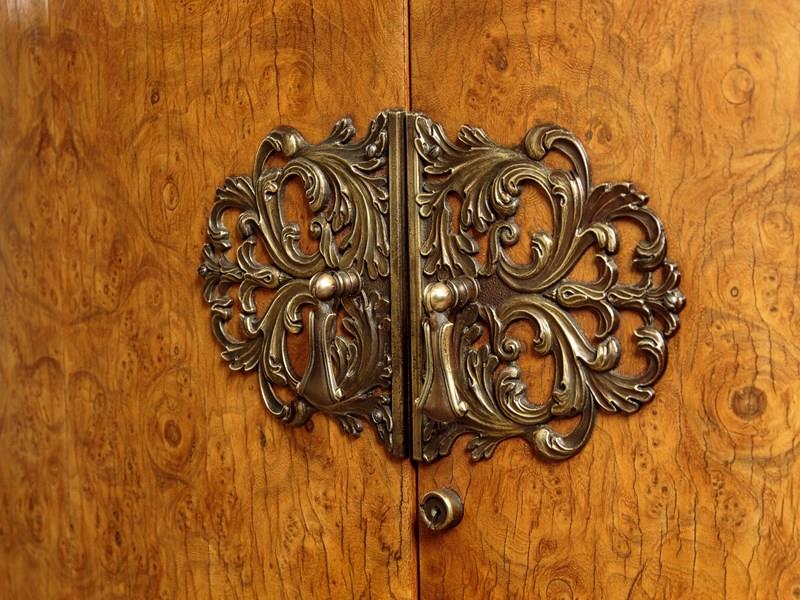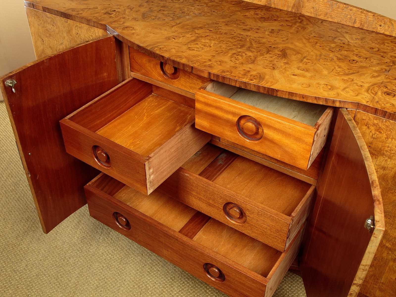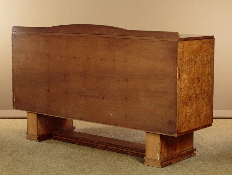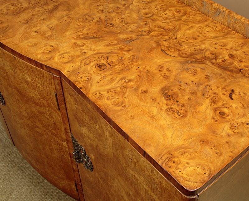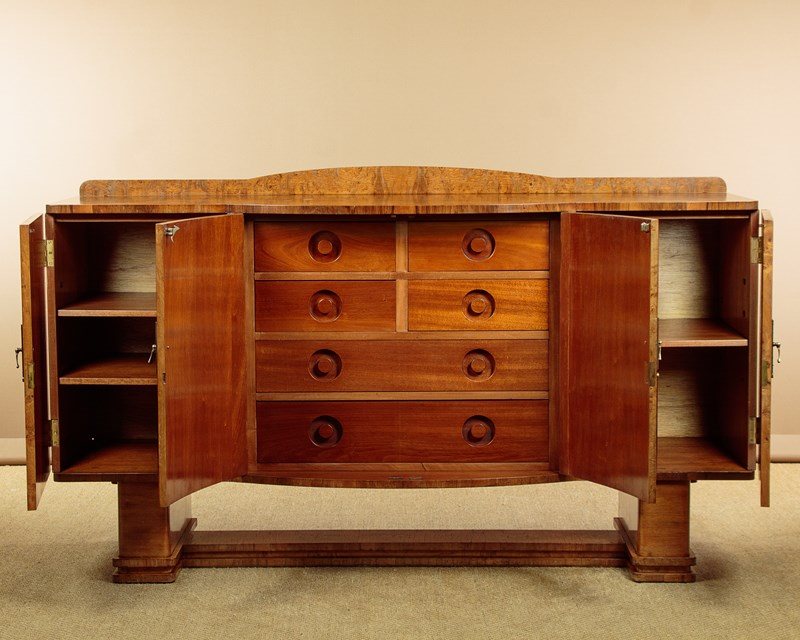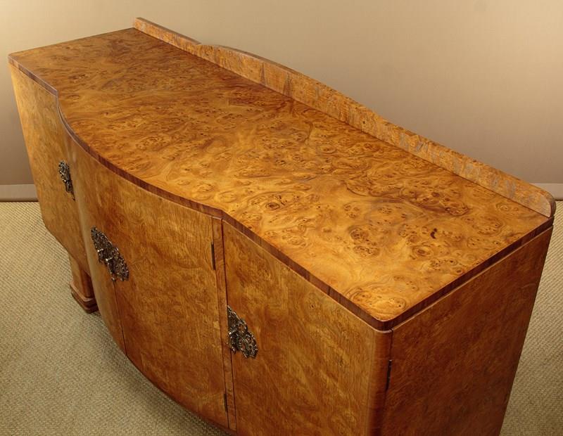 Handsome four door bow fronted Art Deco sideboard c.1930. Top with a low upstand along the back and crossbanded edges. Over a bow fronted centre opening to reveal a fitted interior of four small and two large drawers of graduated height, flanked with cupboard to either side, both fitted with adjustable shelves. Beautifully figured burr elm veneers arranged in a symmetrical pattern across the top, front and sides. Original brass handles with highly decorative pieced backplates. Streamlined modernist design to the base with stout column legs joined with a low stretcher, both veneered and crossbanded to match. Very good colour and condition, cleaned and waxed in our workshops.