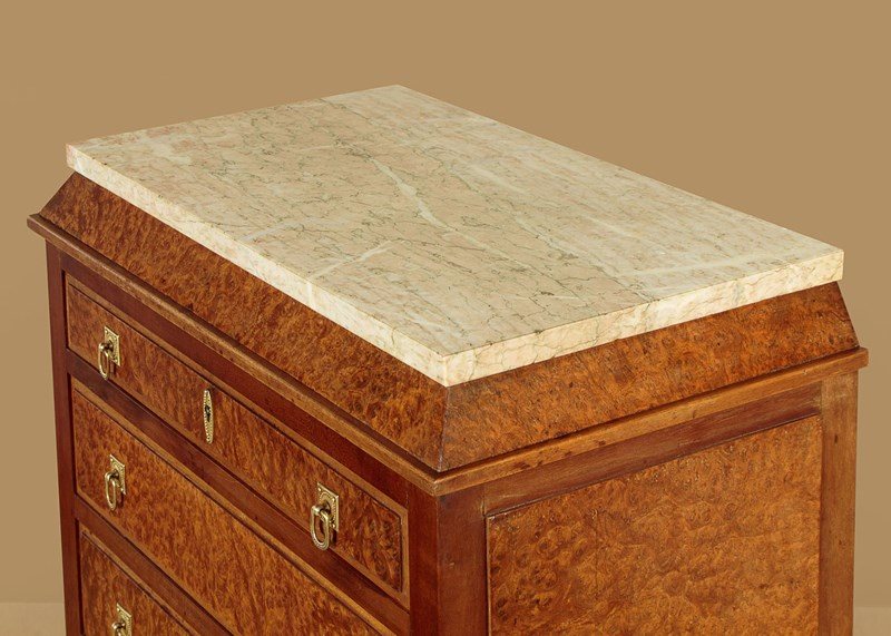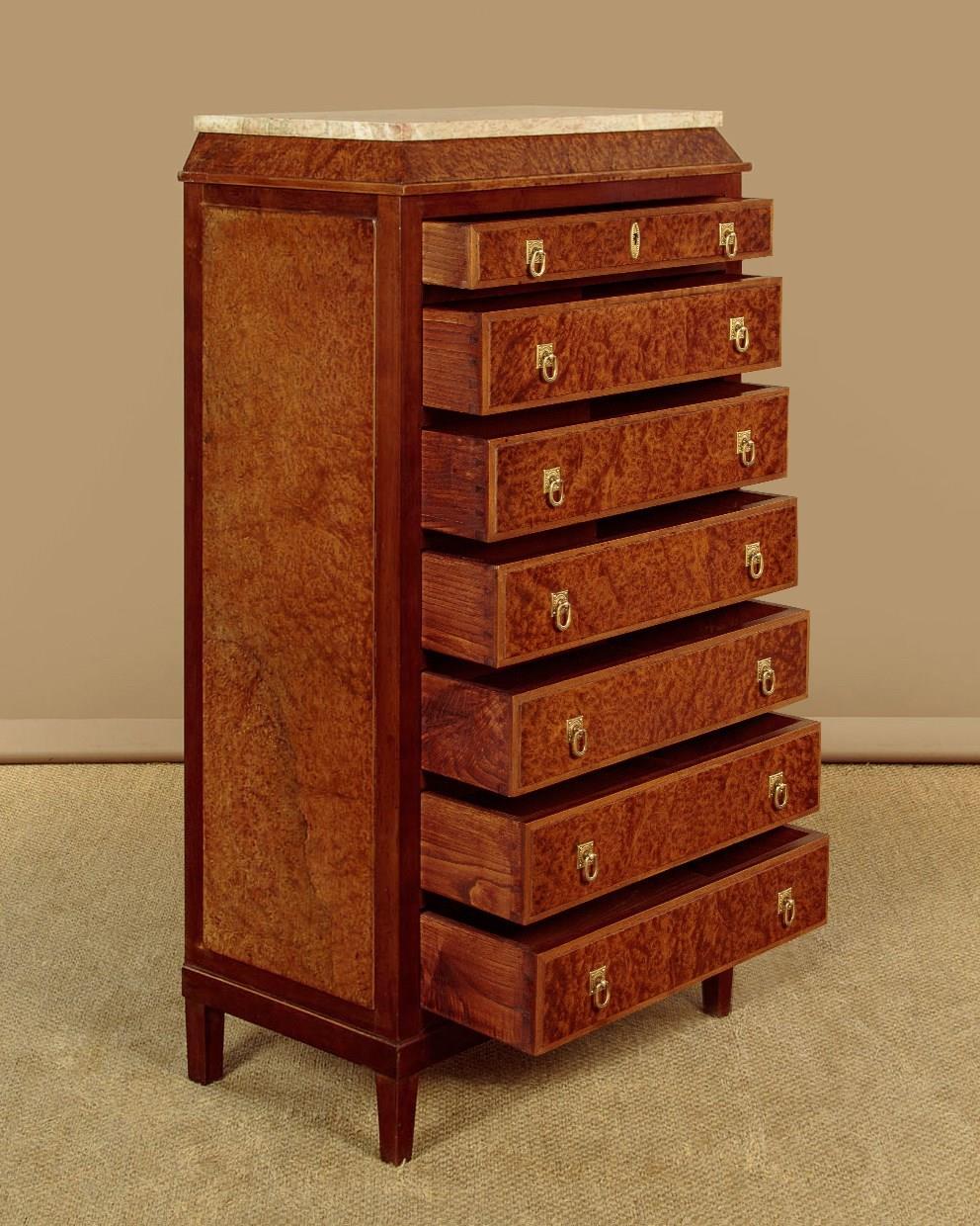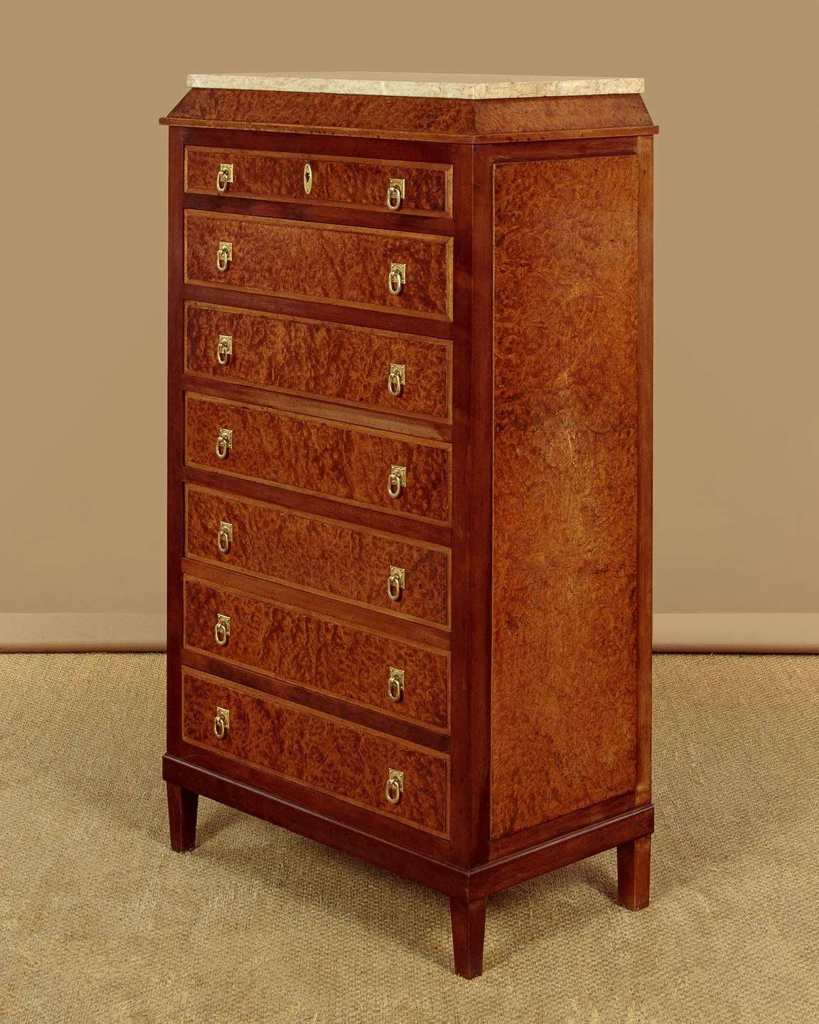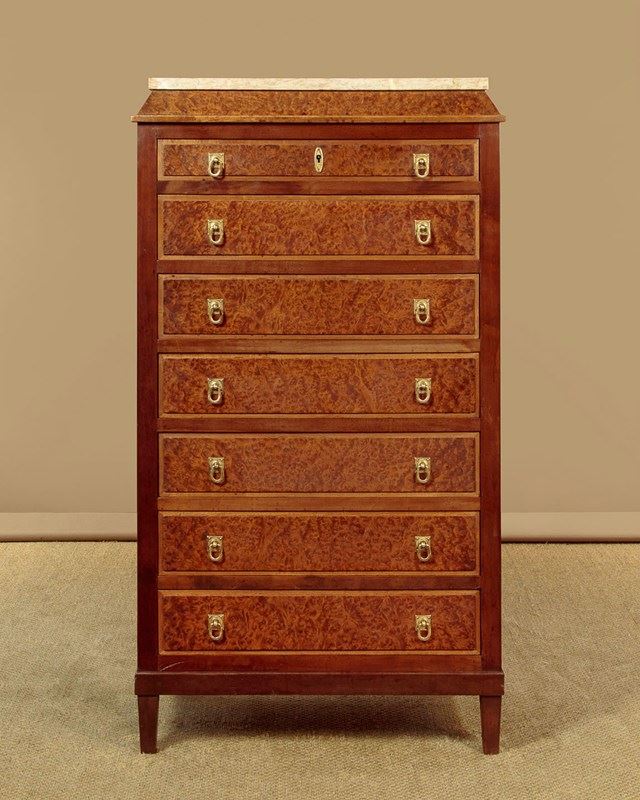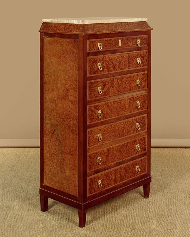 Unusual French burr walnut and marble top bank of drawers or semainier c.1930. Useful narrow dimensions, just 28½" wide. 26" x 15" pale marble top over seven drawers (width 23" , height 13"), the top drawer being slightly slimmer than the others. Highly figured burr walnut veneers to the chamfered frieze below the marble and to the drawer fronts which all retain their original gilded metal handles. Burr walnut panels at the sides. With a moulded plinth a short tapering legs. Mahogany carcass and oak drawer linings. Very good colour and condition, cleaned and waxed in our workshops.
