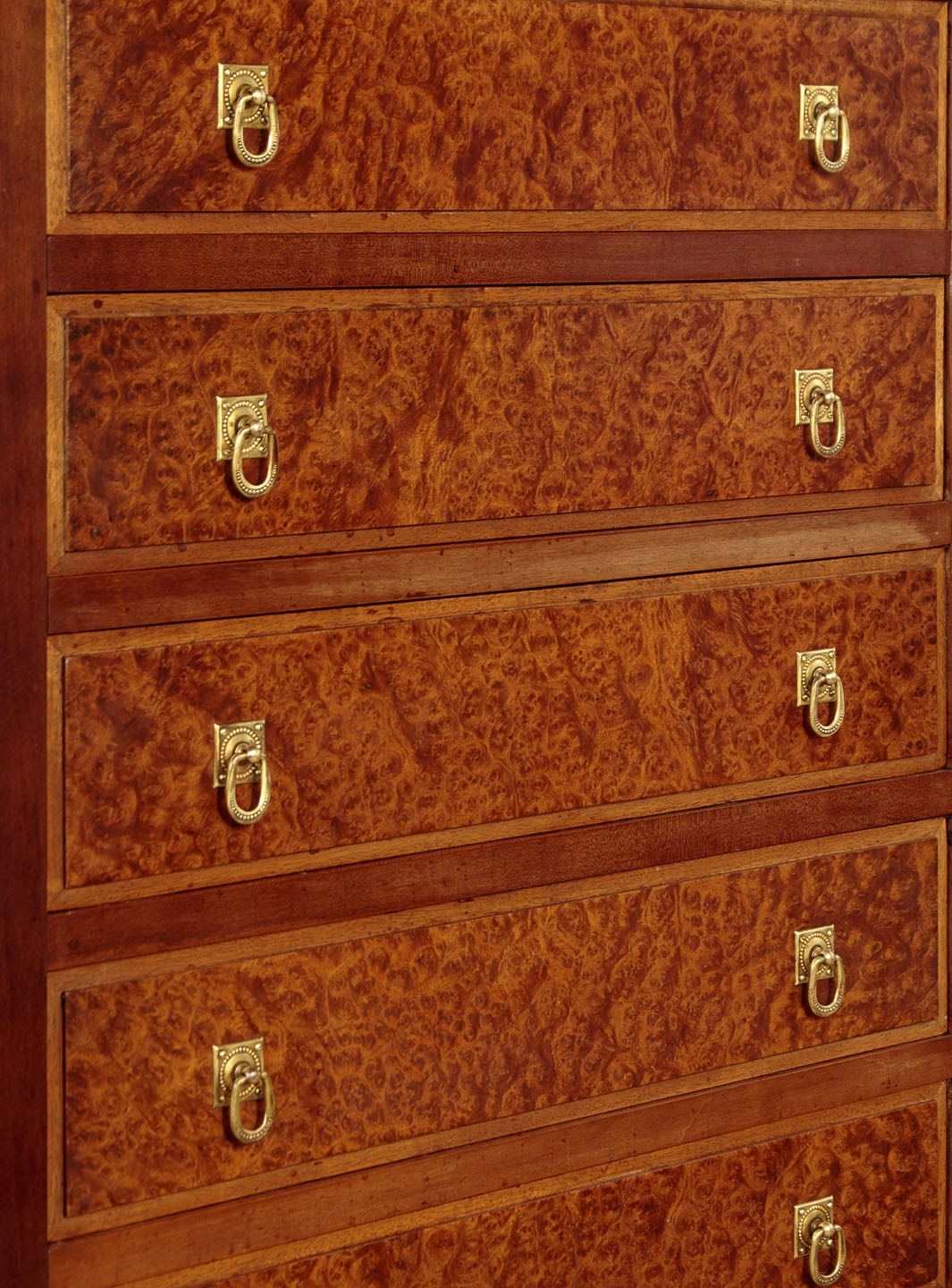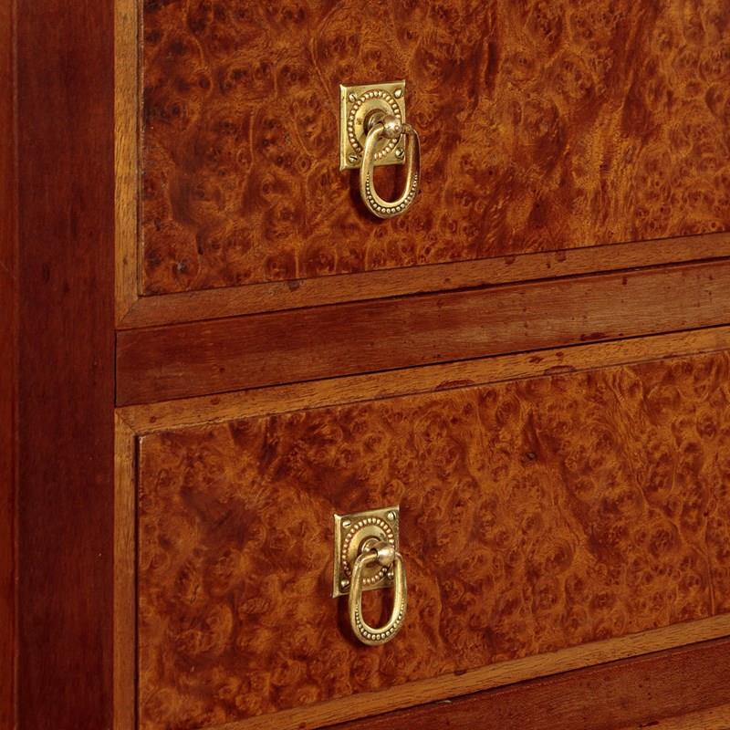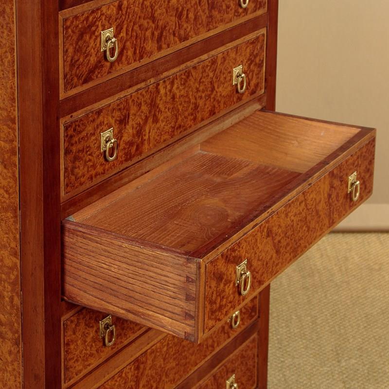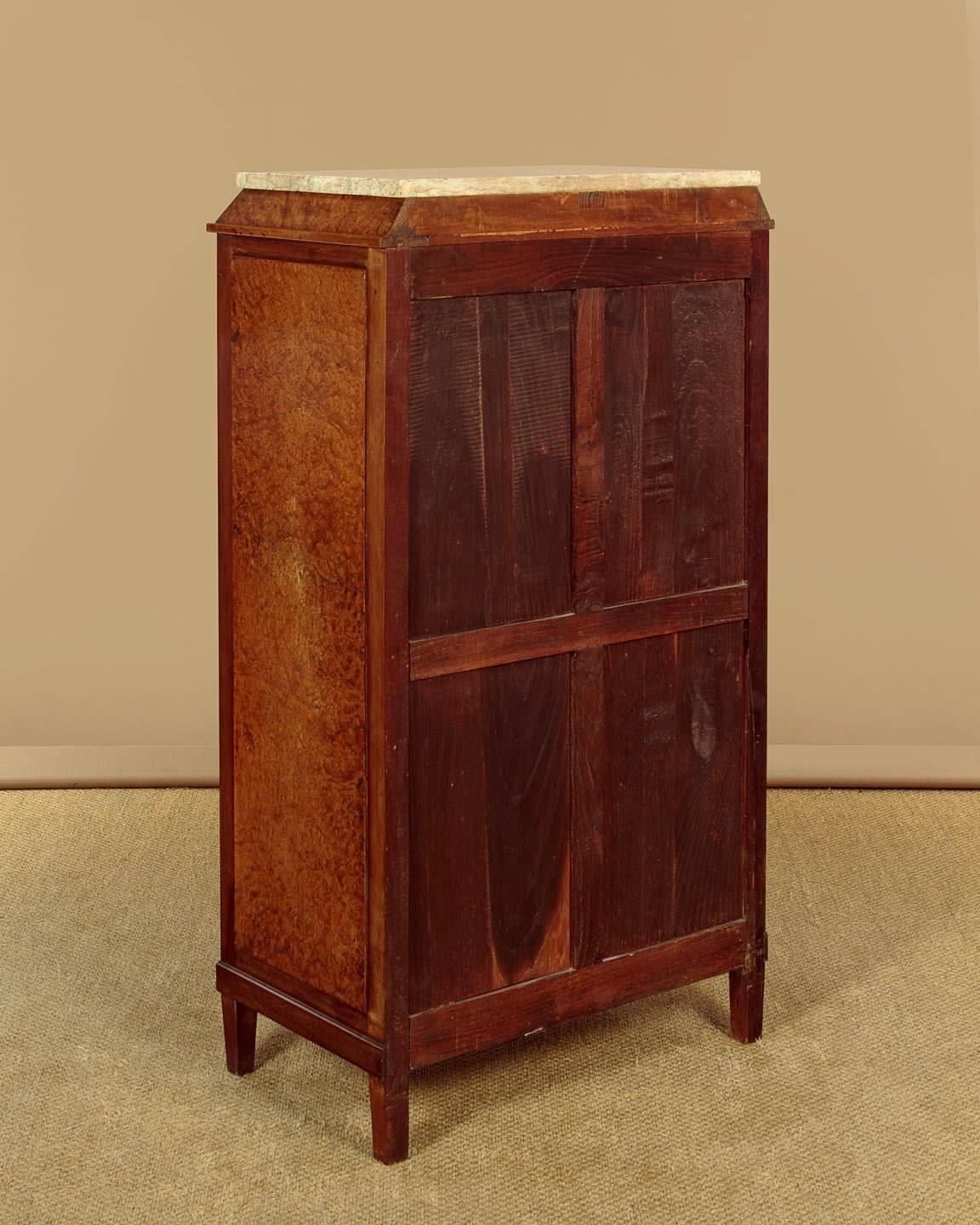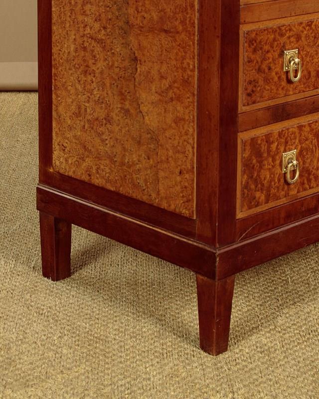 Unusual French burr walnut and marble top bank of drawers or semainier c.1930. Useful narrow dimensions, just 28½" wide. 26" x 15" pale marble top over seven drawers (width 23" , height 13"), the top drawer being slightly slimmer than the others. Highly figured burr walnut veneers to the chamfered frieze below the marble and to the drawer fronts which all retain their original gilded metal handles. Burr walnut panels at the sides. With a moulded plinth a short tapering legs. Mahogany carcass and oak drawer linings. Very good colour and condition, cleaned and waxed in our workshops.