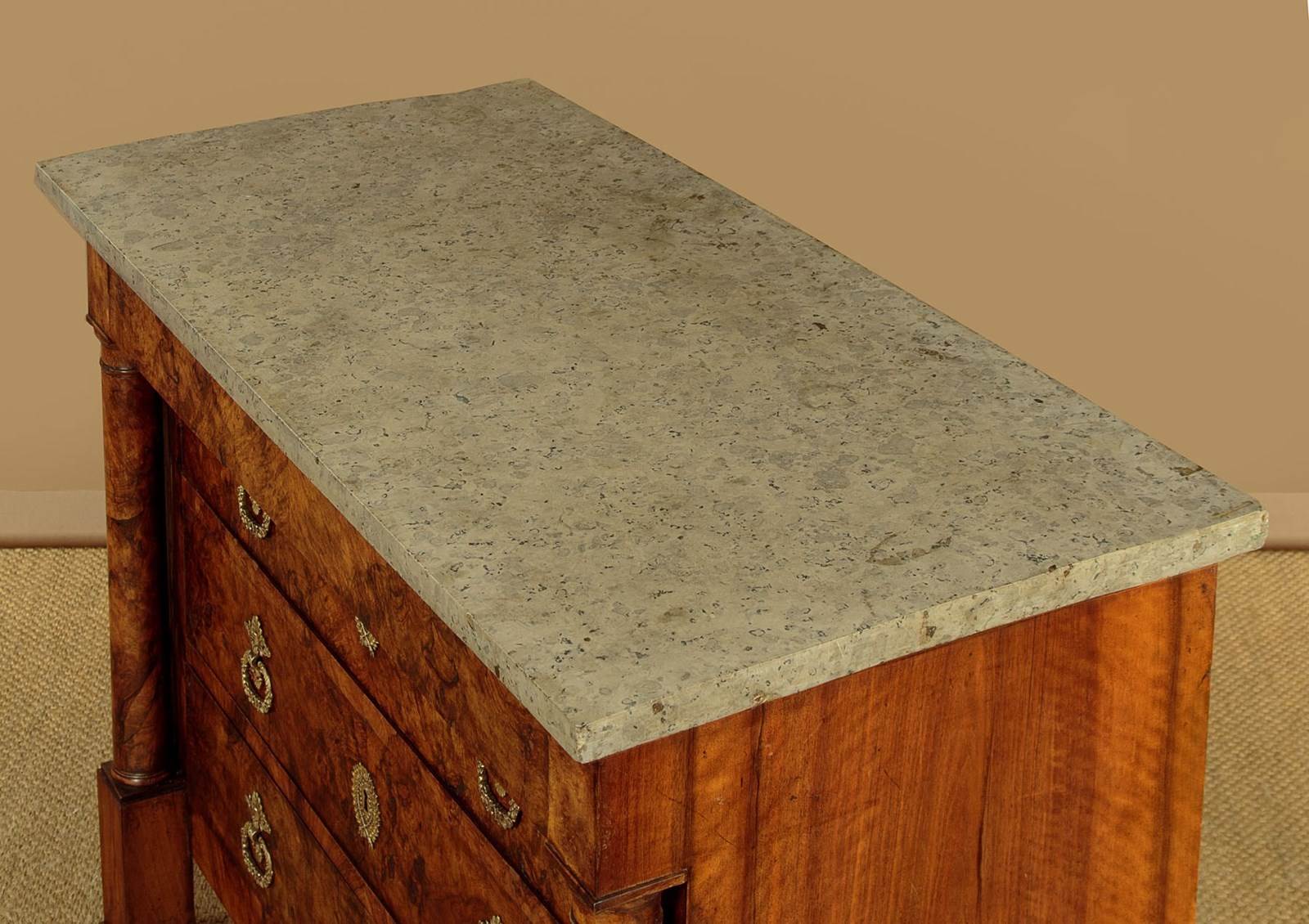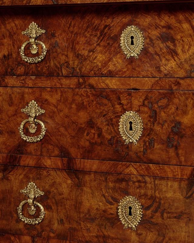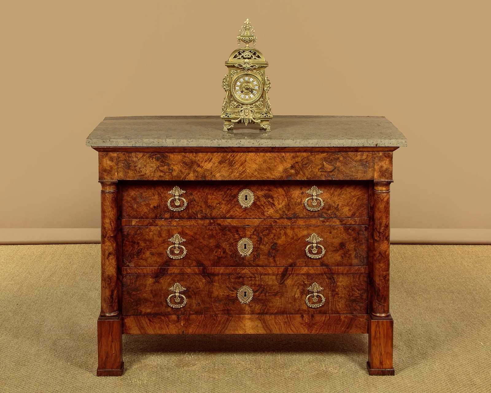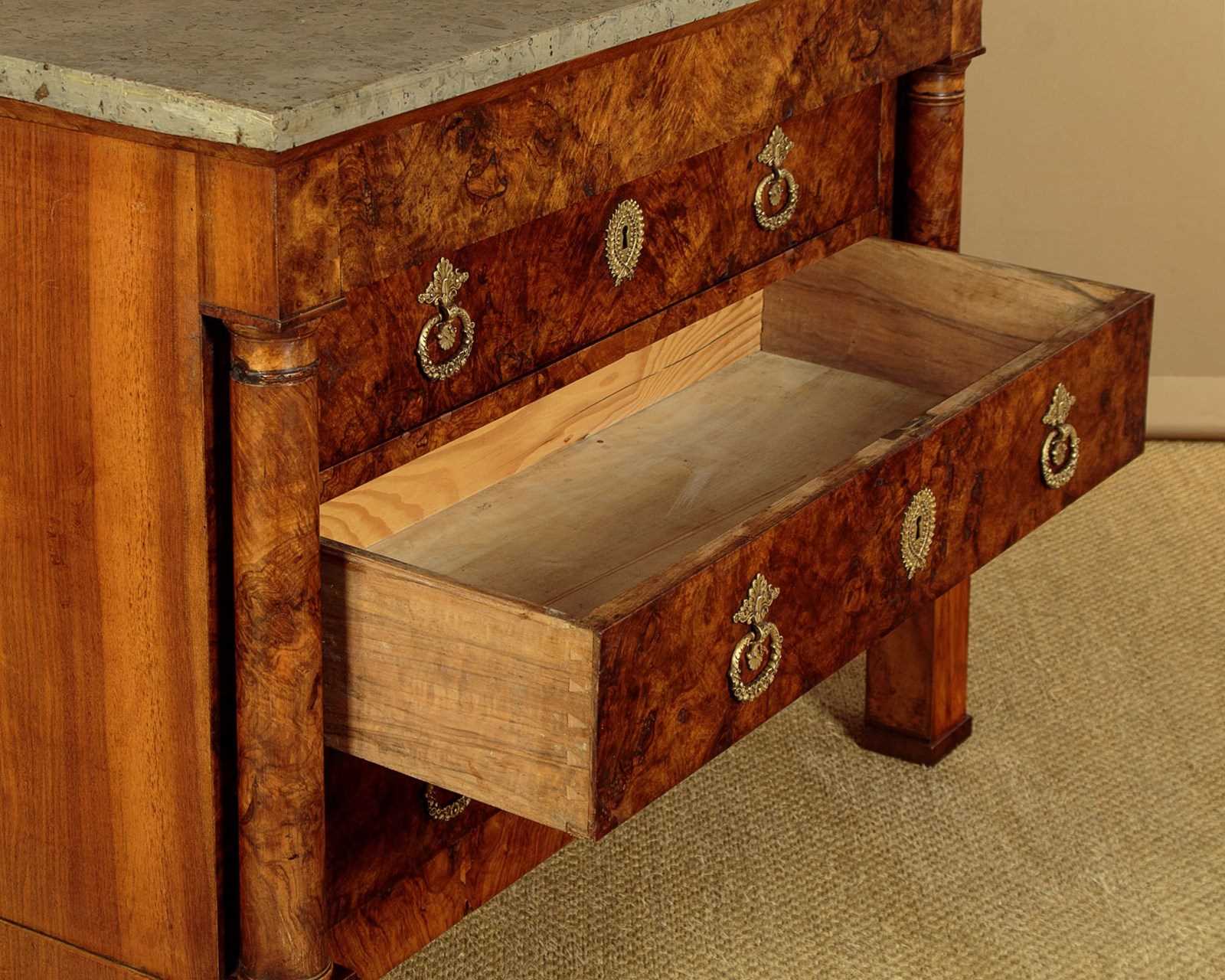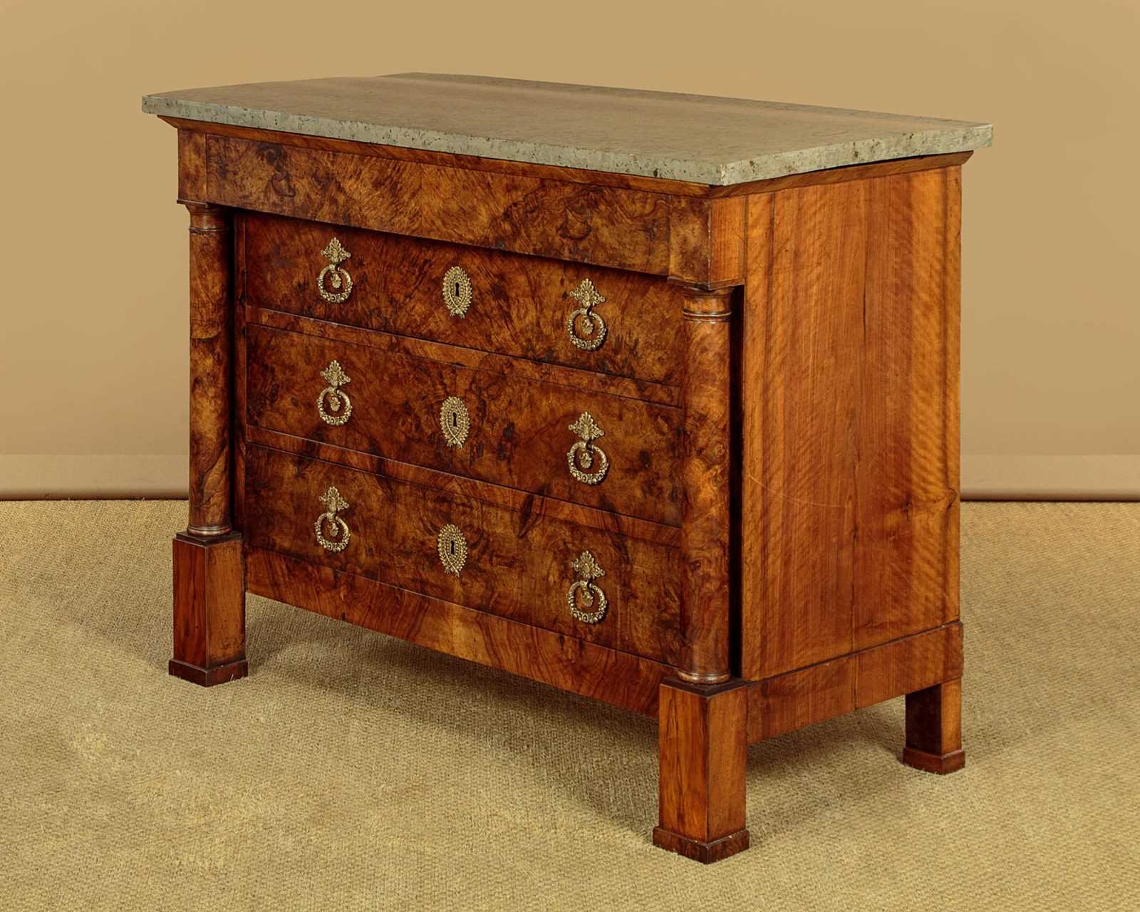 Handsome early 19th.c. French burr walnut commode or chest of drawers c.1830. Particularly attractive pale grey marble top over a chest of four drawers. With a slimmer overhanging top drawer over three larger drawers with large decorative brass handles and escutcheon plates. Symmetrically arranged burr walnut veneers to the drawer fronts. Flanked with a pair of columns standing separate from the cabinet, also burr walnut veneered. Solid mahogany sides. Raised on tall walnut veneered block feet. For some reason there is a slight wave to the stone top. Otherwise very good colour and condition. Cleaned and waxed in our workshops.