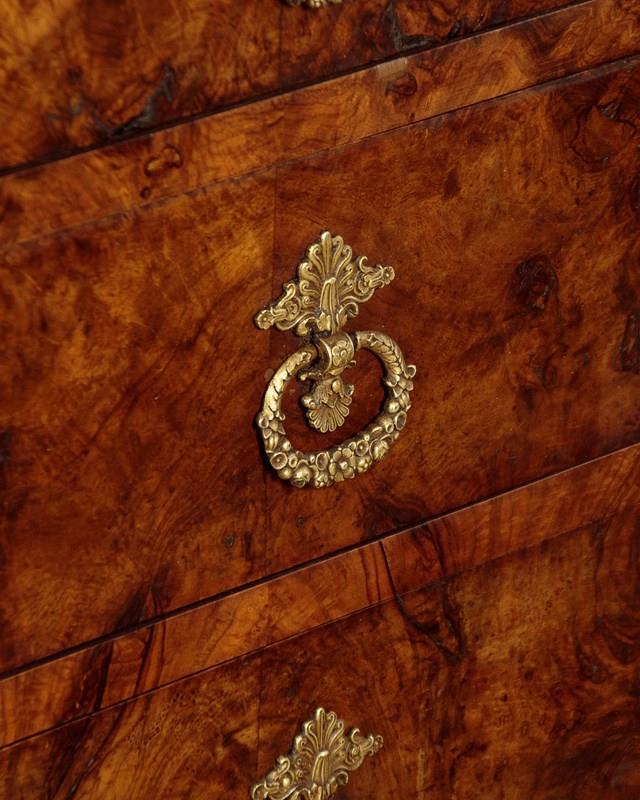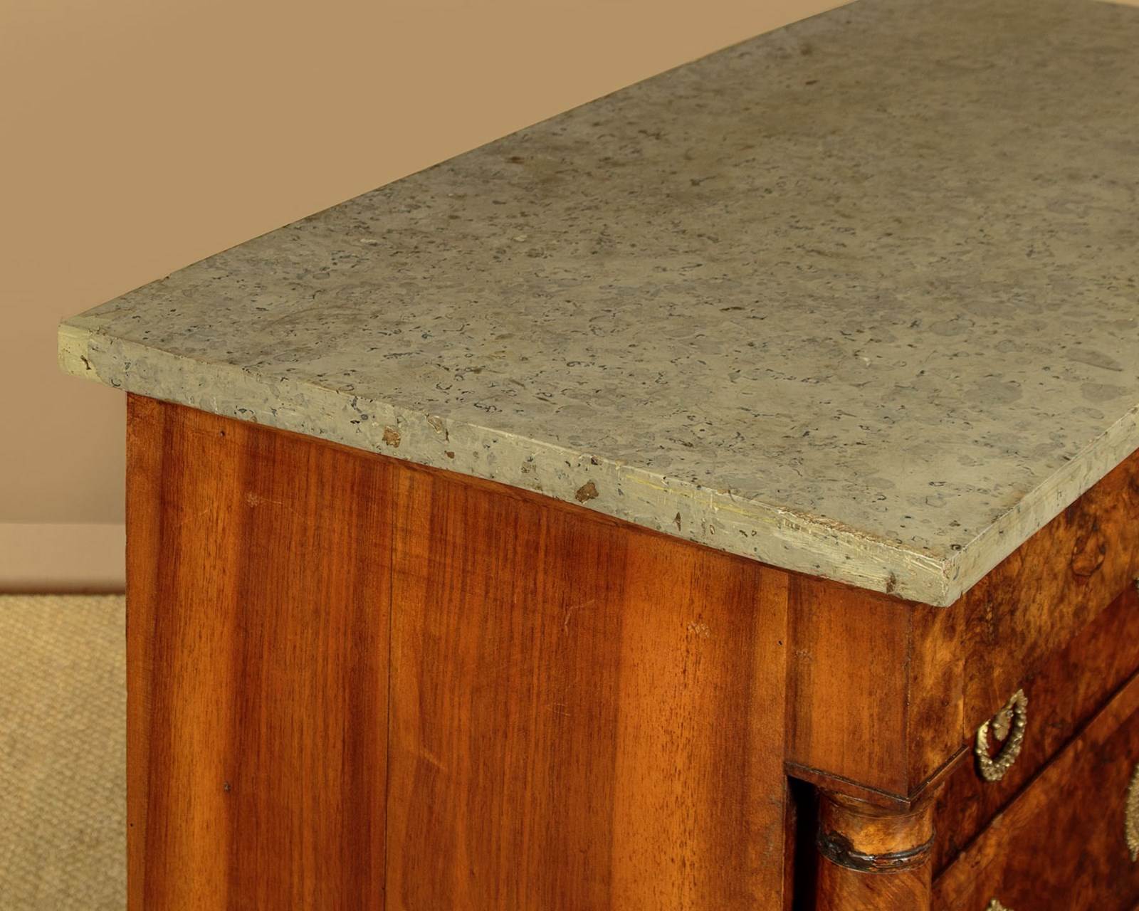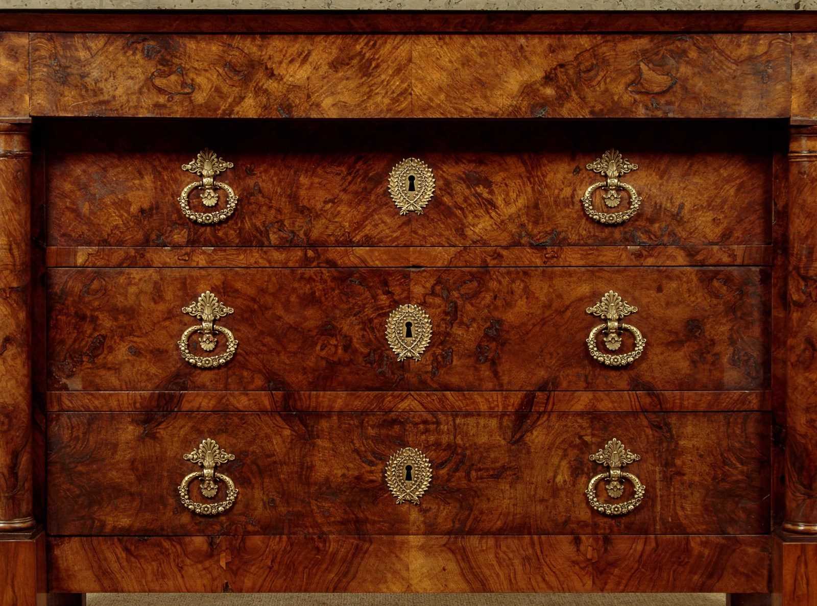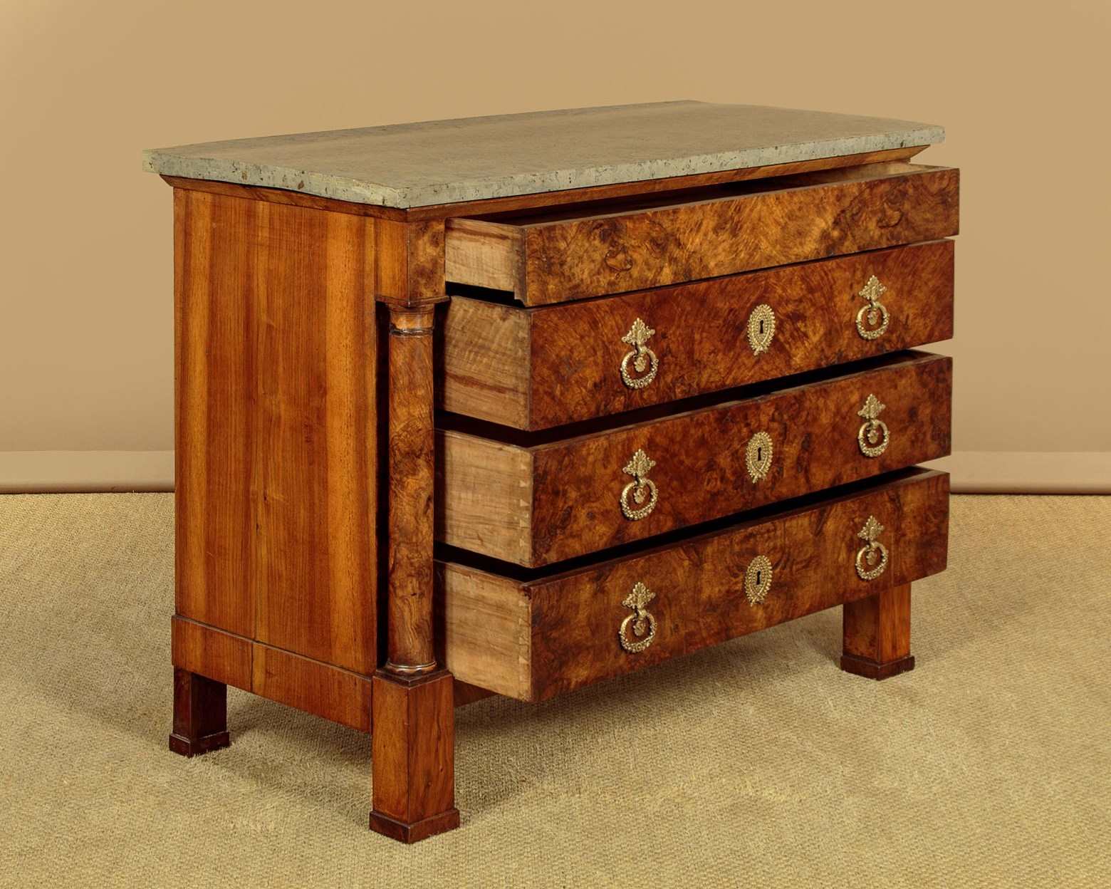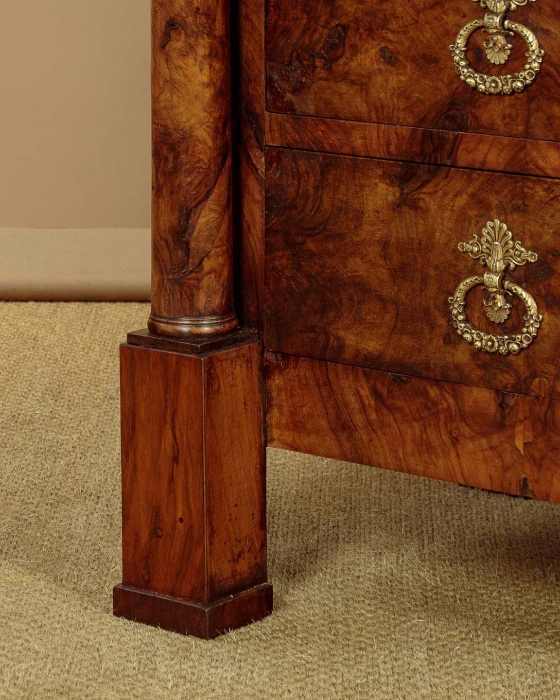 Handsome early 19th.c. French burr walnut commode or chest of drawers c.1830. Particularly attractive pale grey marble top over a chest of four drawers. With a slimmer overhanging top drawer over three larger drawers with large decorative brass handles and escutcheon plates. Symmetrically arranged burr walnut veneers to the drawer fronts. Flanked with a pair of columns standing separate from the cabinet, also burr walnut veneered. Solid mahogany sides. Raised on tall walnut veneered block feet. For some reason there is a slight wave to the stone top. Otherwise very good colour and condition. Cleaned and waxed in our workshops.