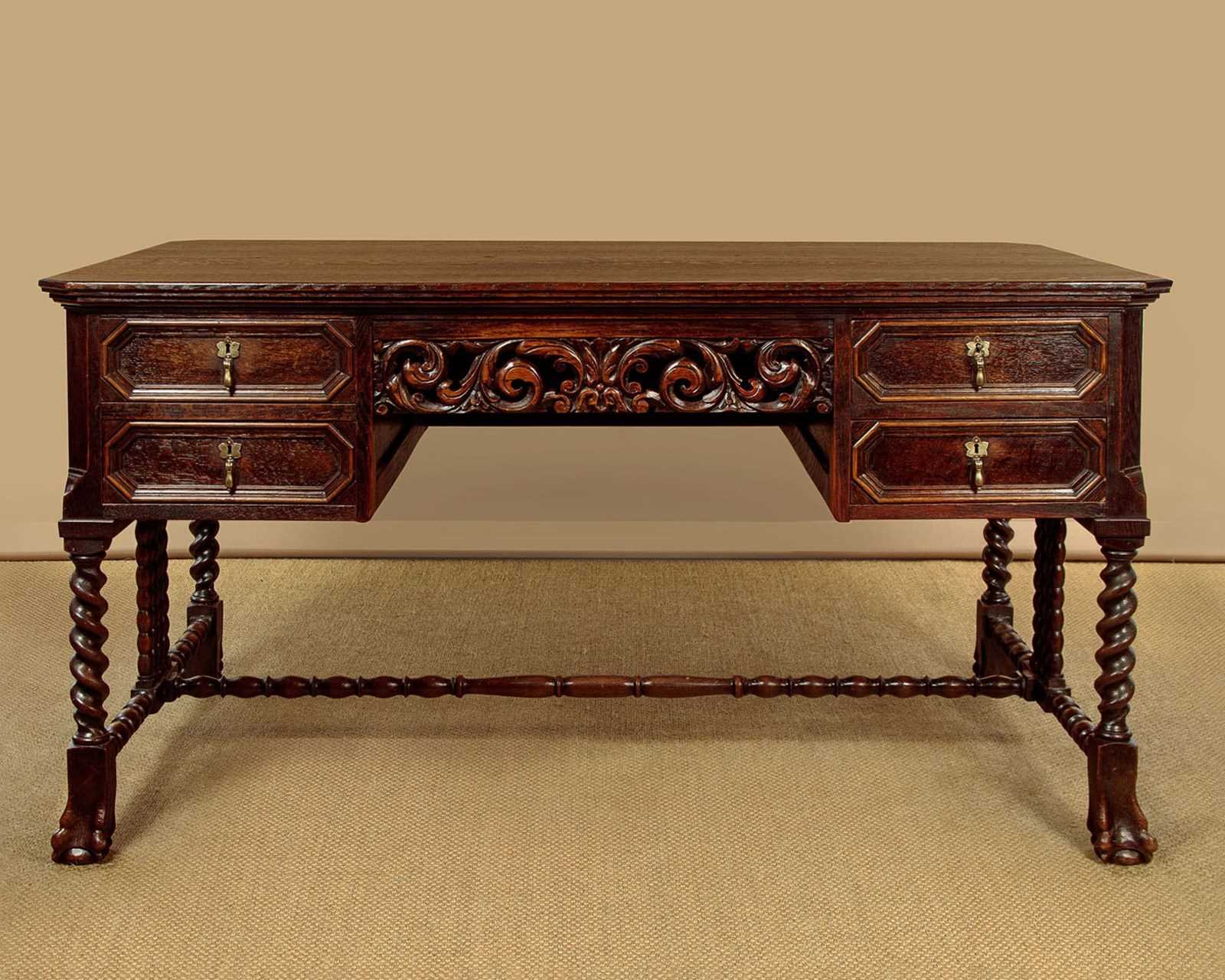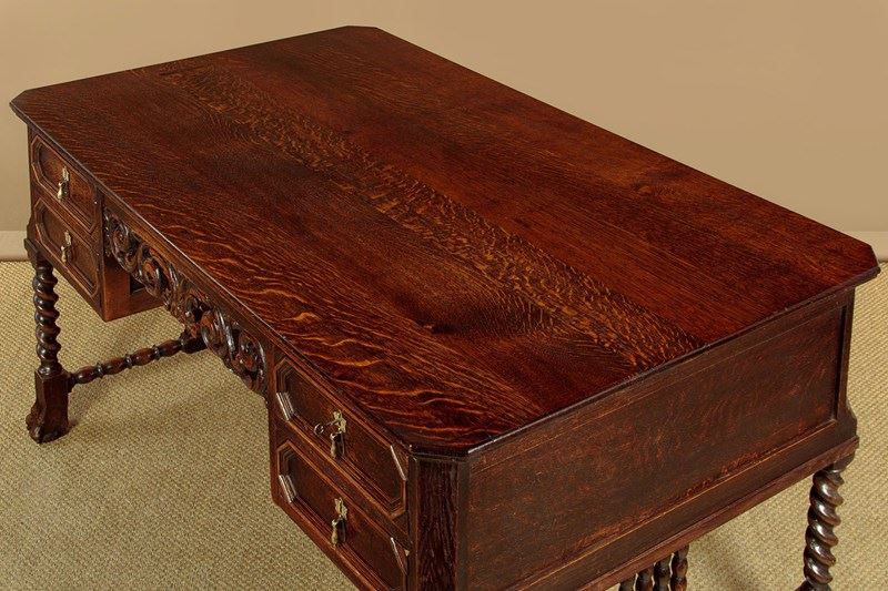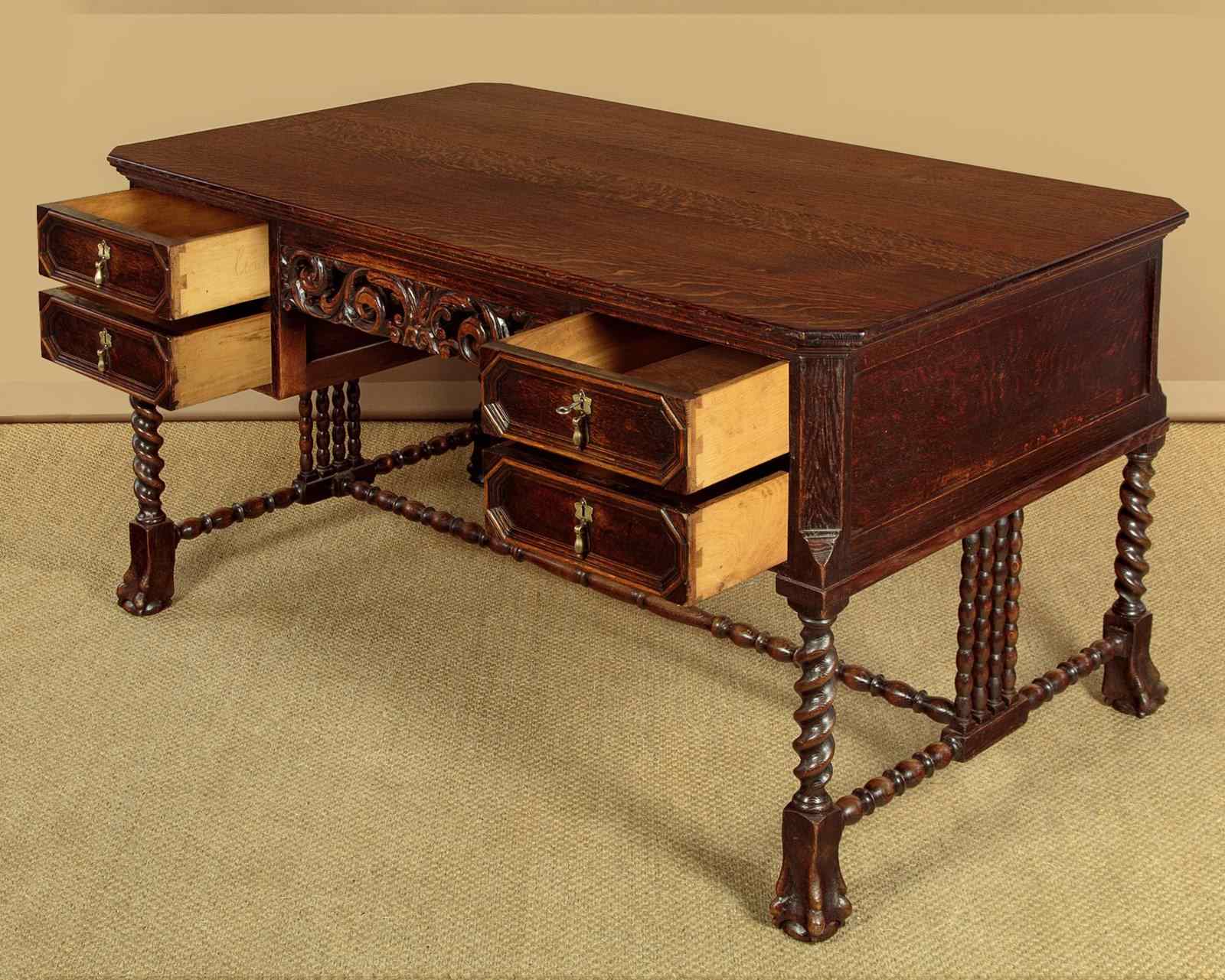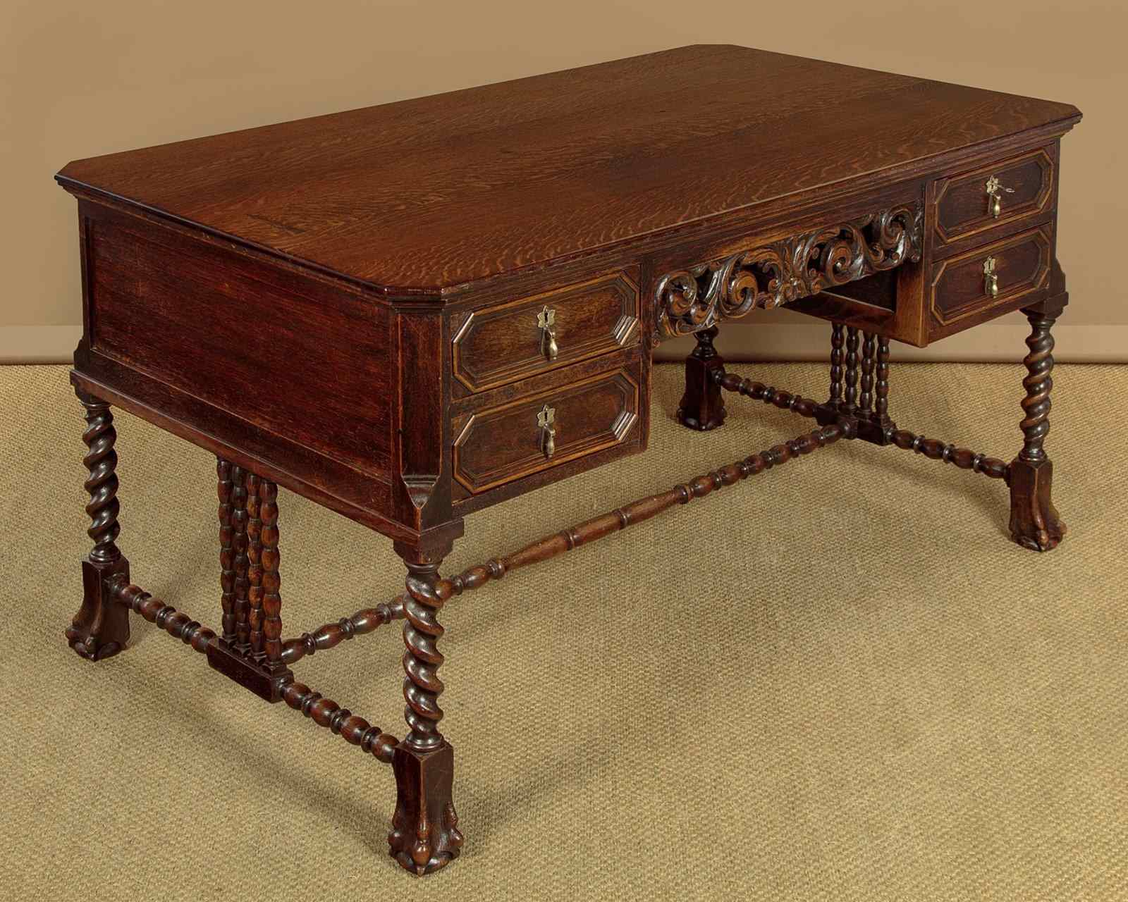 Good quality Carolean style oak desk or bureau plat c.1910. 59" x 34½" top in solid oak with canted corners and a moulded edge. Over four drawer arranged around a central kneehole with an unusual carved and pierced apron (knee height 24"). Moulded drawer fronts with brass drop handles. Solid oak drawer linings. Raised on twist carved legs front and rear with large ball and claw feet. Joined with unusual bobbin turned stretchers. Oak panelled sides and rear which has carved and moulded decoration. Excellent colour and condition, cleaned and waxed in our workshops. Key supplied to work the locks on all four drawers.
