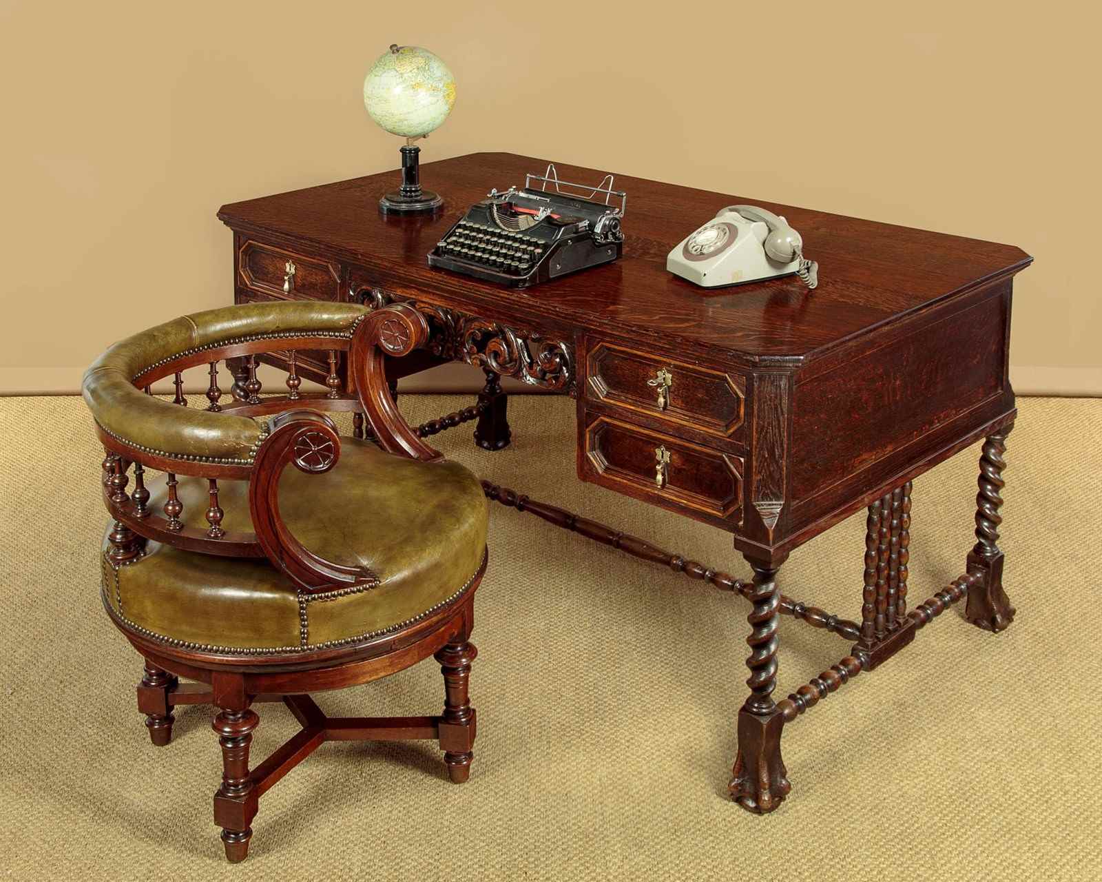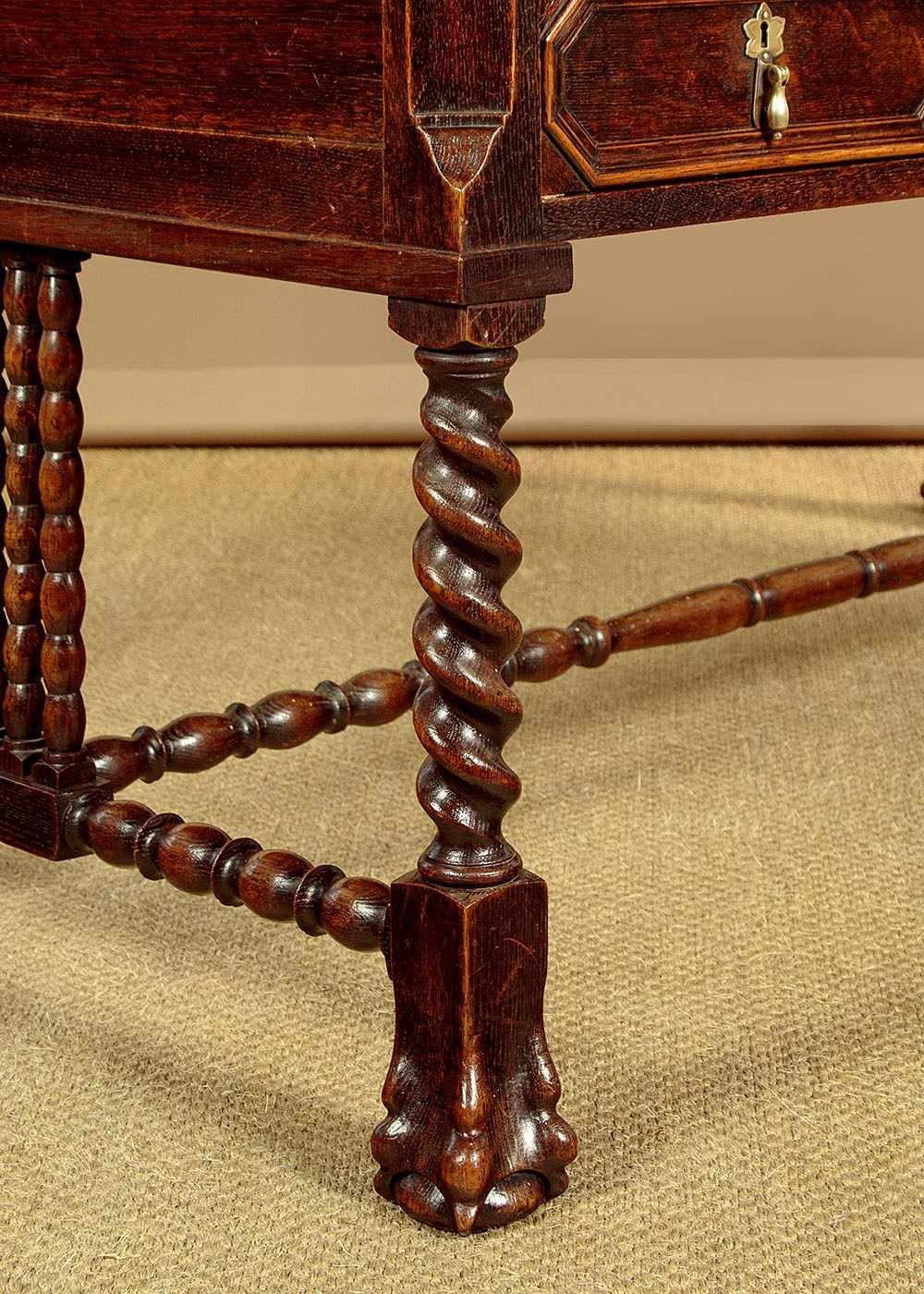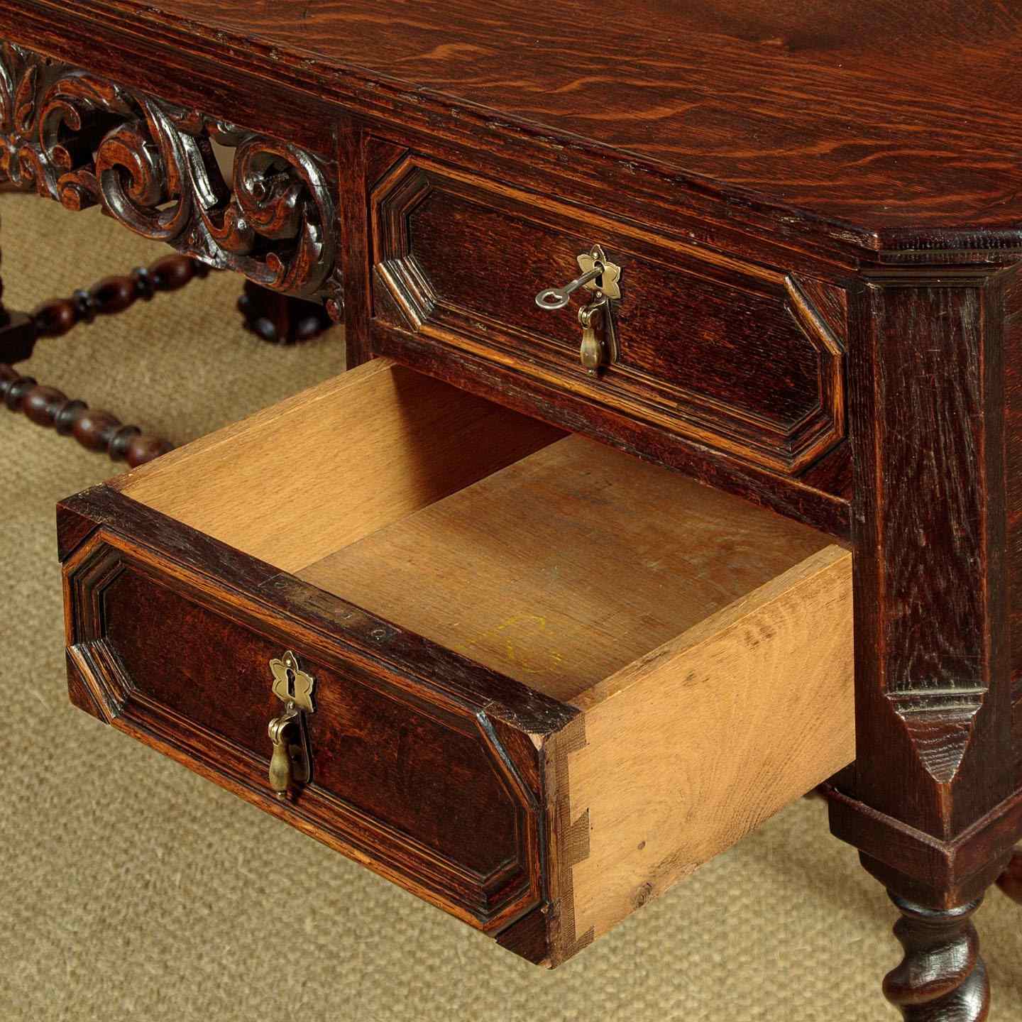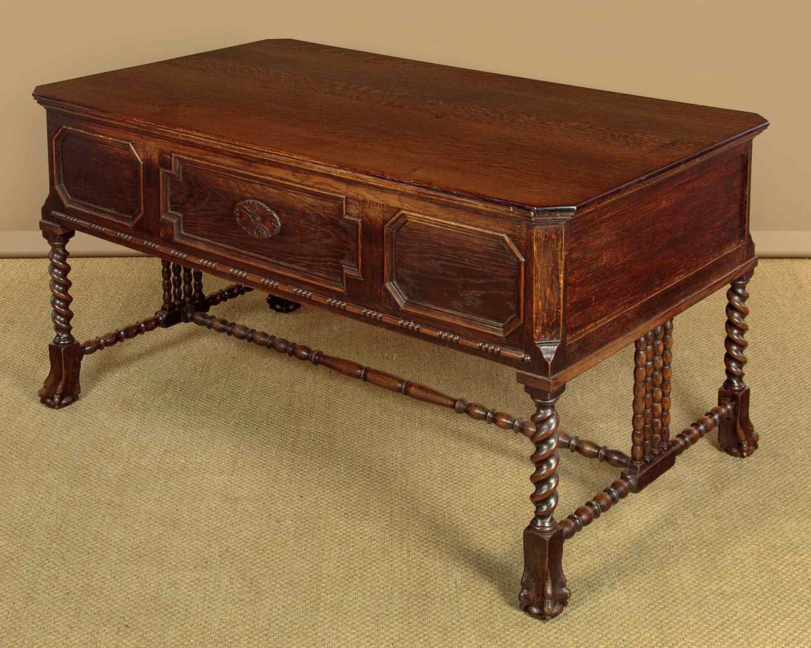 Good quality Carolean style oak desk or bureau plat c.1910. 59" x 34½" top in solid oak with canted corners and a moulded edge. Over four drawer arranged around a central kneehole with an unusual carved and pierced apron (knee height 24"). Moulded drawer fronts with brass drop handles. Solid oak drawer linings. Raised on twist carved legs front and rear with large ball and claw feet. Joined with unusual bobbin turned stretchers. Oak panelled sides and rear which has carved and moulded decoration. Excellent colour and condition, cleaned and waxed in our workshops. Key supplied to work the locks on all four drawers.